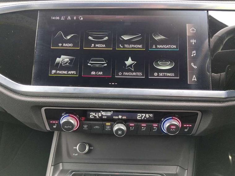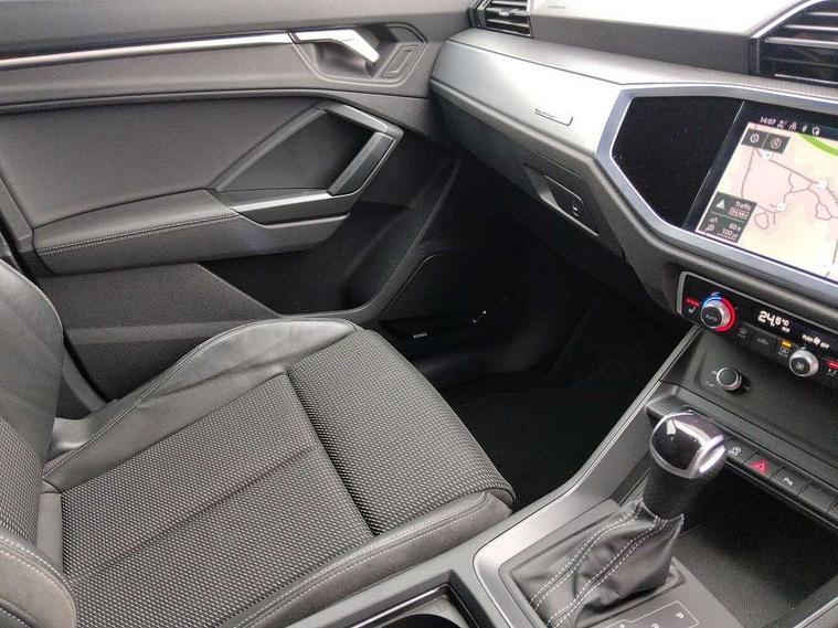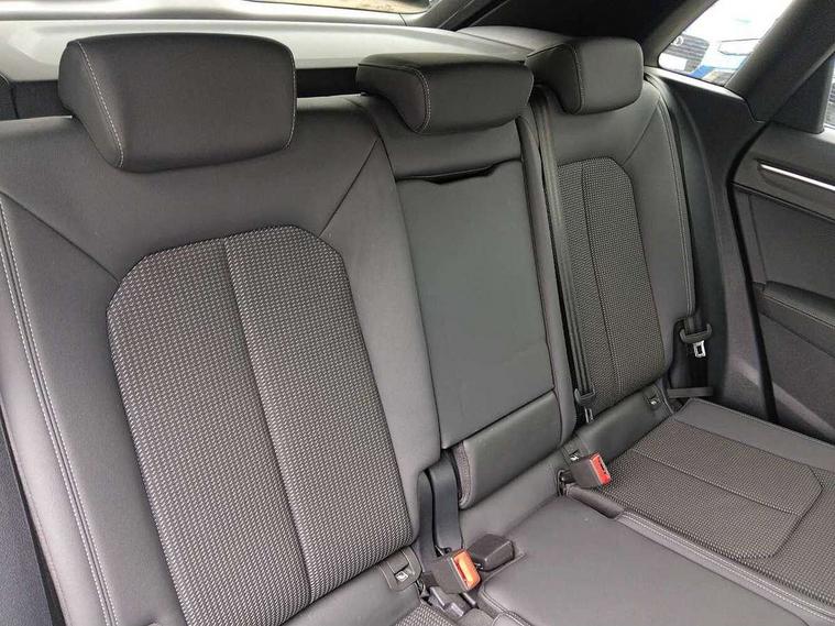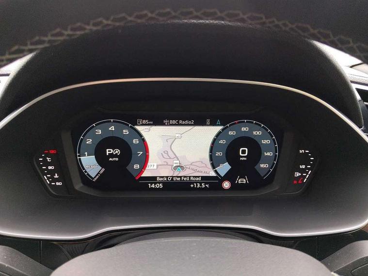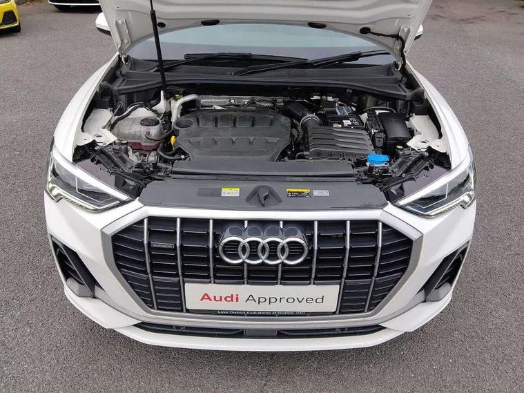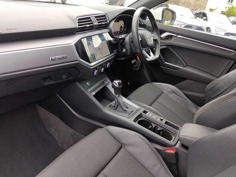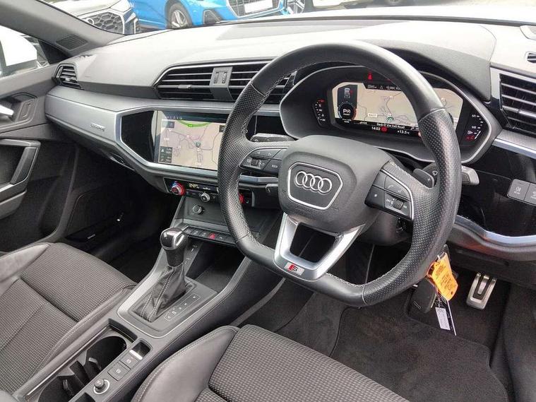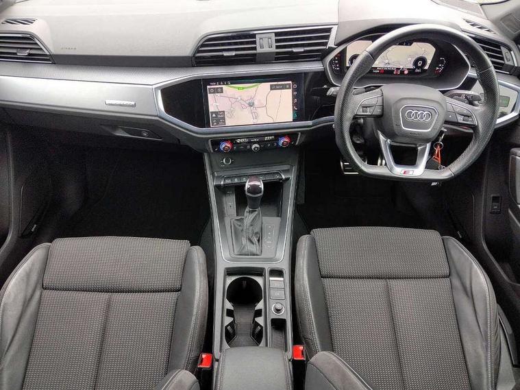 Amazon alexa Integration, Audi connect safety and service (e-call), Audi drive select, Audi lane departure warning, Audi Virtual Cockpit - 10.25" display, Bluetooth interface, Camera based traffic sign recognition, MMI Navigation Plus with high resolution 10.1 inch touchscreen colour display, Power operated tailgate, Progressive steering, Service interval indicator, Smartphone interface includes wireless Apple carplay/Android Auto, Start stop system with recuperation, Voice control system with natural language interaction, Sports suspension, 2 USB-C ports with charge and data functions, 6 passive loudspeakers, DAB digital radio module, Acoustic windscreen, Aluminium roof rails, Aluminium window trim, Auto dimming frameless rear view mirror, Body coloured bumpers, Electrically folding, adjustable and heated door mirrors with integrated LED side indicators and kerb view function for passenger side, Front and rear electric windows, Front fog lights, Front side air inlets in matt platinum grey, Front spoiler blade in matt platinum grey, Grille vertical bars in aluminium silver/Matt, High gloss black finish B and C pillars, LED headlights with LED daytime running lights, LED rear lights, LED third brake light, Privacy glass dark tinted rear and rear-side windows (from B-pillar backwards), Rain and light sensors, Rear diffuser strip in matt titanium black, Rear side wing doors, Rear wiper, S line badges on front wings, S Line front and rear bumpers, Side skirt insert in matt Platinium grey, Silver chrome grille surround, Tinted rear windows, Titanium black radiator grille, Variable front intermittent wipers, 12V socket in rear centre console, 3 seat bench in 2nd row, 40:20:40 folding with manual adjustment for 60:40 forwards/backwards position and backrest angle, Adjustable rear seat bench/backrest with centre armrest and cupholder, Black cloth headlining, Dual zone electronic climate control, Front and rear black floor mats with contrast stitching in rock grey, Front and rear headrests, Front and rear roof module including reading lights, Front centre armrest, Glove compartment lighting, Height and reach adjustable steering wheel, Illuminated door sill trims with S logo, ISOFIX child seat mounting for front passenger with airbag deactivation and outer rear seat including top tether attachment point for outer rear seats, Luggage compartment light, Manual front seats with height adjustment, Perforated leather gearknob, Single front passenger seat, Stainless steel luggage compartment sill finisher, Stainless steel pedals, Non smoking pack - Q3, 3x3 point rear seatbelts, 6 airbags - Driver, front passenger, curtain and side windows, Audi pre-sense front with pedestrain and cyclist recognition, Electrically operated child locks on rear doors, Electromechanical parking brake, Electronic stabilisation control including ABS, ASR and EDL, Front seatbelt reminder, Hill descent control, Hill hold assist, Pre sense basic, Seatbelt monitoring, Tyre pressure warning, Warning triangle and first aid kit, Anti theft alarm, Anti theft wheel bolts, Immobiliser, Remote central locking, Dark matt brushed aluminium inlay, Detail dashboard around MMI touch colour display in glass look, black with surround in aluminium look, Leatherette door armrest,
