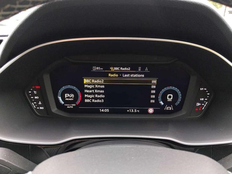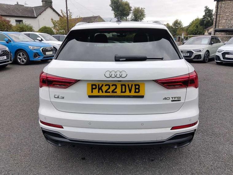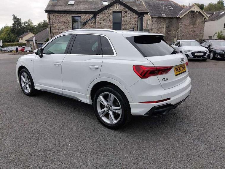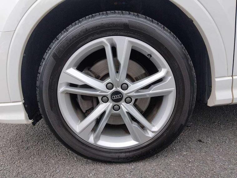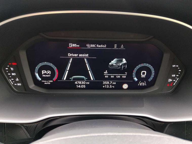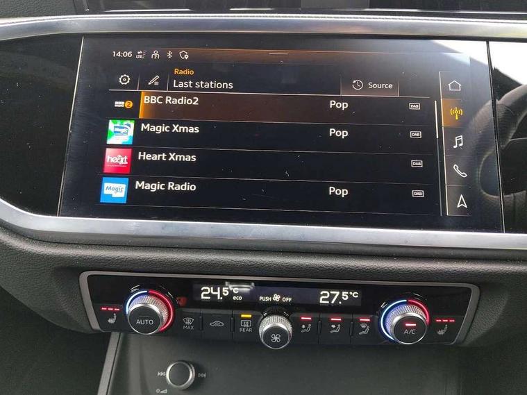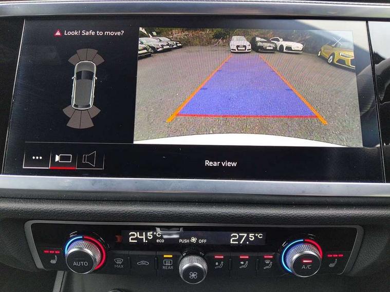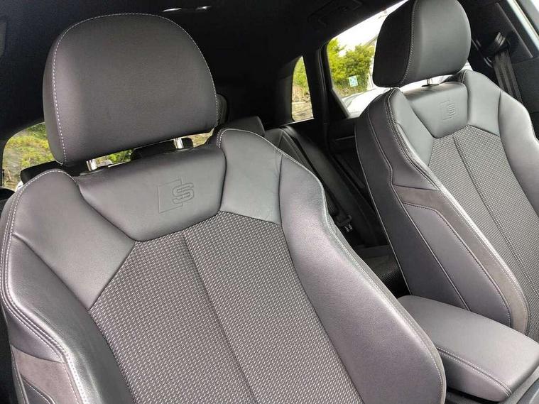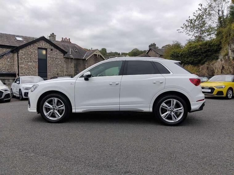 Amazon alexa Integration, Audi connect safety and service (e-call), Audi drive select, Audi lane departure warning, Audi Virtual Cockpit - 10.25" display, Bluetooth interface, Camera based traffic sign recognition, MMI Navigation Plus with high resolution 10.1 inch touchscreen colour display, Power operated tailgate, Progressive steering, Service interval indicator, Smartphone interface includes wireless Apple carplay/Android Auto, Start stop system with recuperation, Voice control system with natural language interaction, Sports suspension, 2 USB-C ports with charge and data functions, 6 passive loudspeakers, DAB digital radio module, Acoustic windscreen, Aluminium roof rails, Aluminium window trim, Auto dimming frameless rear view mirror, Body coloured bumpers, Electrically folding, adjustable and heated door mirrors with integrated LED side indicators and kerb view function for passenger side, Front and rear electric windows, Front fog lights, Front side air inlets in matt platinum grey, Front spoiler blade in matt platinum grey, Grille vertical bars in aluminium silver/Matt, High gloss black finish B and C pillars, LED headlights with LED daytime running lights, LED rear lights, LED third brake light, Privacy glass dark tinted rear and rear-side windows (from B-pillar backwards), Rain and light sensors, Rear diffuser strip in matt titanium black, Rear side wing doors, Rear wiper, S line badges on front wings, S Line front and rear bumpers, Side skirt insert in matt Platinium grey, Silver chrome grille surround, Tinted rear windows, Titanium black radiator grille, Variable front intermittent wipers, 12V socket in rear centre console, 3 seat bench in 2nd row, 40:20:40 folding with manual adjustment for 60:40 forwards/backwards position and backrest angle, Adjustable rear seat bench/backrest with centre armrest and cupholder, Black cloth headlining, Dual zone electronic climate control, Front and rear black floor mats with contrast stitching in rock grey, Front and rear headrests, Front and rear roof module including reading lights, Front centre armrest, Glove compartment lighting, Height and reach adjustable steering wheel, Illuminated door sill trims with S logo, ISOFIX child seat mounting for front passenger with airbag deactivation and outer rear seat including top tether attachment point for outer rear seats, Luggage compartment light, Manual front seats with height adjustment, Perforated leather gearknob, Single front passenger seat, Stainless steel luggage compartment sill finisher, Stainless steel pedals, Non smoking pack - Q3, 3x3 point rear seatbelts, 6 airbags - Driver, front passenger, curtain and side windows, Audi pre-sense front with pedestrain and cyclist recognition, Electrically operated child locks on rear doors, Electromechanical parking brake, Electronic stabilisation control including ABS, ASR and EDL, Front seatbelt reminder, Hill descent control, Hill hold assist, Pre sense basic, Seatbelt monitoring, Tyre pressure warning, Warning triangle and first aid kit, Anti theft alarm, Anti theft wheel bolts, Immobiliser, Remote central locking, Dark matt brushed aluminium inlay, Detail dashboard around MMI touch colour display in glass look, black with surround in aluminium look, Leatherette door armrest,