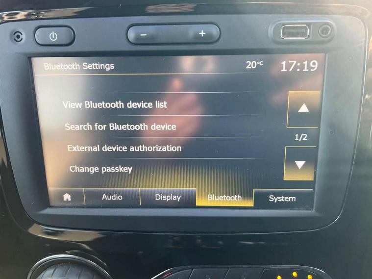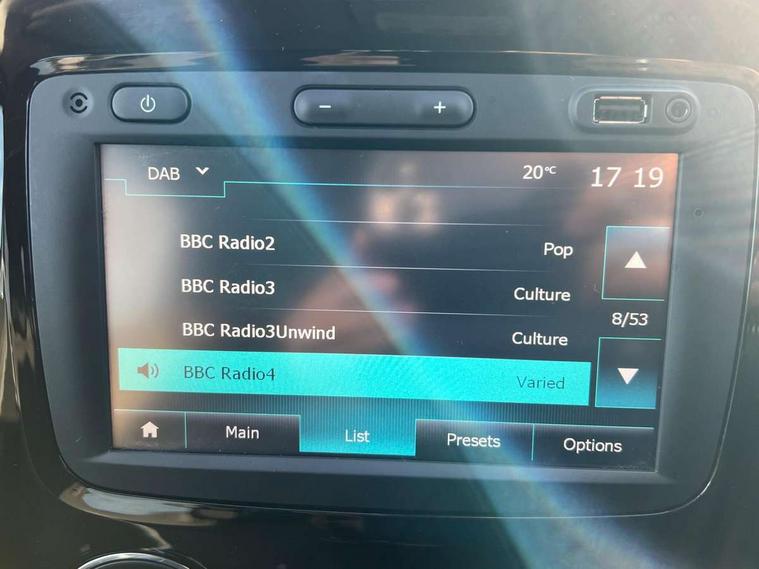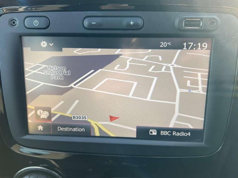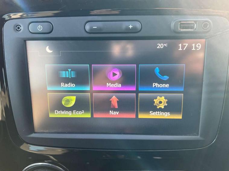 Bluetooth + USB, Cruise control + speed limiter, Rear parking sensor, Renault MediaNav with 7" touch screen and Navteq Nav 'n' Go Satellite Navigation, Trip computer, Variable PAS, Voice control system, 4x20W Arkamys radio, Auxiliary input socket, DAB Digital radio, Fingertip controls for audio system, Automatic headlights + automatic windscreen wipers, Body colour door handles, Body coloured bumpers, Chrome headlight surround, Chrome insert to side strips, Chrome trim on tailgate, Cornering front fog lights, Electric adjustable/heated/folding door mirrors, Electric front windows + one touch + anti-pinch, Electric rear windows, Extra tinted glass in rear windows, LED daytime running lights, Rear wiper, Variable intermittent front wash/wipe, 12V Accessory socket, 2 cupholders, 3 rear height adjustable headrests, 60/40 split rear seats, Climate control, Front seat backrest storage nets, Gloss black door armrest, Height adjustable driver's seat, Height adjustable front headrests, Height/reach adjust steering wheel, ISOFIX on front passenger and rear outer seats, Leather steering wheel and gear knob, Pollen filter, Removable storage between front and rear passenger, Reversible boot floor, Storage area on top of dashboard, Storage compartments in doors, Storage space under glovebox, Variable boot floor, 3 point seatbelts on all rear seats, ABS+EBA, Driver/Front Passenger airbags, ESC - Electronic Stability Control + traction control, Front passenger airbag deactivation, Front side airbags(head+thorax), Hill start assist, Rear door child safety locks, Seatbelt warning, Tyre pressure monitor, Deadlocking system, Keyless entry, RAID (Renault Anti-Intruder Device) with automatic door locking, Thatcham Cat 2 engine immobiliser, Space saver spare wheel,