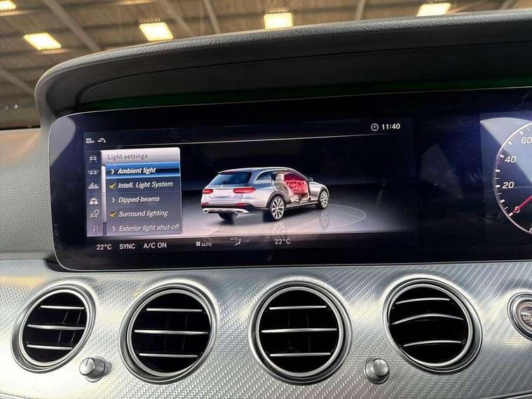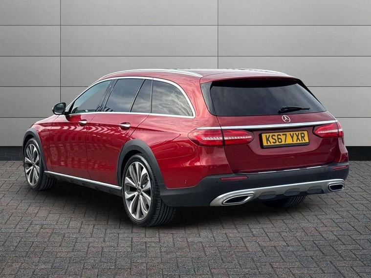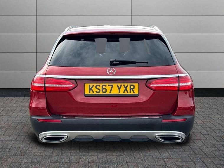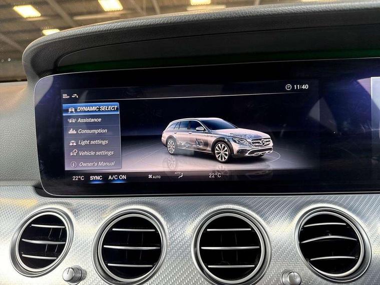 Active park assist with parktronic system, Analogue clock, Attention assist, Bluetooth interface for hands free telephone, Boot release from drivers seat, Brake wear warning light, COMAND HDD navigation with 12.3" central display, DYNAMIC SELECT with a choice of driving modes (ECO, Comfort, Sport, Sport+ and Individual), Easy-pack tailgate - Powered opening/closing automatically, External temperature gauge, Instrument cluster, Multi function trip computer, Park assist pilot with front and rear park assist, Remote boot release, Reversing camera, Service indicator (ASSYST), Smartphone integration with Apple CarPlay, Speed sensitive power steering, Touchpad with control wheel, AirMATIC suspension, Diesel particulate filter, Aerial integrated in rear window, Burmester surround sound system with 13 speakers, DAB Digital radio, Media interface, Steering wheel mounted audio controls, USB/aux input socket, Adaptive brake lights, All Terrain bodystyling, All Terrain front, rear apron and side skirts, Body colour bumpers, Body colour door handles, Body colour door mirrors, Chrome roof rails, Electric folding towbar, Electric front sliding and fixed rear panoramic glass sunroof, Electric front/rear windows with one touch/auto up/down, Electrically adjustable and heated door mirrors, Intelligent light system with LED headlights, active light function, cornering lights and adaptive high beam assist, LED daytime running lights, LED tail lights, Polished aluminium upper window surround, Polished aluminium waistline, Privacy glass (to rear of B post), Radiator grille with integral star and 2 louvres in matt iridium silver with chrome trim, Rain sensor windscreen wipers, Twin exhaust pipes, Underbody protection guards, 3 spoke nappa leather steering wheel, 40:20:40 split folding rear bench seat, Adjustable front head restraints, Adjustable rear head restraints, All Terrain floormats, Ambient lighting, Auto dual-zone climate control system, Auto Mercedes-Benz child seat recognition sensor, Bag hook in luggage compartment, Chrome door pins, Cupholders in centre console, Electric adjustable steering column, Electric seat adjustment, Electric seat back adjustment, Folding shopping box, Front and rear door pockets, Front centre armrest with storage compartment, Front door sills with Mercedes Benz lettering, Front seat back map pockets, Heated front seats, Interior rear light/integral reading lights, Isofix rear child seat fastenings, Leather upholstery, Lockable/illuminated air conditioned glovebox, Multi function steering wheel, Reversible boot mat, Sports pedals with stainless steel surfaces and rubber studs, Steering wheel gearshift paddles, Storage compartment with 12V socket in centre console, Storage net in luggage compartment, Sunglasses holder, Sunvisors with illuminated vanity mirrors, Interior lighting pack - E Class, Keyless Go comfort pack - E Class, Memory pack - E Class, Mirror pack - E Class, 3x3 point rear seatbelts, ABS, Active bonnet, Active brake assist, Adaptive brake system, Childproof rear door locks, Crash sensor, Driver and passenger side/thorax airbags, Driver/front passenger airbag, Drivers knee airbag, Electronic parking brake, ESP with ASR, Front brake callipers with Mercedes Benz lettering, Hill hold assist, Hill start assist, Pre-Safe anticipatory safety system, Seat occupancy sensor, Seatbelt warning, Tyre pressure monitoring system, Warning triangle and first aid kit, Window airbags, Alarm system/interior protection/immobiliser, Automatic door locking, Chrome surround electric key, Remote central locking, High gloss black centre console, 20" 5 twin spoke alloy wheels painted in tremolite grey with burnished finish, Tirefit sealant with electric air pump,