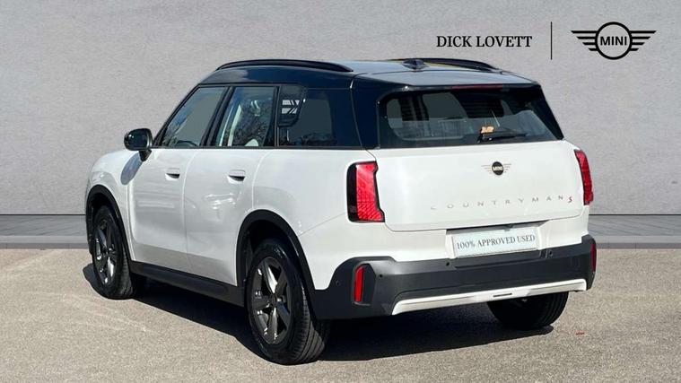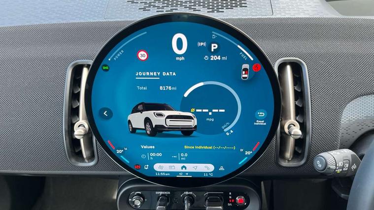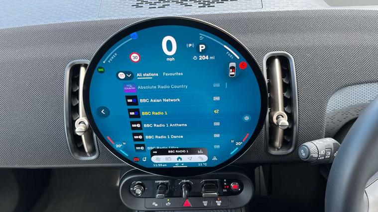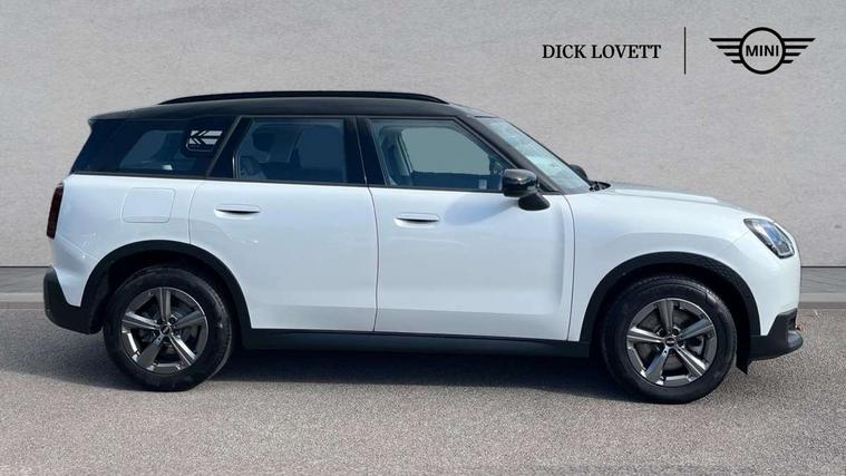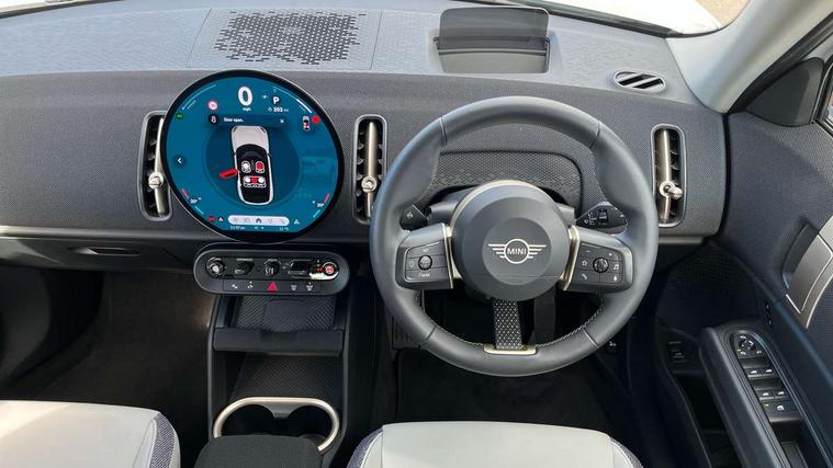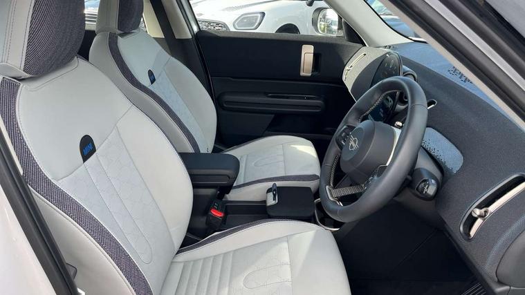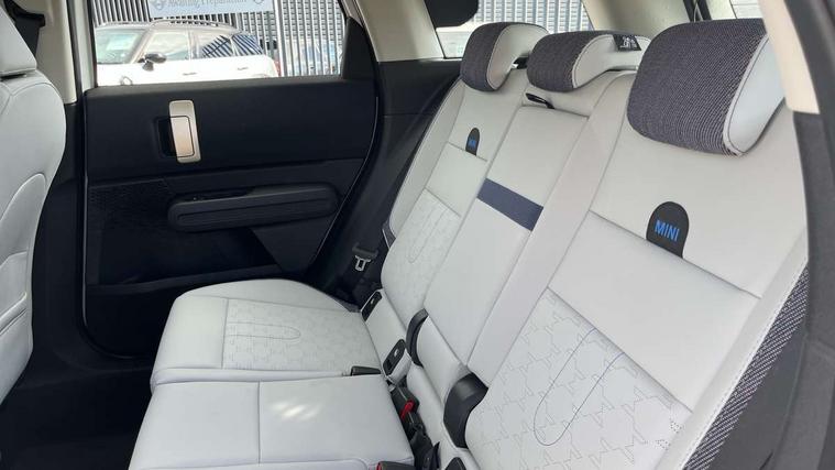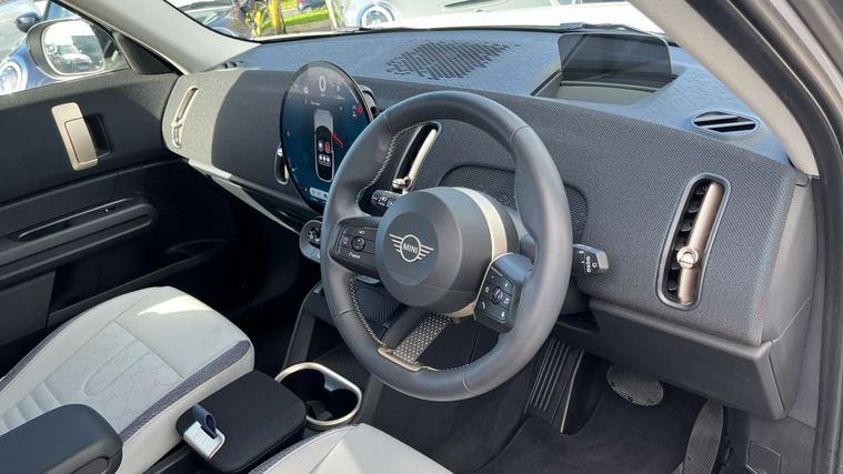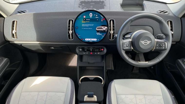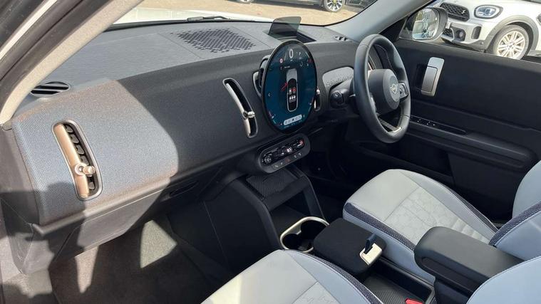 Bluetooth connection, Circular OLED Screen, Compatible mobile phone bluetooth with audio streaming, Cruise Control (DCC), Digital dashboard display, Driving assistant, Driving Assistant Plus Preparation, E-call, Electro-mechanical speed dependant steering assistance, MINI Experience Modes, MINI Head up display, Mini navigation system, MINI TeleServices, Parking assistant in camera and ultrasound based assistance system, rear view camera, parking aid and distance control, Auto transmission with Paddles, Larger capacity fuel tank, 6 speakers, DAB Digital radio, Personal eSim, Auto tailgate, Electric adjustable heated door mirrors, Front and rear electric windows, Heated rear window, High beam assistant, Interior rear-view mirror with automatic anti-dazzle function, LED daytime running lights, LED headlights with extended contents including Adaptable light signatures, LED rear lights, LED third brake light, Rain sensor with auto headlights, Rear side wing doors, Rear window wiper, Roof rails, 3 Seat sliding rear bench in 2nd row, 60/40 split rear bench seat, Auto air conditioning, Driver and front passenger seat heating, Floor mats, Front armrest, Front headrests, Heated steering wheel, Height and length steering column adjustment, Light headliner, Luggage compartment separating net, Rear headrests, Seat adjustment for rear seats, Single front passenger seat, Sport Vescin Steering Wheel, Sunvisors with vanity mirrors, Vescin/Cloth upholstery, Wireless charging tray, Interior and exterior mirror package - Mini Countryman, 3x3 point rear seat belts, 6 Airbags - front, side, head and seat belt tensioners, ABS, DSC - Dynamic Stability Control, Electronic handbrake, Electronic Stability Programme (ESP), Front ISOFIX (iSize), Hill descent control, Hill hold assist, Hill start assist, Manual rear child locks, Traction control, Tyre pressure monitoring system, Warning triangle, Alarm system with tilt sensor, monitoring doors, bonnet interior and tailgate, Auto drive away locking, Comfort access system, Deadlocking function, Electronic vehicle immobiliser, Locking wheel bolts, Remote control locking, Start/stop toggle with keyless go, Black/Blue dashboard knit, MINI Mobility Kit,
