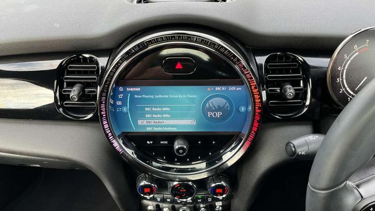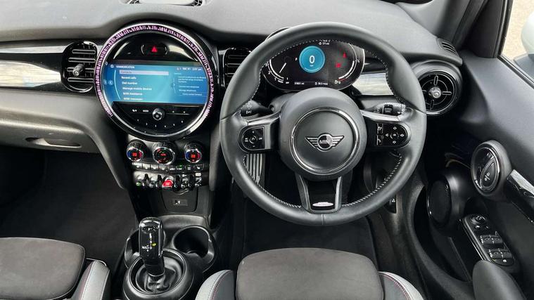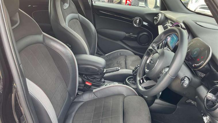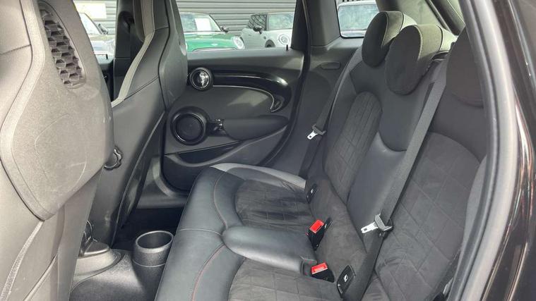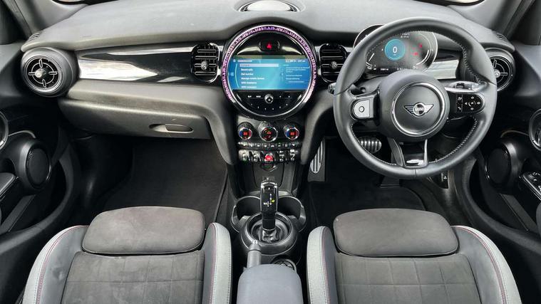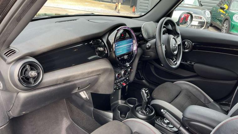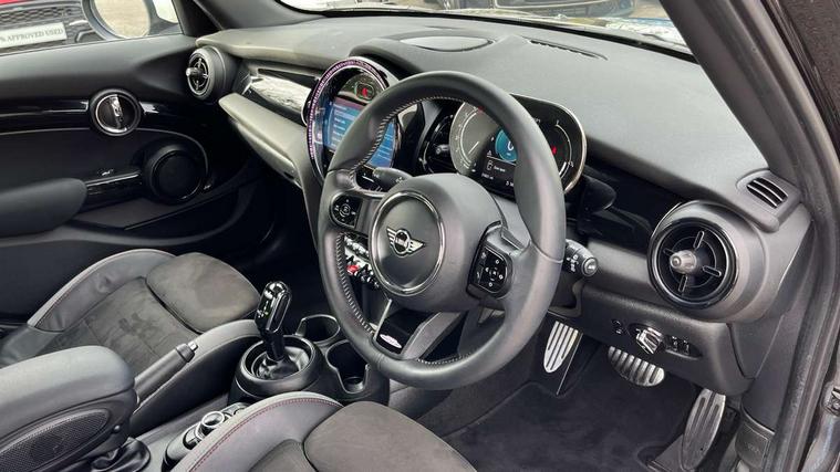 Automatic start/stop function with brake energy recuperation, Compatible mobile phone bluetooth with audio streaming, Cruise control with brake assist, Electro-mechanical speed dependant steering assistance, Flexible car sharing preparation, Instrument cluster, MINI Driving Modes - centre toggle switch to control driving setting (sport, mid and green), Mini E-call, MINI TeleServices, On board computer, Rear park distance control, Service interval indicator, Adaptive suspension, Double Vanos system, Fully variable valve control, Gear change indicator display, High precision injection, Performance Control, Steptronic transmission with double clutch, 6 speakers in front door trims and underneath front seats, 8.8" touchscreen with LED ring, FM tuner and DAB digital radio, Automatic headlight activation switch, Body colour fuel filler cap, Chrome border high gloss black slats radiator grille, Dynamic brake lights, Electric front+rear windows, Exhaust tailpipe on left with chrome finisher, Heated rear window, Heated windscreen washer jets, JCW Aerodynamic kit - Front and rear bumpers with sporty JCW styling and part-painted side sills with MINI John Cooper Works door sill finishers, John Cooper Works rear spoiler, LED headlight with closed ring and daytime driving lights, Metal door sill strips with MINI imprint, Model logo Cooper on right of tailgate, Rain sensor window wipers, Rear fog lights, Rear LED lights with union jack design, Rear window wiper, Side scuttle panel with integrated indicator, Sun/heat protection glass, White indicator lenses, 12V Accessory socket in centre console, 4 lashing eyes in luggage compartment, 60/40 split folding rear seat, Anthracite headliner including grab handles and clothes hooks, Carbon black colour line - Knee roll and door armrest, Chrome interior highlights, Cupholders, Front and rear isofix with front passenger airbag deactivation, Glove compartment, Height and length steering column adjustment, Interior lighting with 12 different colours across the dashboard, underneath door bezel with illuminated laser-engraved design on central display, JCW Sport seats with integrated headrests, adjustable thigh support and John Cooper Works logo, Leatherette gearshift lever and handbrake gaiters, LED reading lights, vanity mirror lights, front foot well light and spotlight on front seats, Manual air conditioning, Mechanical seat adjustment - forward/back & backrest for front seats and driver seat height adjust, Multifunction steering wheel, Storage compartments in doors, Sunvisors with vanity mirrors, Velour floor mats, Walknappa leather steering wheel with grey seam and John Cooper Works badge on Piano Black lower steering wheel spoke, Piano black exterior pack - Mini Hatchback Cooper, 3 point seatbelts on all five seats, 6 Airbags - front, side, head and seat belt tensioners, Anti-lock braking system (ABS), DSC - Dynamic Stability Control, Front and rear disc brakes, Hill start assist, Single tone fanfare horn, Tyre pressure monitoring system, Alarm system with tilt sensor, monitoring doors, bonnet interior and tailgate, Electronic vehicle immobiliser, Start/stop toggle with keyless go, Piano black interior trim, Tool kit,