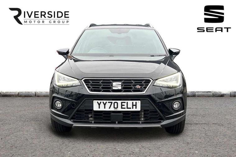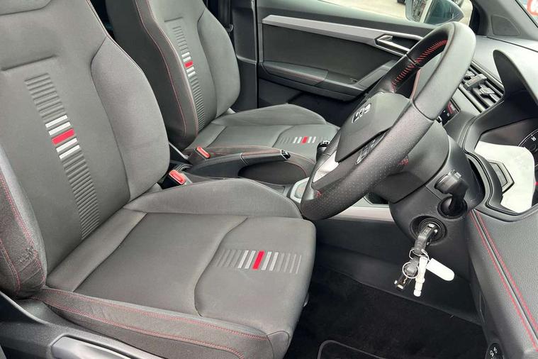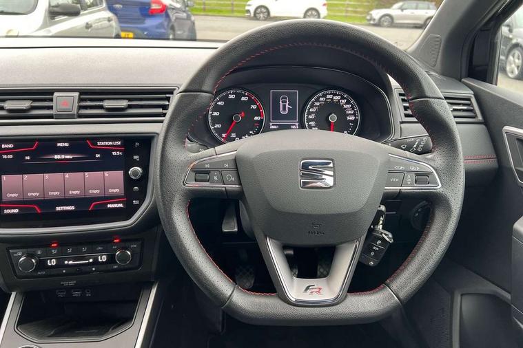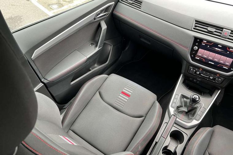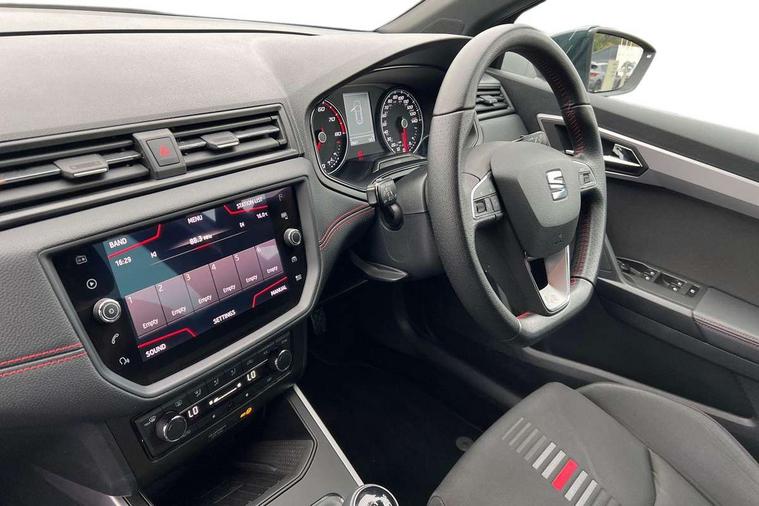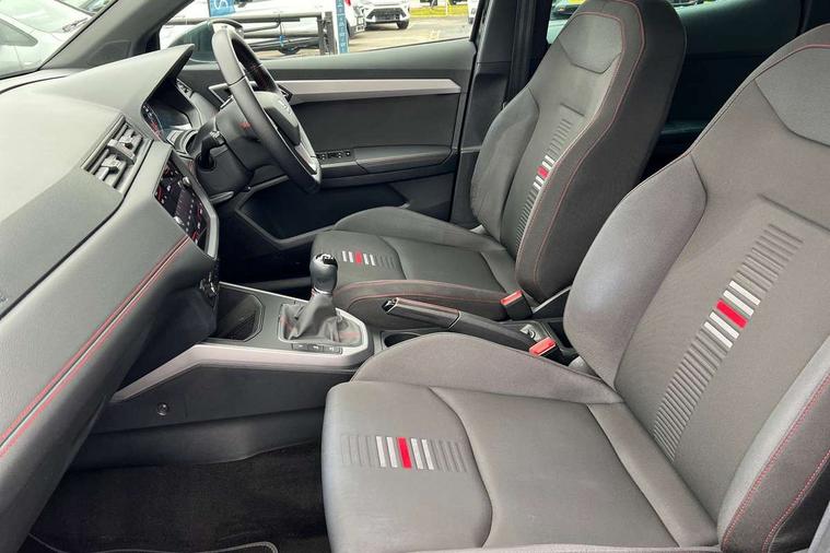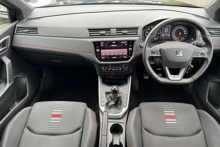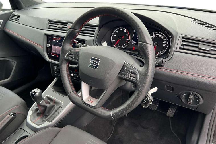 'Lights On' Reminder warning buzzer, Cruise control, Digital clock, Electric speed sensitive power steering, Full Link Smartphone Integration with Mirror Link, Apple Car Play, Google Android Auto with USB Type C cable for Apple and Android compatibility, Low fuel warning light, Outside temperature display, Rear parking sensor, RPM counter, SEAT Drive profile - Four different models normal-sport-eco-individual, steering response, throttle response, Trip computer, Sports suspension, 6 speakers, Bluetooth interface for hands free and audio streaming, DAB digital radio and AM/FM radio, Steering wheel mounted audio controls, Anti theft roof antenna, Auto dimming interior rear view mirror, Automatic activation of hazard warning lights, Automatic headlights, Body coloured bumpers, Body coloured door handle inserts, Chrome front grille frame, Chrome roof rails, Chrome window trim, Coming/leaving home lighting function, Dark tinted rear windows, Electric front/rear windows with one touch/auto up/down, Electrically adjustable, heated and folding door mirrors, Full LED headlights dipped and mainbeam + front and rear fog lights, LED daytime running lights, LED rear tail lights and licence plate lights, Rain sensing wipers, Rear window wash/wipe, Roof colour door mirrors, Twin exhaust pipe styling hidden exhaust pipe, Visible VIN plate, Windshield wiper with intermittent control and potentiometer, 2 cupholders, 60/40 split folding rear seat, Black interior roof, Double boot floor, Driver sunvisor with covered mirror + card holder, Dual zone climate control, Dust/pollen filter, Front courtesy light with front reading lights, Front sport seats, Gear shift indicator, Height adjustable front seats, Height/reach adjustable steering column, Illuminated boot, Instrument lighting with brightness control, Interior footwell lighting, ISOFIX points in outer rear seats with top tether anchorage points, Multi-colour ambient interior lighting, Nora cloth upholstery, Passenger sunvisor with vanity mirror, Perforated flat bottomed leather steering wheel/gear knob/handbrake with red stitching and FR logo, Two front and three rear height adjustable headrests, Connectivity pack plus - Arona, Interior chrome pack - Arona, 3 point seatbelts on all rear seats, ABS, Active front headrests, Child locks on rear doors, Driver and front passenger airbags with front passenger airbag de activation, front side and curtain airbags, Electronic stability control, Emergency Brake Assist (EBA) and front assist, Front and rear seatbelt reminder, Hill hold control, Multi-Collision braking, Tiredness recognition system, Traction control, Tyre pressure monitoring system, 2 folding remote keys with window open/close function, Alarm with back-up horn, Electronic engine immobiliser, Locking wheel bolts, Remote central locking + deadlocks, Tow away protection, Interior chrome line trim, Leatherette dashboard, 17" Dynamic alloy wheels,
