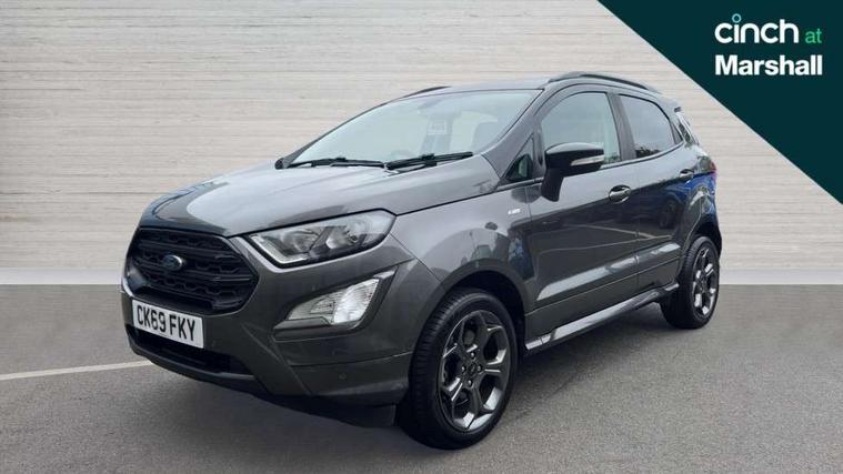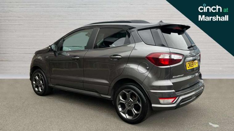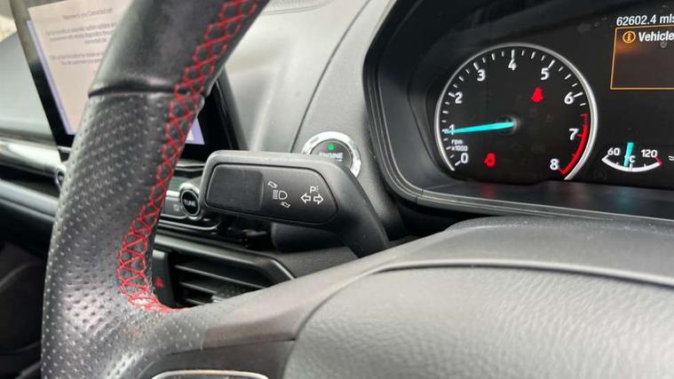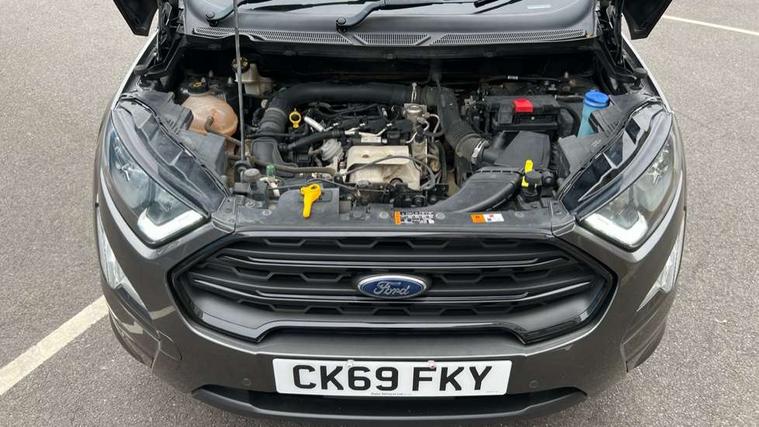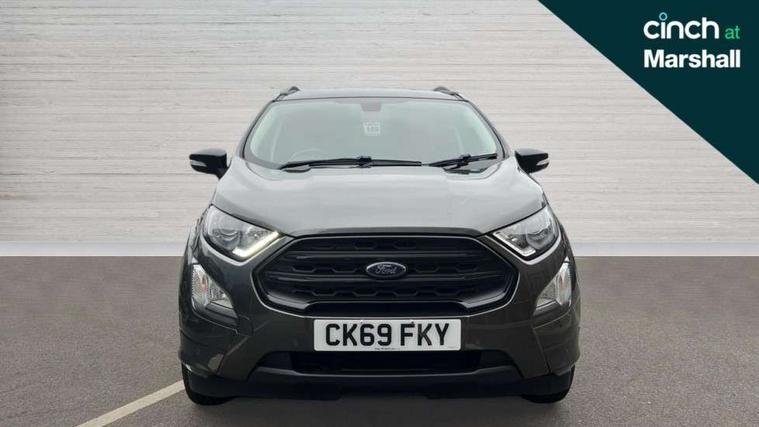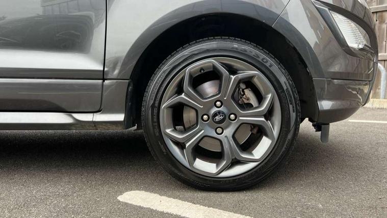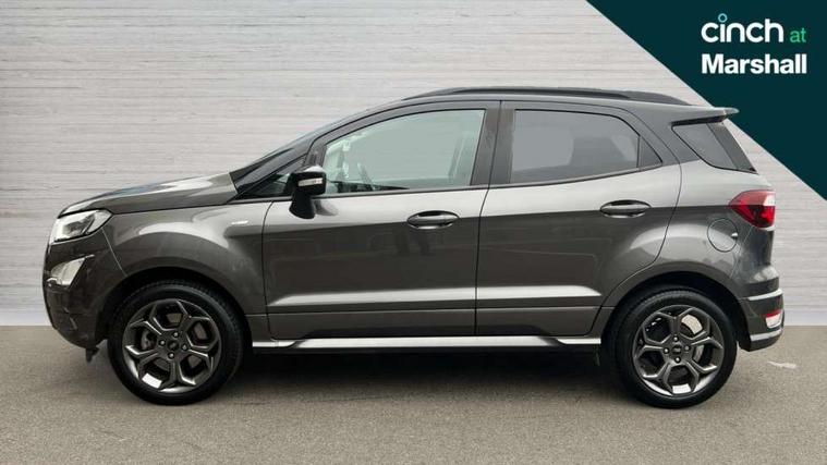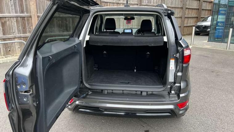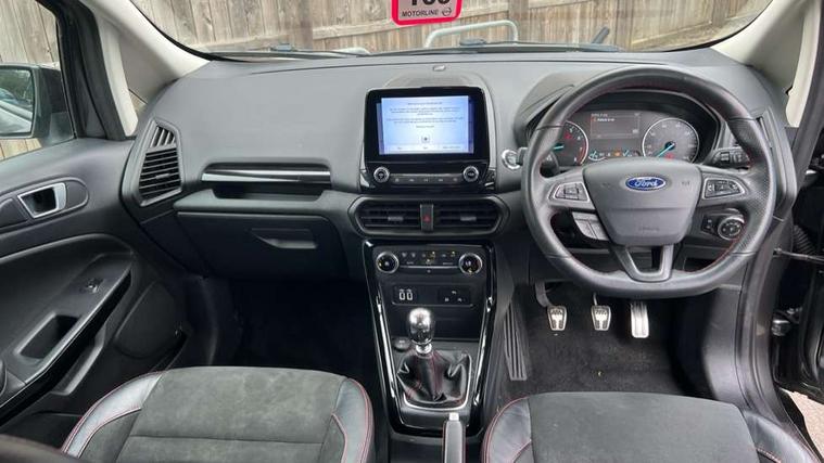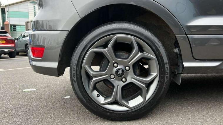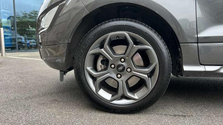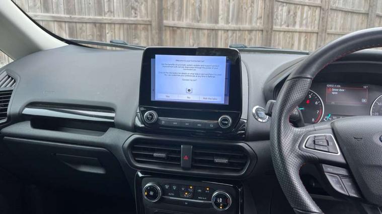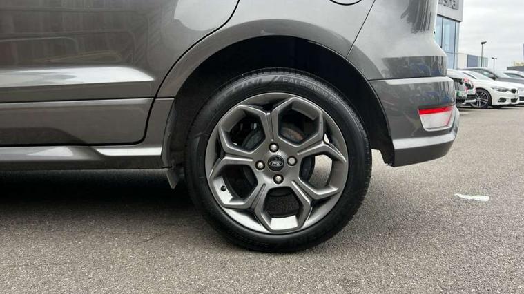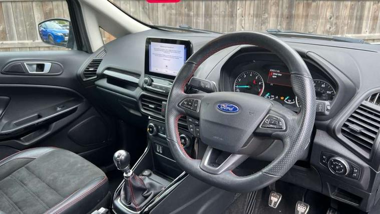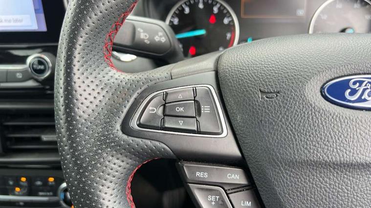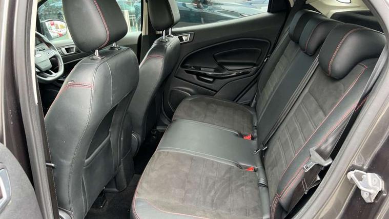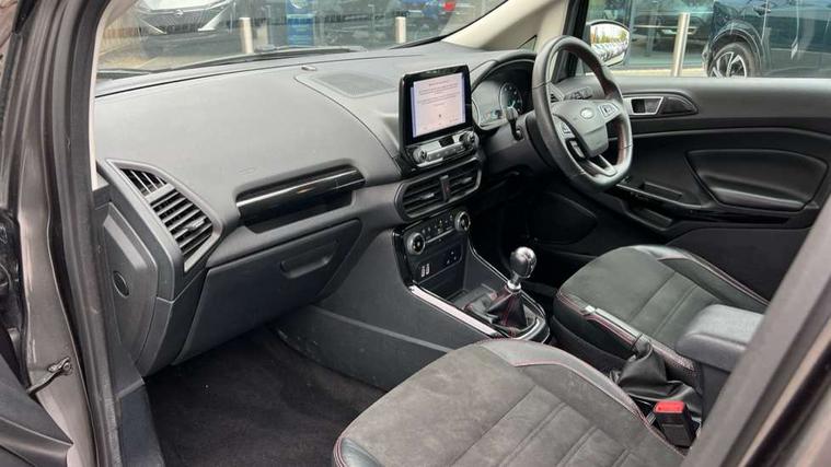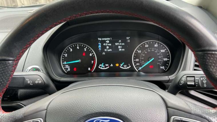 Cruise control, Easy fuel capless refuelling system, PAS, SYNC 3 nav system with DAB radio, 8" screen, voice control, emergency assistance, Apple car play/Android auto, 2x USB, Ford pass connect, Trip computer, Sports suspension, Steering wheel mounted audio controls, 'Quickclear' heated windscreen/heated washer jets, Auto dimming rear view mirror, Automatic headlights, Black roof rails, Body colour door handles, Body coloured bumpers, Electrically adjustable and heated door mirrors, Front door threshold plates with ST-Line logo, Front fog lights, Headlight levelling control, Large rear spoiler, Power foldable door mirrors with puddle lights, Power front and rear windows with global opening/closing, Rain sensing front wipers, Rear wiper, ST-Line body styling kit, ST-Line front grille, 12V socket in front and rear, 60/40 split rear seats, 7 shade adjustable ambient lighting, Centre console with sliding front armrest, Cooled glovebox, Courtesy lights with map reading light, Driver seat height/lumbar adjust, Driver's side glovebox, Driver/passenger sunvisors and lidded vanity mirrors, EATC - Electronic Auto Temperature control, Folding grab handles, Front head restraints, Front seat back map pockets, Front/rear floor mats, Illuminated glovebox, Illuminated luggage compartment, Isofix system on outer rear seats, Leather steering wheel/gearshift/handbrake lever with red stitching, Luggage compartment carpet, Overhead console with sunglasses holder, Partial leather upholstery, Rake adjustable rear seats, Reach + rake adjustable steering column, Rear headrests, Stainless steel sports pedals, Steering wheel with chrome inserts, Storage drawers under front seats, Tie down hooks, Variable boot floor, Rear view camera pack - Ecosport, 3x3 point rear seatbelts, ABS, Child locks on rear doors, Curtain airbags, Driver airbag, Drivers knee airbag, Electronic Stability Programme with hill launch assist, Emergency brake assist, Front passenger airbag deactivation, Front side airbags, Passenger airbag, Seatbelt reminder for driver and front passenger, Traction control, Tyre pressure monitoring system, Immobiliser, MyKey system, Remote central locking, Thatcham 1 volume sensing alarm, Tyre inflation kit,