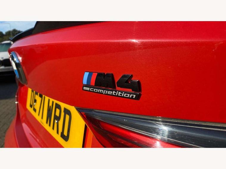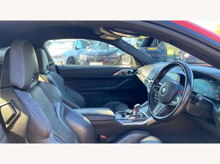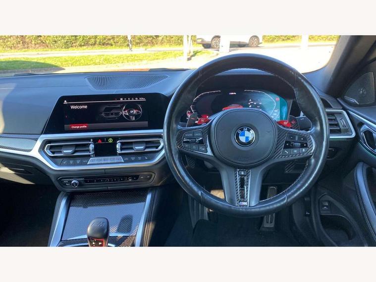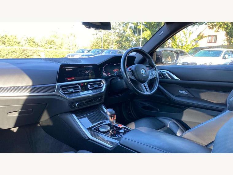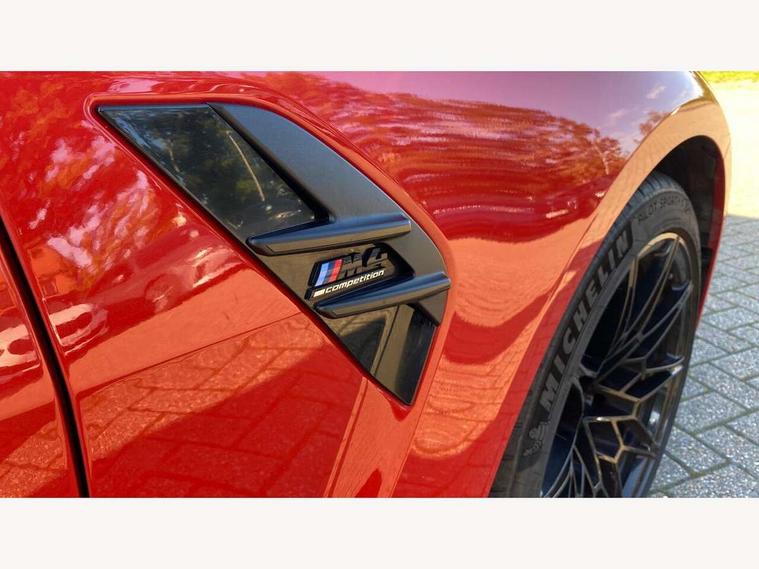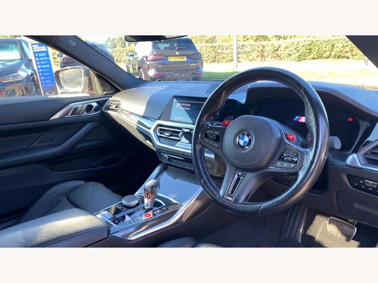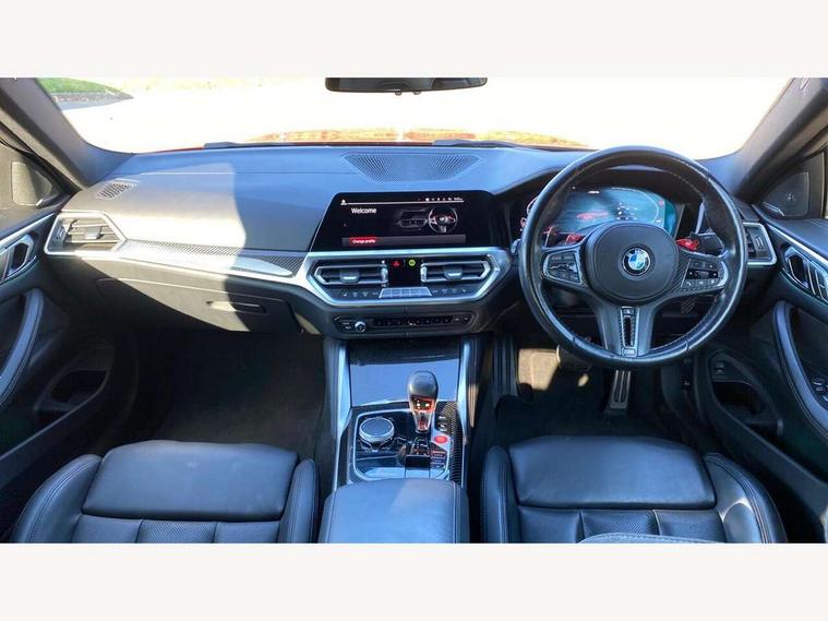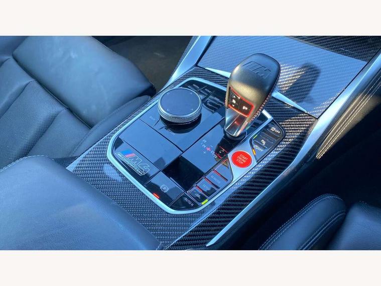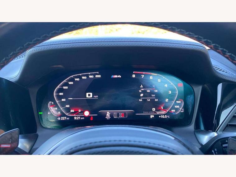 Automatic start/stop system, Bluetooth with USB, BMW gesture control, BMW iDrive controller on centre console, BMW legal emergency call, BMW Live Cockpit Professional sat nav system with 12.3" instrument display and high resolution control display, BMW Online services, BMW Teleservices, Brake pad wear indicator warning light, Door/boot open warning light, Electric Power Steering (EPS) with Servotronic, Enhanced bluetooth with wireless charging, Head up Display, Instrument cluster with extended contents, Lights on warning, Oil sensor for level and grade, warning by check control system, Oil temperature gauge, On board computer, On board diagnostics, Optimum shift indicator, Outside temperature display, Pull away assistant, Run flat indicator, Service interval indicator, Speed limiter, Wi-Fi hotspot, Adaptive M Sport suspension, M Drive Professional including track mode, laptimer, traction control & Drift analyser, M Sport differential, M steptronic sport transmission with drivelogic, 8 programmable favourite buttons, Auxiliary point for auxiliary devices, BMW professional radio/CD/MP3, DAB Digital radio, Harman/Kardon loudspeaker system, Auto dimming driver's door mirror, Auto dimming rear view mirror, Automatic headlights + automatic windscreen wipers, Black chrome exhaust tailpipes, Black model designation badges, BMW high gloss shadow line with extended contents, BMW Individual shadowline lights, Body colour bumpers, Body colour door handles, Carbon fibre reinforced plastic (CFRP) roof, Day time running light, Door mirror integrated indicators, Door sill finishers with aluminium inserts, Dynamic brake lights, Electric adjustable heated door mirrors, Electric folding door mirrors, Follow me home headlights, Front and rear bumper system, Front electric windows with open and close fingertip control, anti trap facility and comfort closing, Heat protection, sun protection glazing, High beam assistant, High gloss black frameless kidney grille with M badge, LED number plate light, LED tail lights with 3D L-shaped LED light design, M designation, Mirror glass aspheric on driver's side, convex on passenger side, Rain sensor, Rear boot, Rear fog lights, Rear reflectors, Shark fin roof aerial, Third brake light, Visible VIN plate, Welcome lighting, Windscreen wipers with integrated washing jets, 12V power socket in front centre console with blanking plug, 2 cupholders in front centre console, 2 rear head restraints, 40:20:40 manually split folding rear seat with two tilt positions for backrest, Ambient lighting, Anthracite headlining, Carbon fibre centre console incl. cover for cupholders, Carbon fibre decorative steering wheel finishers, Carbon fibre shift paddles, Carbon fibre strip in instrument panel on front passenger side, Compartment in front of cupholder, Driver/passenger sunvisors with illuminated vanity mirrors + covers, Electric front seats + driver memory, English handbook, Footwell lighting, Front and rear door exit lights, Front door storage bins with bottle holder, Front interior light, Front isofix attachment + airbag deactivation, Front seat backrest width adjustment, Front seats lumbar support, Front/rear door armrests, Gearshift lever with embossed M badge, Heated front seats, Height adjustable front headrests, Interior mirror lighting, Isofix on 2nd row outer seats, Lockable/illuminated glovebox, Luggage compartment lighting, Rake/reach adjustable steering wheel, Single front passenger seat, Storage compartment in rear doors, Storage tray and compartment with cover in centre console, Three zone automatic air conditioning, Toolkit located in luggage compartment, Additional storage compartment pack - M4, Connected package professional - M4, High gloss shadowline exterior trim pack - M4, 4 x 3 point seatbelts, ABS/EBD, Automatic Stability Control (ASC), Brake energy regeneration, Brake fade compensation, Compound structure brake discs, Cornering brake control (CBC), Crash sensor, Driver/Front Passenger airbags, Dry braking, Dynamic brake control, Dynamic Stability Control with M Dynamic mode, Dynamic Traction Control - DTC, Electromechanical parking brake, Front and rear head airbags, Front seat side impact airbags, Front seatbelt pretensioners + load limiters, Hill start assist, M Sport seat belts, Seatbelt warning, Side impact protection, Two tone horn, Tyre pressure sensor, Warning triangle and first aid kit, Electronic immobiliser, Remote central locking, Thatcham cat 1 remote alarm, Vehicle Key with 4 buttons including the integrated key, Galvanic finish to control surrounds, High gloss black interior trim, Tyre repair kit,