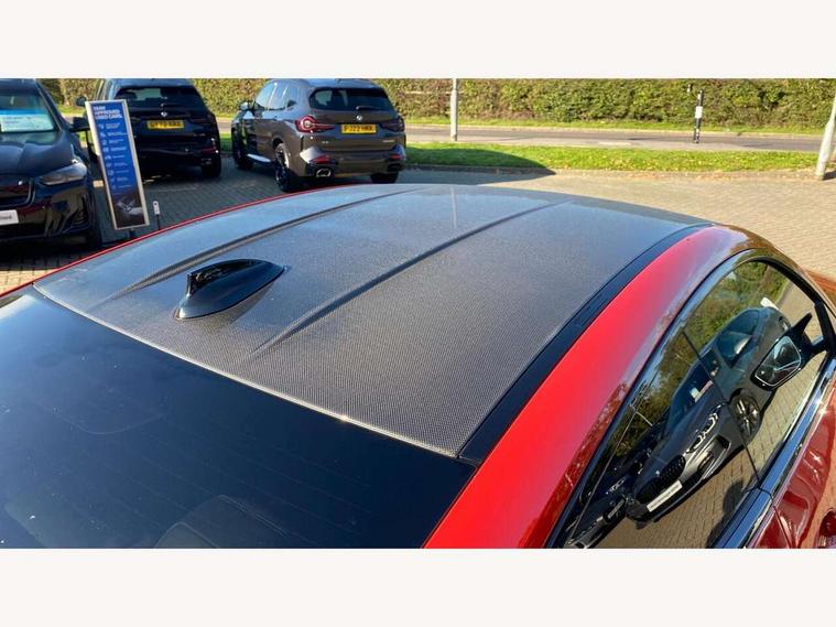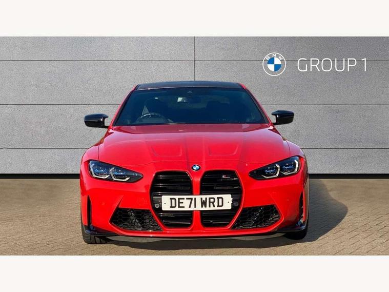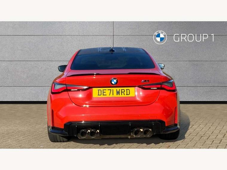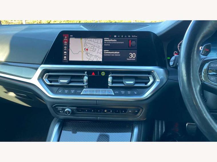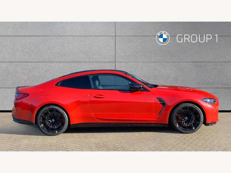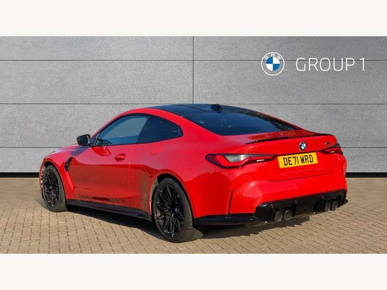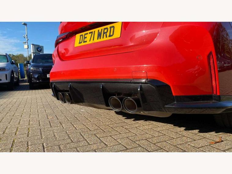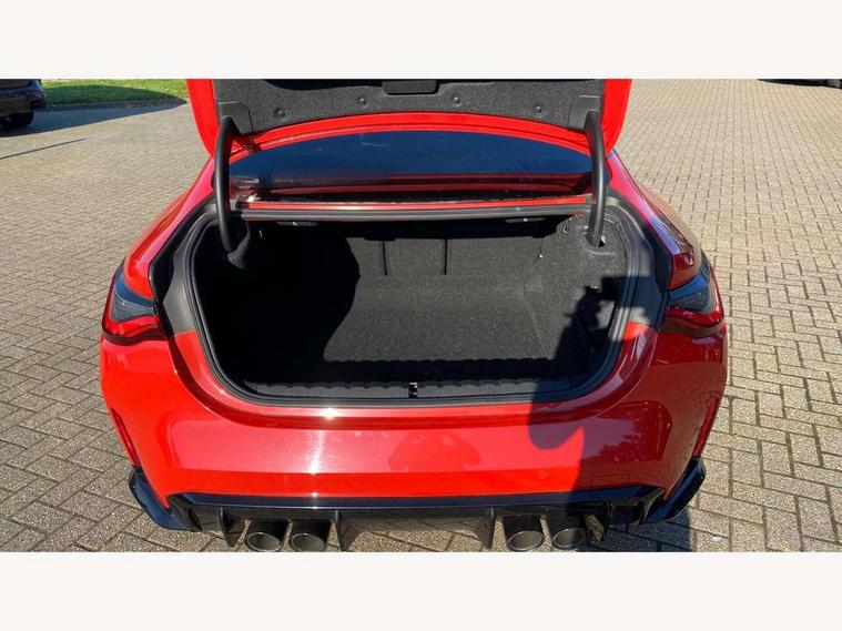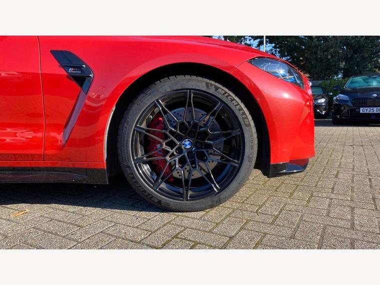 Automatic start/stop system, Bluetooth with USB, BMW gesture control, BMW iDrive controller on centre console, BMW legal emergency call, BMW Live Cockpit Professional sat nav system with 12.3" instrument display and high resolution control display, BMW Online services, BMW Teleservices, Brake pad wear indicator warning light, Door/boot open warning light, Electric Power Steering (EPS) with Servotronic, Enhanced bluetooth with wireless charging, Head up Display, Instrument cluster with extended contents, Lights on warning, Oil sensor for level and grade, warning by check control system, Oil temperature gauge, On board computer, On board diagnostics, Optimum shift indicator, Outside temperature display, Pull away assistant, Run flat indicator, Service interval indicator, Speed limiter, Wi-Fi hotspot, Adaptive M Sport suspension, M Drive Professional including track mode, laptimer, traction control & Drift analyser, M Sport differential, M steptronic sport transmission with drivelogic, 8 programmable favourite buttons, Auxiliary point for auxiliary devices, BMW professional radio/CD/MP3, DAB Digital radio, Harman/Kardon loudspeaker system, Auto dimming driver's door mirror, Auto dimming rear view mirror, Automatic headlights + automatic windscreen wipers, Black chrome exhaust tailpipes, Black model designation badges, BMW high gloss shadow line with extended contents, BMW Individual shadowline lights, Body colour bumpers, Body colour door handles, Carbon fibre reinforced plastic (CFRP) roof, Day time running light, Door mirror integrated indicators, Door sill finishers with aluminium inserts, Dynamic brake lights, Electric adjustable heated door mirrors, Electric folding door mirrors, Follow me home headlights, Front and rear bumper system, Front electric windows with open and close fingertip control, anti trap facility and comfort closing, Heat protection, sun protection glazing, High beam assistant, High gloss black frameless kidney grille with M badge, LED number plate light, LED tail lights with 3D L-shaped LED light design, M designation, Mirror glass aspheric on driver's side, convex on passenger side, Rain sensor, Rear boot, Rear fog lights, Rear reflectors, Shark fin roof aerial, Third brake light, Visible VIN plate, Welcome lighting, Windscreen wipers with integrated washing jets, 12V power socket in front centre console with blanking plug, 2 cupholders in front centre console, 2 rear head restraints, 40:20:40 manually split folding rear seat with two tilt positions for backrest, Ambient lighting, Anthracite headlining, Carbon fibre centre console incl. cover for cupholders, Carbon fibre decorative steering wheel finishers, Carbon fibre shift paddles, Carbon fibre strip in instrument panel on front passenger side, Compartment in front of cupholder, Driver/passenger sunvisors with illuminated vanity mirrors + covers, Electric front seats + driver memory, English handbook, Footwell lighting, Front and rear door exit lights, Front door storage bins with bottle holder, Front interior light, Front isofix attachment + airbag deactivation, Front seat backrest width adjustment, Front seats lumbar support, Front/rear door armrests, Gearshift lever with embossed M badge, Heated front seats, Height adjustable front headrests, Interior mirror lighting, Isofix on 2nd row outer seats, Lockable/illuminated glovebox, Luggage compartment lighting, Rake/reach adjustable steering wheel, Single front passenger seat, Storage compartment in rear doors, Storage tray and compartment with cover in centre console, Three zone automatic air conditioning, Toolkit located in luggage compartment, Additional storage compartment pack - M4, Connected package professional - M4, High gloss shadowline exterior trim pack - M4, 4 x 3 point seatbelts, ABS/EBD, Automatic Stability Control (ASC), Brake energy regeneration, Brake fade compensation, Compound structure brake discs, Cornering brake control (CBC), Crash sensor, Driver/Front Passenger airbags, Dry braking, Dynamic brake control, Dynamic Stability Control with M Dynamic mode, Dynamic Traction Control - DTC, Electromechanical parking brake, Front and rear head airbags, Front seat side impact airbags, Front seatbelt pretensioners + load limiters, Hill start assist, M Sport seat belts, Seatbelt warning, Side impact protection, Two tone horn, Tyre pressure sensor, Warning triangle and first aid kit, Electronic immobiliser, Remote central locking, Thatcham cat 1 remote alarm, Vehicle Key with 4 buttons including the integrated key, Galvanic finish to control surrounds, High gloss black interior trim, Tyre repair kit,