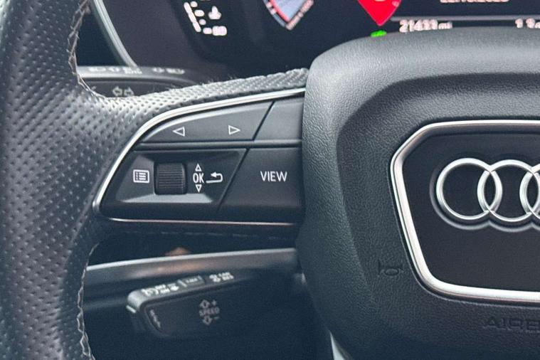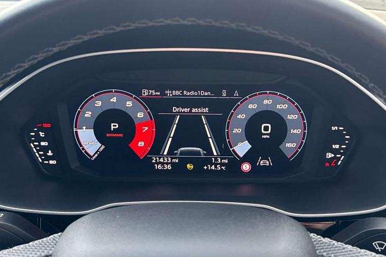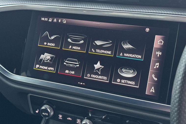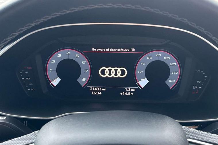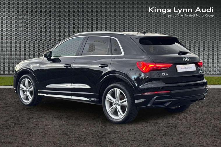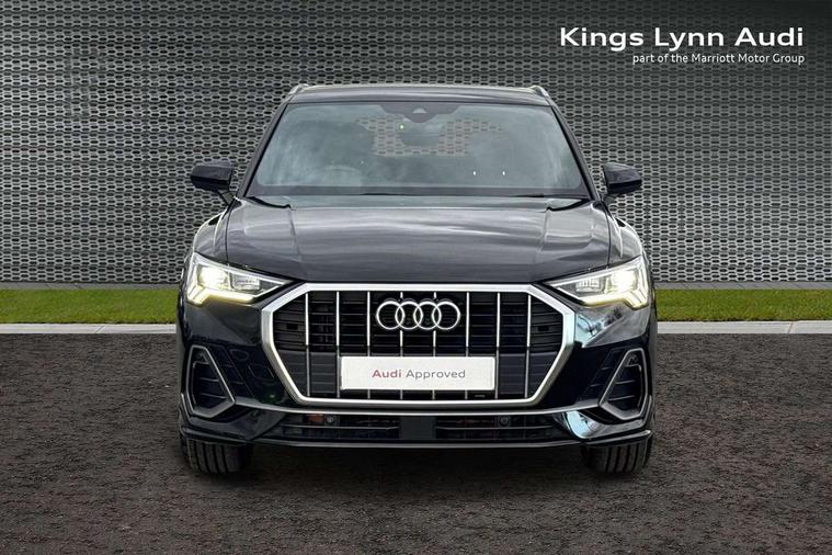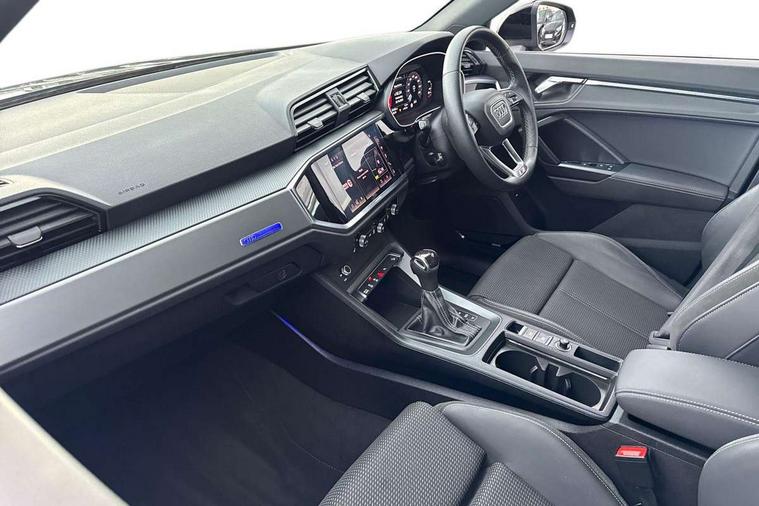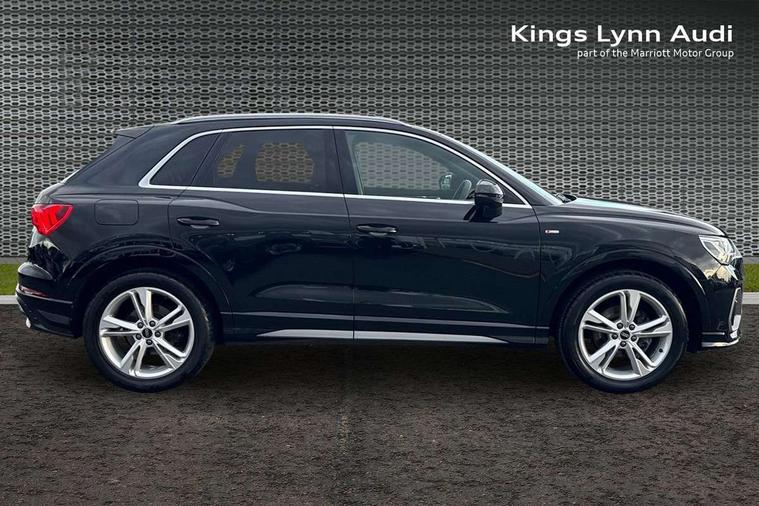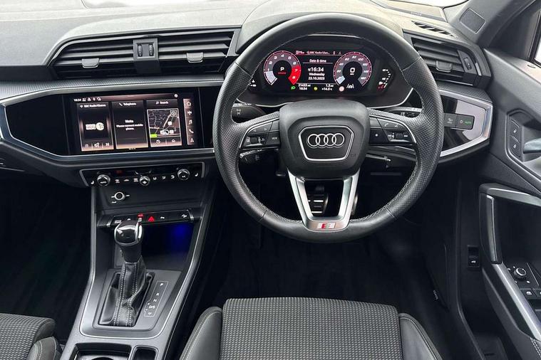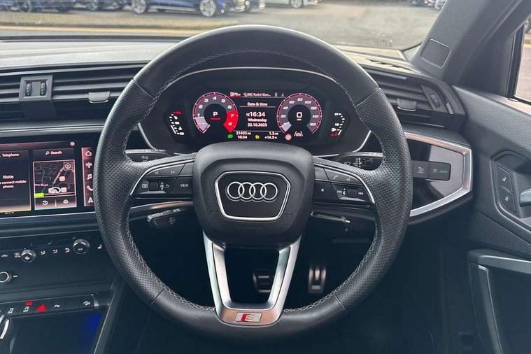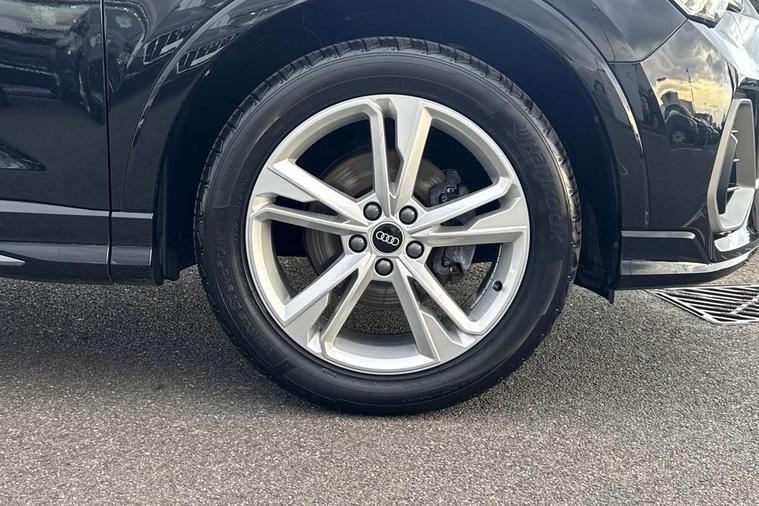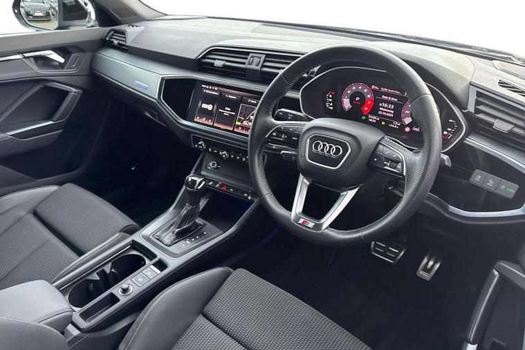 Amazon alexa Integration, Audi connect safety and service (e-call), Audi drive select, Audi lane departure warning, Audi smartphone interface includes wireless Apple carplay/Android Auto, Audi Virtual Cockpit - 10.25" display, Bluetooth interface, Camera based traffic sign recognition, MMI Navigation Plus with high resolution 10.1 inch touchscreen colour display, Power operated tailgate, Progressive steering, Service interval indicator, Start stop system with recuperation, Voice control system with natural language interaction, 48V Mild hybrid technology, Sports suspension, 2 USB-C ports with charge and data functions, 6 passive loudspeakers, DAB digital radio module, Acoustic windscreen, Aluminium roof rails, Aluminium window trim, Auto dimming frameless rear view mirror, Body coloured bumpers, Electrically folding, adjustable and heated door mirrors with integrated LED side indicators and kerb view function for passenger side, Front and rear electric windows, Front fog lights, Front side air inlets in matt platinum grey, Front spoiler blade in matt platinum grey, Grille vertical bars in aluminium silver/Matt, High gloss black finish B and C pillars, LED headlights with LED daytime running lights and dynamic rear indicator, LED rear lights, Privacy glass dark tinted rear and rear-side windows (from B-pillar backwards), Rain and light sensors, Rear diffuser strip in matt titanium black, S line badges on front wings, S Line front and rear bumpers, Side skirt insert in matt Platinium grey, Silver chrome grille surround, Titanium black radiator grille, 12V socket in rear centre console, 40:20:40 folding with manual adjustment for 60:40 forwards/backwards position and backrest angle, Adjustable rear seat bench/backrest with centre armrest and cupholder, Black cloth headlining, Dual zone electronic climate control, Front and rear black floor mats with contrast stitching in rock grey, Front and rear headrests, Front and rear roof module including reading lights, Front centre armrest, Glove compartment lighting, Height and reach adjustable steering wheel, Illuminated door sill trims with S logo, ISOFIX child seat mounting for front passenger with airbag deactivation and outer rear seat including top tether attachment point for outer rear seats, Luggage compartment light, Manual front seats with height adjustment, Perforated leather gearknob, Stainless steel luggage compartment sill finisher, Stainless steel pedals, Tool kit, Non smoking pack - Q3, 3x3 point rear seatbelts, 6 airbags - Driver, front passenger, curtain and side windows, Audi pre-sense front with pedestrain and cyclist recognition, Electrically operated child locks on rear doors, Electromechanical parking brake, Electronic stabilisation control including ABS, ASR and EDL, Hill descent control, Hill hold assist, Pre sense basic, Seatbelt monitoring, Tyre pressure warning, Warning triangle and first aid kit, Anti theft alarm, Anti theft wheel bolts, Remote central locking, Dark matt brushed aluminium inlay, Detail dashboard around MMI touch colour display in glass look, black with surround in aluminium look, Leatherette door armrest, Tyre repair kit,