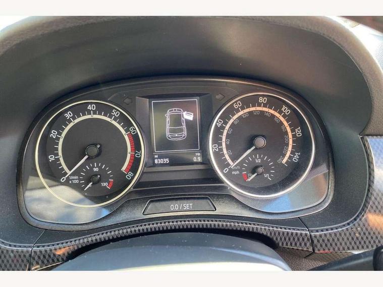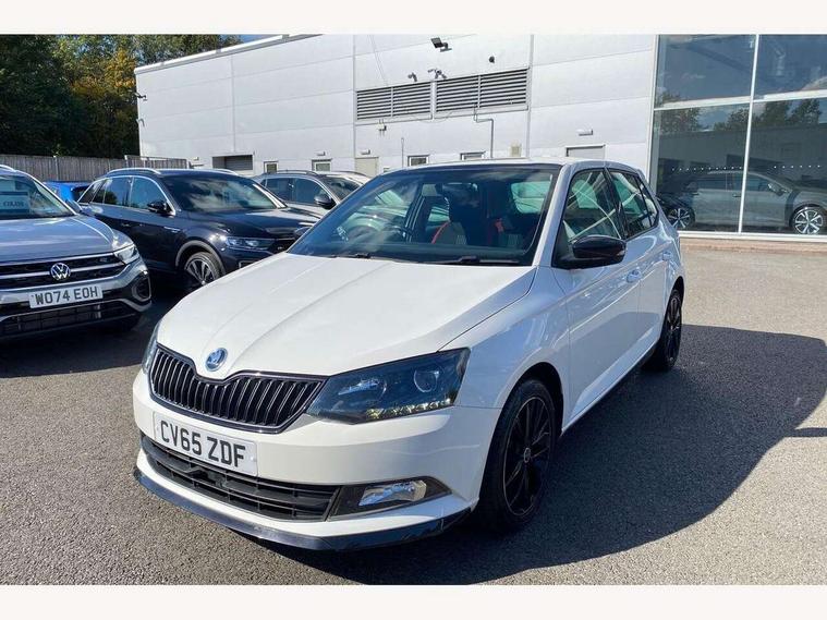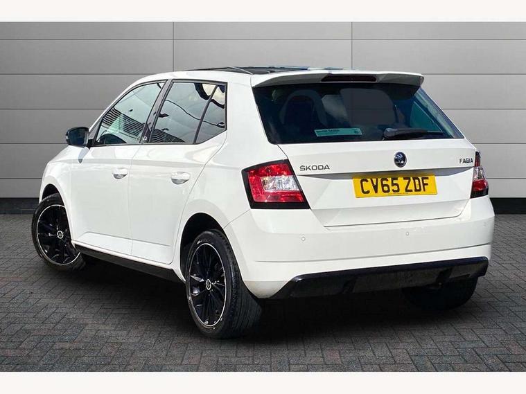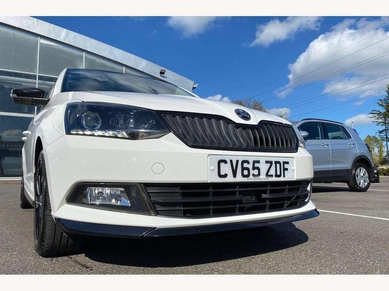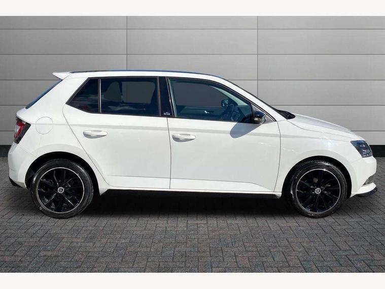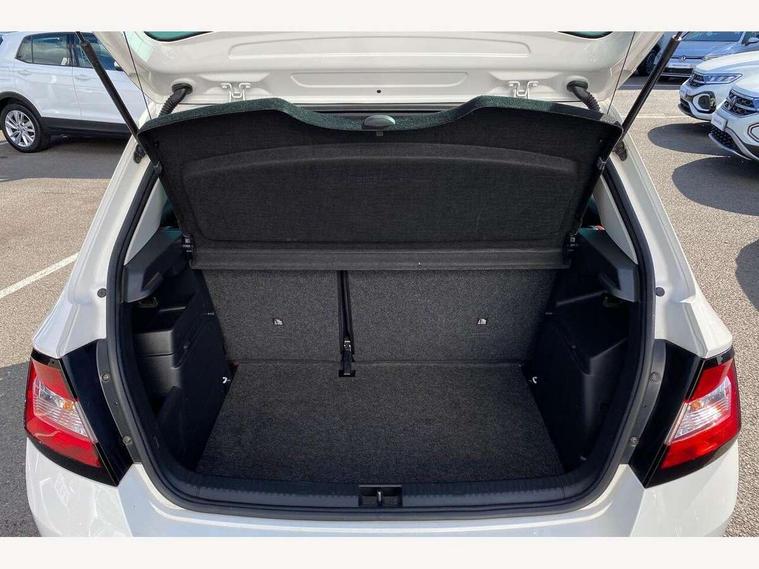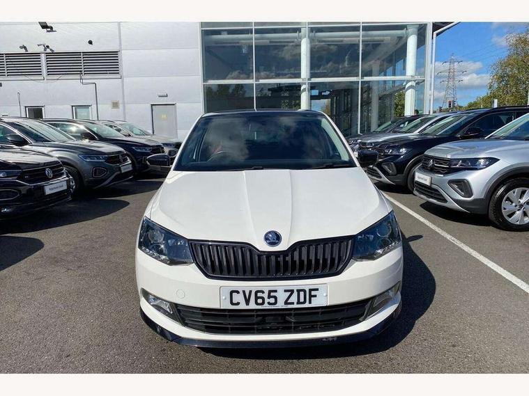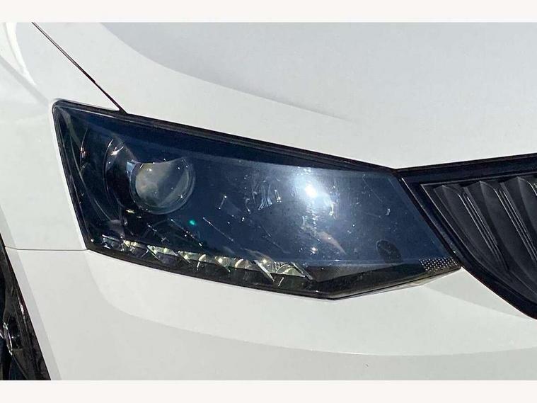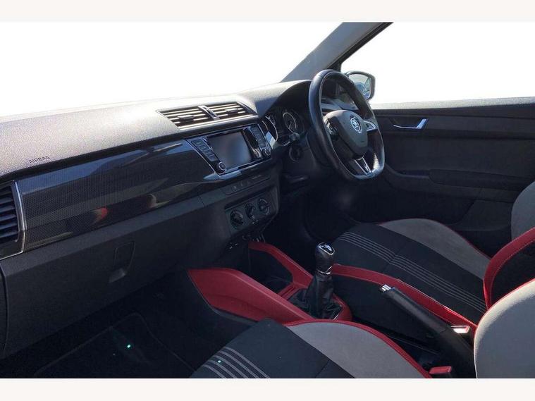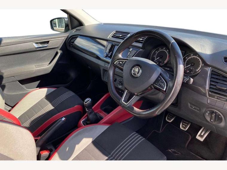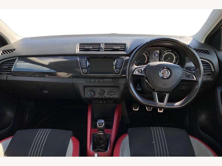 Bluetooth system, Exterior temperature gauge, Front assistant collision mitigation, Maxi dot trip computer, PAS, Service interval indicator, SmartLink, Auxiliary socket for external MP3 player, Bolero radio with telephone control, Mirror Link, USB and SD card, DAB Digital radio, Black door mirrors, Black radiator grille, Body colour bumpers, Body colour door handles, Body coloured rear spoiler, Electric front windows, Electrically adjustable and heated door mirrors, Heated rear window, Height adjustable headlamps, Intermittent rear wash/wipe, LED daytime running lights, Panoramic sunroof, Sunset glass from b-pillar back, Tinted rear windows, Tinted windscreen, 1.5L bottle holder in front door panels, 2 height adjustable rear headrests, 3 spoke leather multifunction sports steering wheel with red stitching, 60/40 split folding rear seat, Boot stowage box, Cargo area storage tray, Cherry red centre console, Cloth upholstery, Driver + passenger vanity mirrors, Floor mats with red stitching, Folding grab handles, Front reading lights, Front sports seats, Height adjustable driver's seat, Height adjustable front headrests, Height adjustable passenger seat, Height/reach adjust steering wheel, Interior light with delay, Leather gearshift, Leather handbrake, Lower glovebox cover, Luggage load hooks, Parcel shelf, Pearl grey carpets, Pearl grey headlining, Pollen filter, Rear courtesy light, Rear storage trays, Storage compartment under front seats, Ticket holder, Two rear outer seat isofix location points, Arkamys surround sound pack - Fabia, Chrome Pack - Fabia, 3x3 point rear seatbelts, ABS, Curtain airbags, Driver and passenger airbags, Driver and passenger side airbags, EDS, ESC with ASR, Front seatbelt pretensioners, Hydraulic Brake Assist (HBA), Passenger airbag deactivate switch, Seatbelt warning, Tyre pressure monitor, Alarm with interior monitoring, Immobiliser, Locking wheel bolts, Remote central locking, Black decorative inserts,