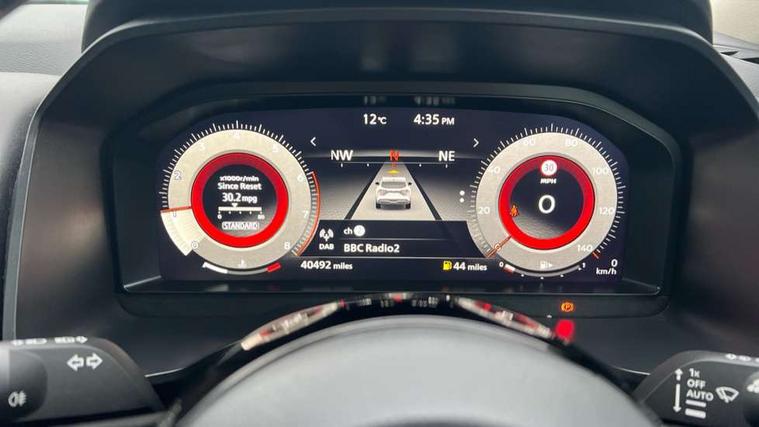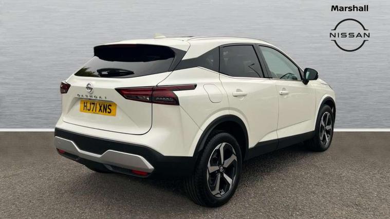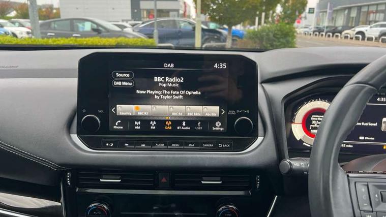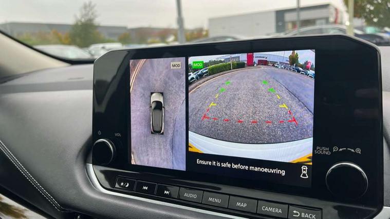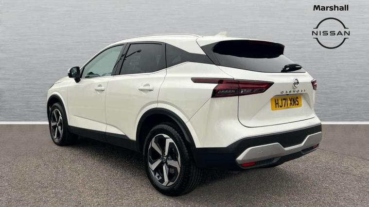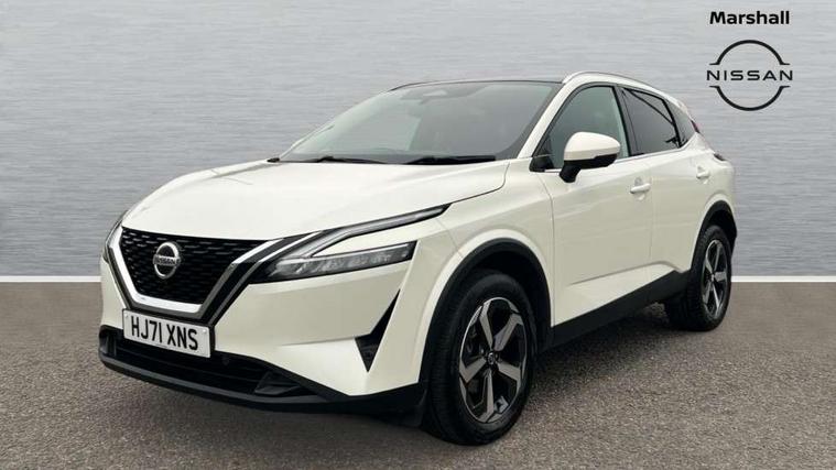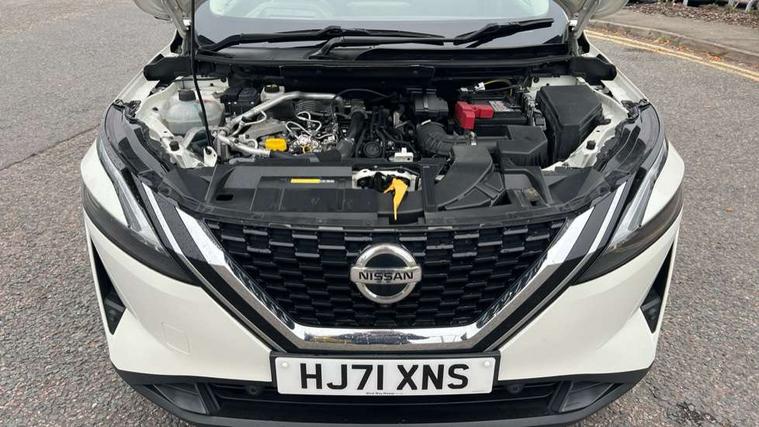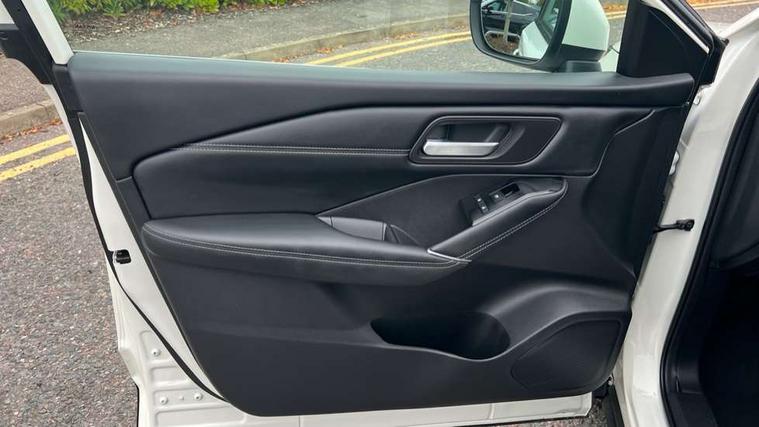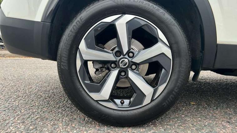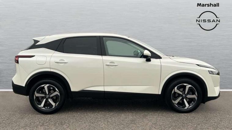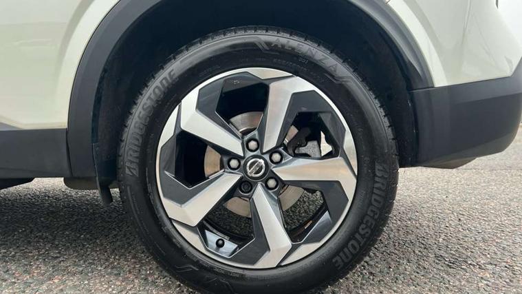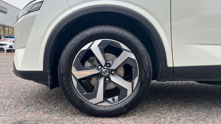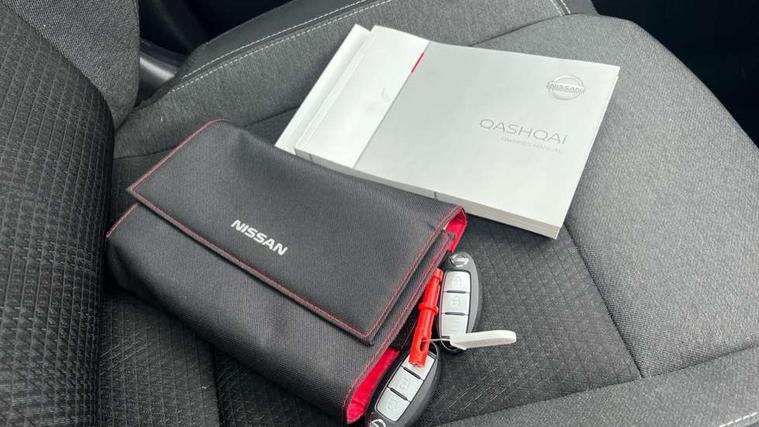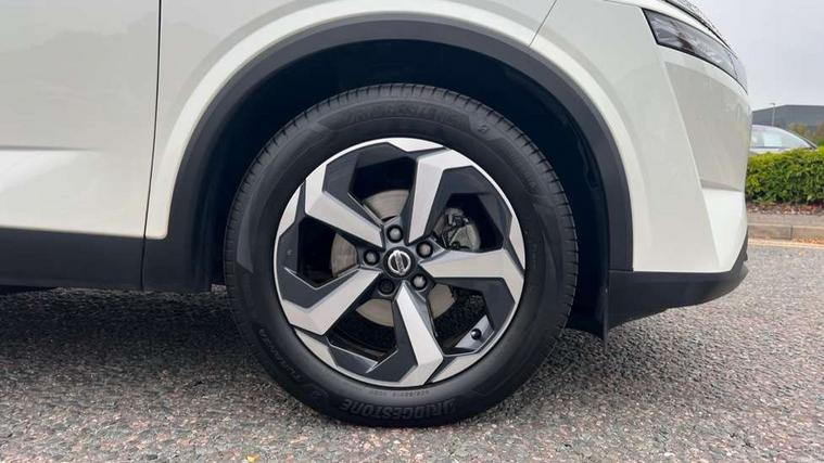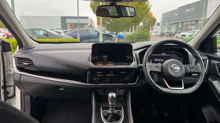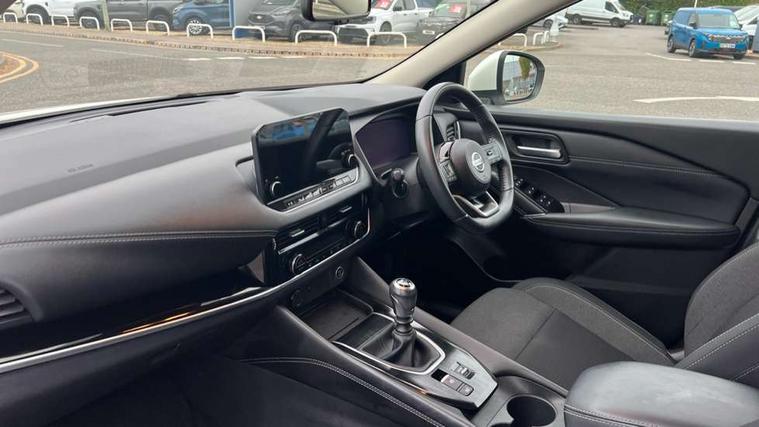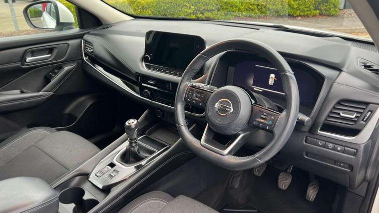 Blind spot warning, Drive modes (sport, normal, eco), Electric speed sensitive power steering, Emergency and breakdown call, Front and rear parking sensors, Full Digital 12.3" TFT Digital Combimeter, Idle stop/start system, Intelligent Cruise control (ICC), Intelligent driver alert system, Intelligent forward collision warning, Intelligent lane intervention, Lane departure prevention, Lane departure warning system, Moving object detection, Push button starter, Rear cross traffic alert, Traffic sign recognition with legal speed adjustment, Trip computer, 6 speakers, AM/FM audio system with DAB, Bluetooth audio streaming, Front USB connections (Type-A and Type-C), Rear USB charging only ports (Type-A and Type-C), 3rd brake light, Auto dimming rear view mirror, Auto rear wiper when reversing, Body colour mirror caps, Body coloured door handles, Bodyside mouldings, Chrome side window finisher, Electric auto folding door mirrors, Electrically adjustable and heated door mirrors with LED turn indicator, Fixed panoramic glass roof with electric sunshade, Follow me home headlights, High beam assist, Intelligent auto headlights, LED daytime running lights, LED rear lights, One touch front and rear electric windows with remote opening and closing, Partially body coloured bumpers, Privacy glass, Rain sensor, Rear roof spoiler, Rear side wing doors, Rear styling plate, Roof rails, Shark fin antenna, Splash free rain sensing wipers, Super UV and infrared cut glass, Three blink turn signal, 12v power socket in dashboard and luggage, 2 way electrical driver lumbar adjustment, 2x Rear coat hooks, 3 bench rear seats in 2nd row, 3 rear headrests, 4 grab handles, 6 Luggage hooks - 4 on floor, 2 on side, 60/40 split folding rear seat bench, Ambient lighting around centre console, Centre console storage tray, Chrome interior door handles, Cloth monoform upholstery, Driver and front passenger sunvisors with illuminated vanity mirrors, Driver seat back pocket, Dual zone automatic climate control with pollen filter, Front centre console and armrest, Front cupholder, Front door with bottle holders, Glovebox with light, Hard trunk cover, Height adjustable driver's seat, Height adjustable front headrests, Leather shift knob, Leather steering wheel, Luggage board system, Luggage space lighting, Manually adjustable passenger (slide recline + lifter), Multifunction steering wheel, Passenger seat back pocket, Rear armrest with 2 cupholders, Rear door bottle holders, Single front passenger seat, Soft PVC kneepad, Steering wheel switches, Tilt/telescopic adjustable steering wheel, Two rear isofix child seat anchorage points with top tether, Welcome light and console tray ambient lighting, Connectivity Pack - Qashqai, Tech Pack (Drive Assist + HUD), 3x3 point rear seatbelt pretensioners + load limiters, ABS, ESP, EBD and brake assist, Active brake limited slip, Auto hold function, Child locks on rear doors, Curtain and front side, far side airbags, Driver and passenger airbags, Driver, passenger and 2nd row rear seat belt reminder, Electronic parking brake, Front seatbelt pretensioners + load limiters, Height adjustable front seatbelts, Hill start assist, Intelligent blind spot intervention, Intelligent front emergency braking with pedestrian, cyclist recognition and junction assist, Intelligent rear automatic braking, Tyre pressure monitoring system, Vehicle dynamic control, Capless fuel filler, Engine immobiliser, Nissan i-key, Remote central door locking with deadlocking, Thatcham Cat.1 alarm, 18" Diamond cut alloy wheels,