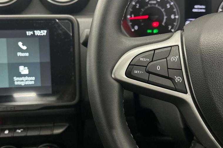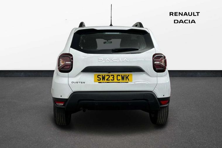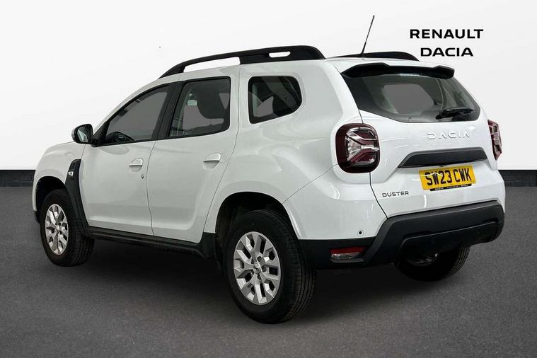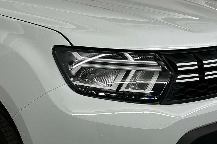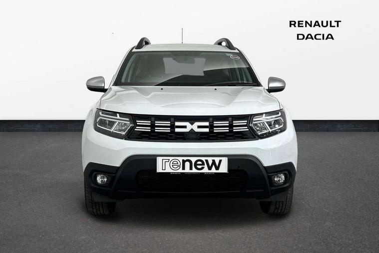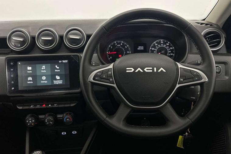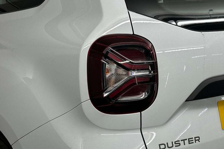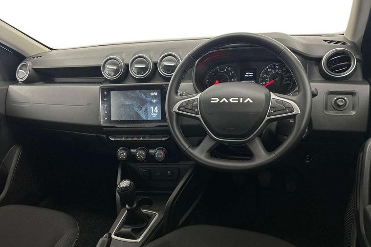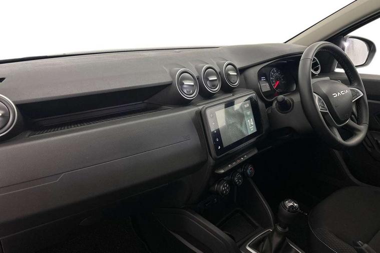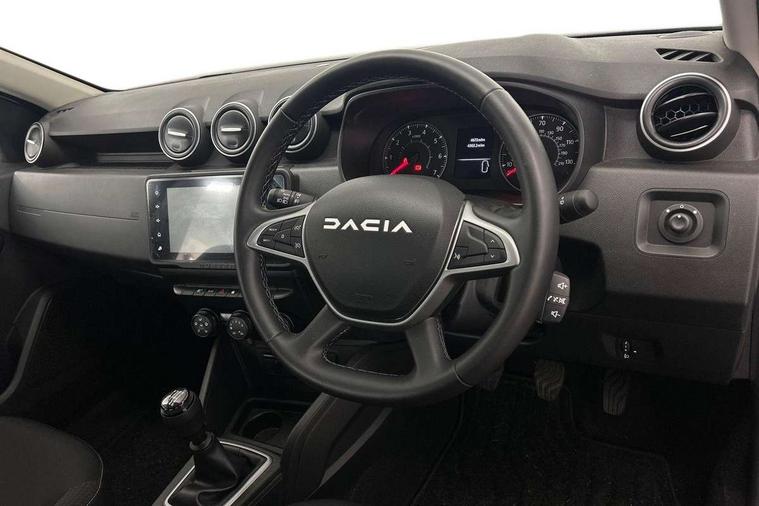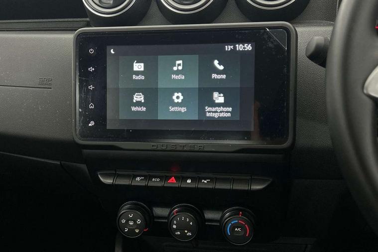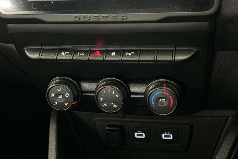 Cruise control and speed limiter, eCall emergency system, Eco mode, Electric power assisted steering, On board computer, odometer, trip computer, average fuel consumption, average speed, service indicator, outside temperature gauge, Rear parking sensors, Rev counter, Reversing camera, Stop/start system, 8" Media display with smartphone replication, 2 usb sockets and 6 speakers, Dacia plug and radio/MP3/USB/bluetooth/DAB/steering wheel control, 3 speed windscreen wipers, Black longitudinal roof bars with Duster inscription, Black side sills, Black/satin chrome tailgate trim with Duster inscription in black background and lettering, Body coloured door handles, Chrome front grille with hot stamping, Chrome logo surround on steering wheel, Daytime running lights, Drivers window one touch up/down, Dusk sensor, Electric adjustable/heated door mirrors, Electric front windows, Electric rear windows, Front and rear body coloured bumpers, Front door sill protection strip, Front fog lights, Heated rear window, High level third rear brake light, Rain sensor, Rear side wing doors, Rear spoiler, Rear wash/wipe, Satin chrome door mirrors, Tinted windows, Underbody protection skid plates, Y shaped LED headlights with rear LED lights, 3 rear height adjustable headrests, 3 seat bench in 2nd row, 60/40 split folding rear seat, Backlighted steering wheel buttons, Boot light, Driver seat lumbar adjustment, Fabric decorative insert on door panels, Fabric upholstery, Front head restraints, Front passenger reading light, Gear shift indicator, Height adjustable driver seat, Height adjustable front and rear headrests, Height and depth adjustable steering wheel, High centre console with driver armrest, Isofix points for child seats in both outer rear seats, Manual air conditioning, Map pocket on front seat backs, Passenger sunvisor with vanity mirror, Rear passenger reading light, Satin chrome interior door handles, Satin chrome lower steering wheel insert, Single front passenger seat, Soft feel leather steering wheel, 3x3 point rear seatbelts, ABS and Emergency brake assist, ASR traction control with Electronic stability control, Child locks on rear doors, Door open visual and audible warning, Driver airbag, Driver and passenger seatbelt not fastened - visual and audible warning, EBD - Electronic brakeforce distribution, Front passenger airbag, Front passenger airbag deactivation, Front seatbelt pretensioners, Front side airbags, Height adjustable front seatbelts, Hill start assist, Tyre pressure monitor, Remote central locking, Thatcham approved engine immobiliser, Charcoal grey central console surround, Matt black central console fascia, Piano black decorative insert on front door panels, Satin chrome air vent surround, Satin chrome instrument dial surrounds, 16" alloy wheels,