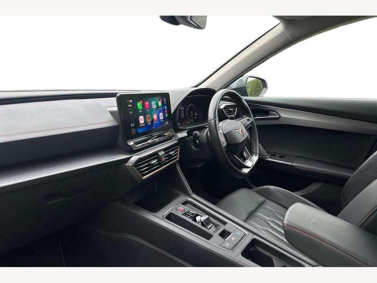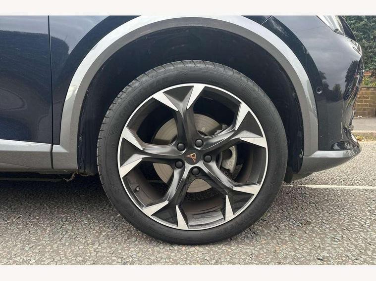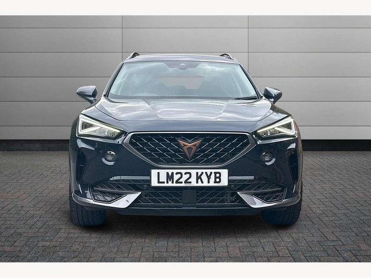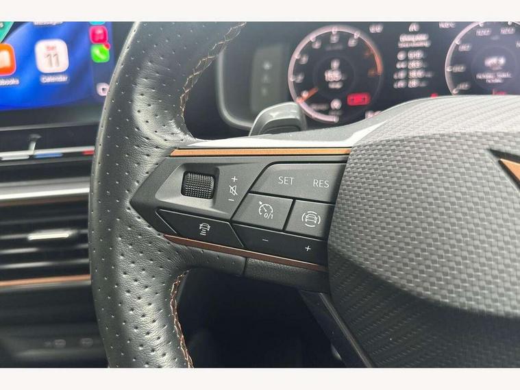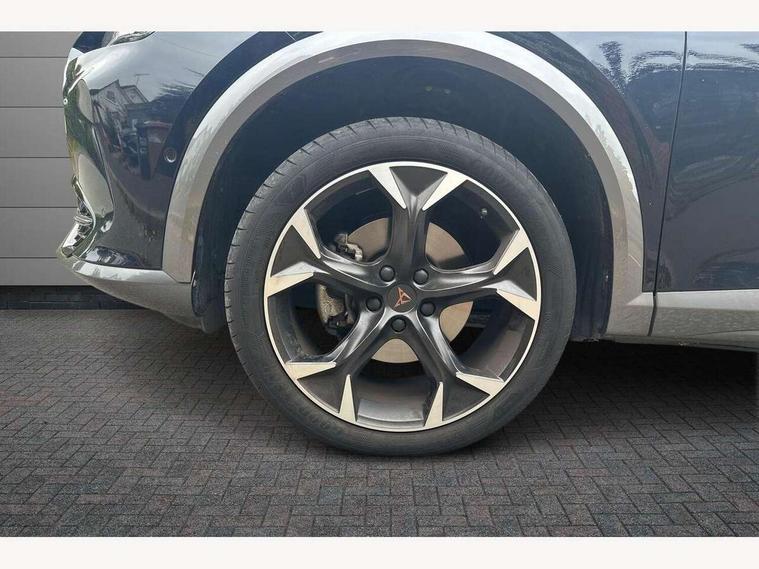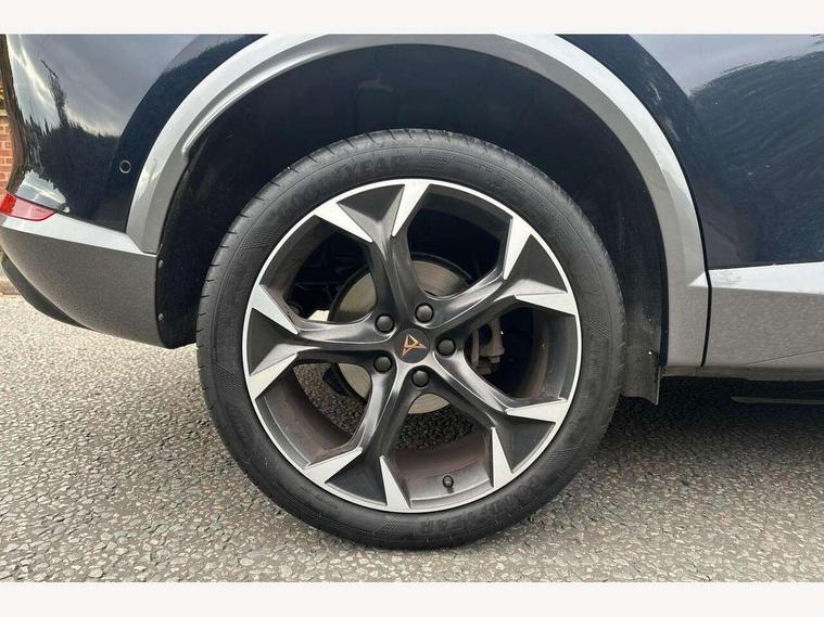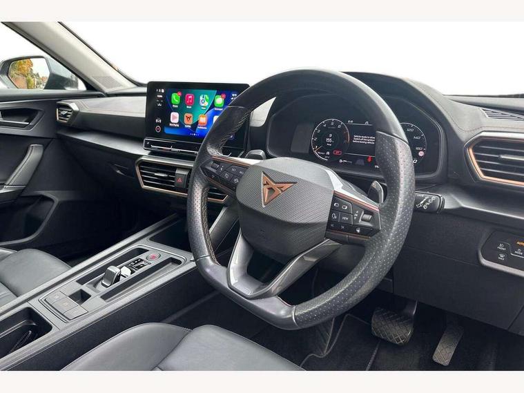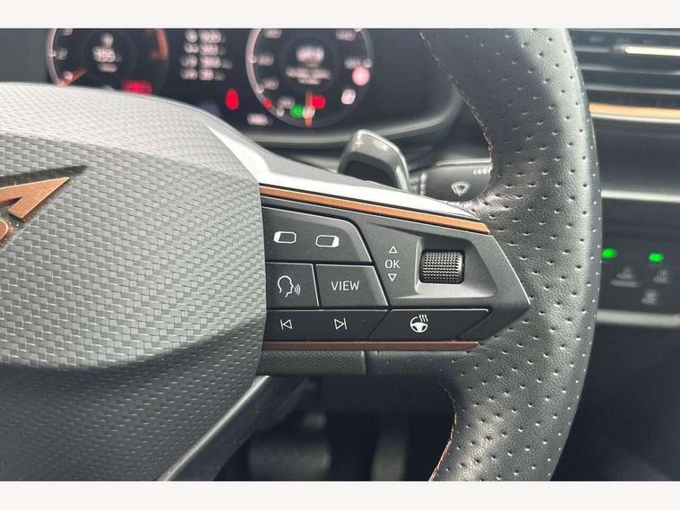 Digital cockpit and configurable dashboard, Driver alert system, Driving profile selection, E-call, Forward collision warning with automatic braking, Lane assist, Park assist (inc front/rear parking sensors), PAS, Predictive adaptive cruise control with speed limiter, Rear view camera, RPM, trip computer, outside temp gauge, instrument light brightness, low fuel warning light, lights on reminder, gearshift indicator, Service interval indicator, Start/stop system with regenerative braking, Wireless apple carplay, Wireless phone charger, Electronic locking differential and dynamic traction support, Standard suspension, 2 front and 2 rear USB type C sockets, Auxiliary input socket, DAB radio, Auto dimming rear view mirror, Body colour door handles, Body coloured bumpers, Dark grey wing mirror, Daytime running light with automatic headlight control and coming home feature, Dynamic headlight range control, Electric front/rear windows, Electrically adjustable heated and folding door mirrors with memory function, Front fog lamps with cornering function, Gloss black roof rails and window surrounds, LED Headlights, LED Taillights with dynamic indicator, Rain sensing wipers, Rear diffuser with black simulated exhaust pipes, Rear side wing doors, Rear wash/wipe, Third brake light, Tinted rear windows, Welcome lights, 12v power supply in centre console, 12V socket, 12v socket in loadspace, 2 front and 2 rear reading lights, 230V socket, 3 seat bench in 2nd row, 60/40 split rear bench seat with armrest and mechanical seat release, Dust/pollen filter, Front and rear head restraints, Front centre armrest, Height/reach adjust steering wheel, Illuminated interior front door sills, Illuminated sunvisor with mirror, Isofix, Leather multi function heated steering wheel with gear shift paddles, Luggage tie-down hooks, Single front passenger seat, Three zone climate control with control panel in rear, Variable luggage/load compartment floor, Wraparound lighting, Genuine Nappa leather Pack - Cupra, Navigation system pack with 10" navigation system - Formentor, 3 point seatbelts on all rear seats, ABS, Brake control system - ESC and brake booster, Child proof door locks, Driver and front passenger airbags with front passenger airbag de-activation, Electronic parking brake, Front and rear disc brakes, Front side curtain airbags, Hill hold control, Seat belt reminder for front and rear seats, Tyre pressure monitoring system, Anti theft alarm system, Keyless entry and start system (KESSY), Locking wheel bolts, Copper and aluminium interior detailing, 19" 'Exclusive' machined sport matte black and silver alloy wheels,