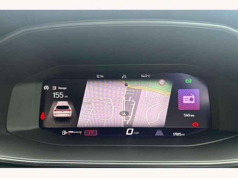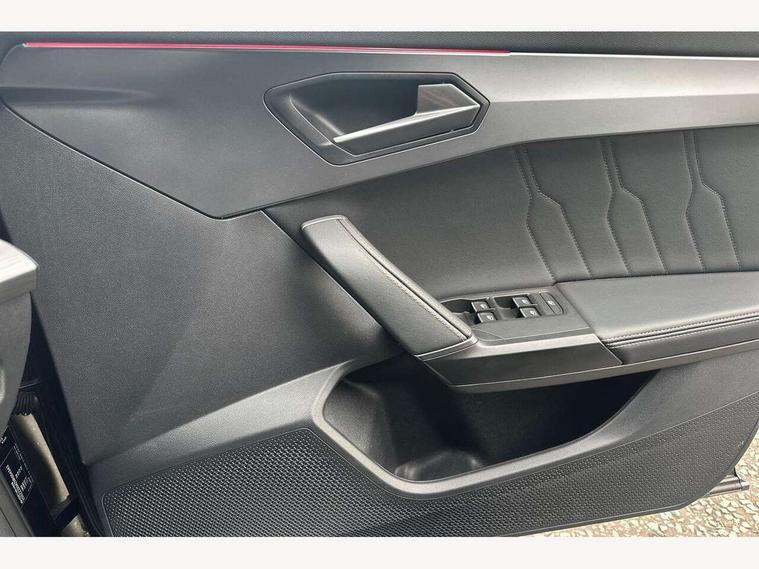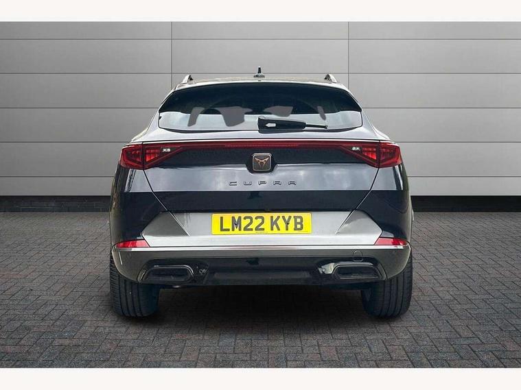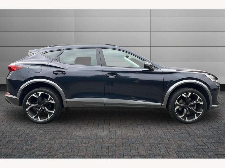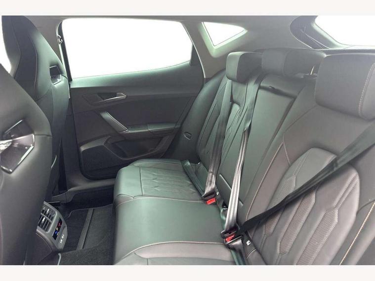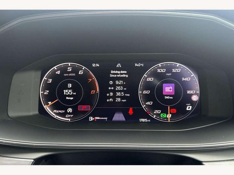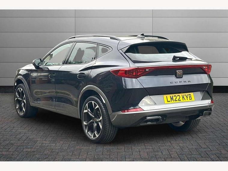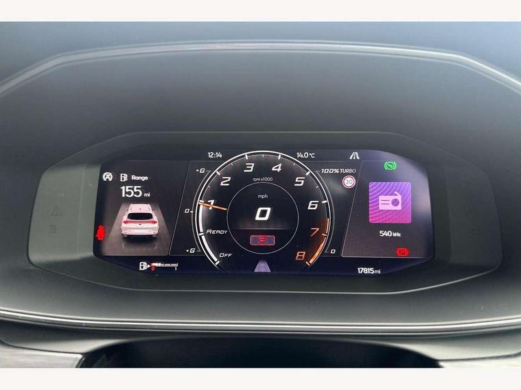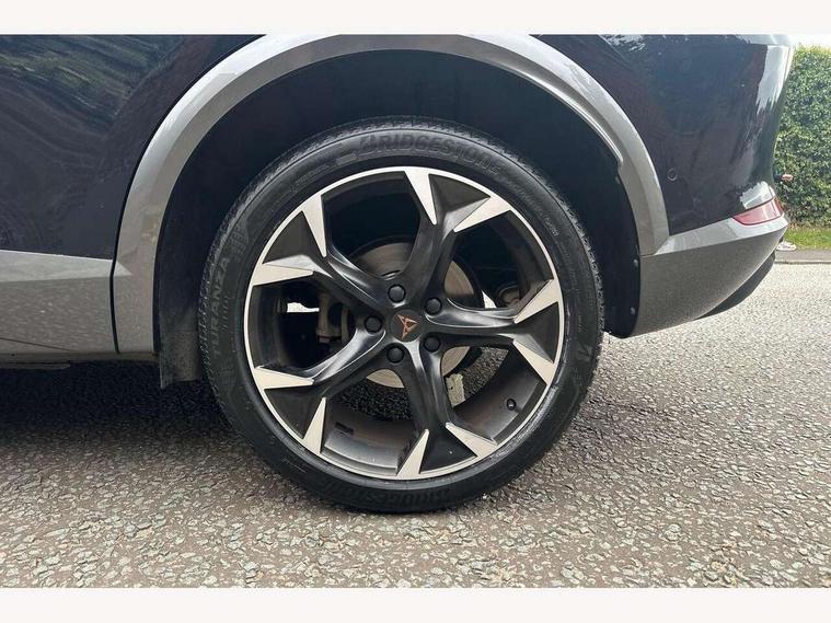 Digital cockpit and configurable dashboard, Driver alert system, Driving profile selection, E-call, Forward collision warning with automatic braking, Lane assist, Park assist (inc front/rear parking sensors), PAS, Predictive adaptive cruise control with speed limiter, Rear view camera, RPM, trip computer, outside temp gauge, instrument light brightness, low fuel warning light, lights on reminder, gearshift indicator, Service interval indicator, Start/stop system with regenerative braking, Wireless apple carplay, Wireless phone charger, Electronic locking differential and dynamic traction support, Standard suspension, 2 front and 2 rear USB type C sockets, Auxiliary input socket, DAB radio, Auto dimming rear view mirror, Body colour door handles, Body coloured bumpers, Dark grey wing mirror, Daytime running light with automatic headlight control and coming home feature, Dynamic headlight range control, Electric front/rear windows, Electrically adjustable heated and folding door mirrors with memory function, Front fog lamps with cornering function, Gloss black roof rails and window surrounds, LED Headlights, LED Taillights with dynamic indicator, Rain sensing wipers, Rear diffuser with black simulated exhaust pipes, Rear side wing doors, Rear wash/wipe, Third brake light, Tinted rear windows, Welcome lights, 12v power supply in centre console, 12V socket, 12v socket in loadspace, 2 front and 2 rear reading lights, 230V socket, 3 seat bench in 2nd row, 60/40 split rear bench seat with armrest and mechanical seat release, Dust/pollen filter, Front and rear head restraints, Front centre armrest, Height/reach adjust steering wheel, Illuminated interior front door sills, Illuminated sunvisor with mirror, Isofix, Leather multi function heated steering wheel with gear shift paddles, Luggage tie-down hooks, Single front passenger seat, Three zone climate control with control panel in rear, Variable luggage/load compartment floor, Wraparound lighting, Genuine Nappa leather Pack - Cupra, Navigation system pack with 10" navigation system - Formentor, 3 point seatbelts on all rear seats, ABS, Brake control system - ESC and brake booster, Child proof door locks, Driver and front passenger airbags with front passenger airbag de-activation, Electronic parking brake, Front and rear disc brakes, Front side curtain airbags, Hill hold control, Seat belt reminder for front and rear seats, Tyre pressure monitoring system, Anti theft alarm system, Keyless entry and start system (KESSY), Locking wheel bolts, Copper and aluminium interior detailing, 19" 'Exclusive' machined sport matte black and silver alloy wheels,
