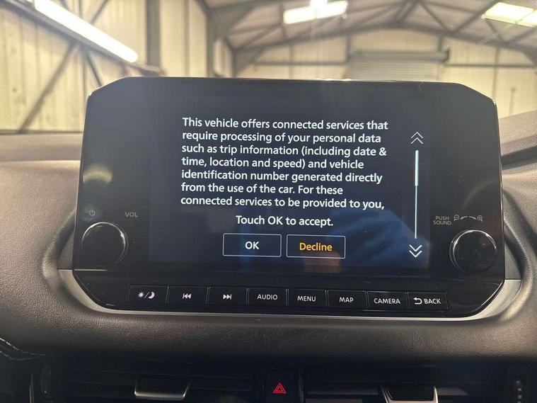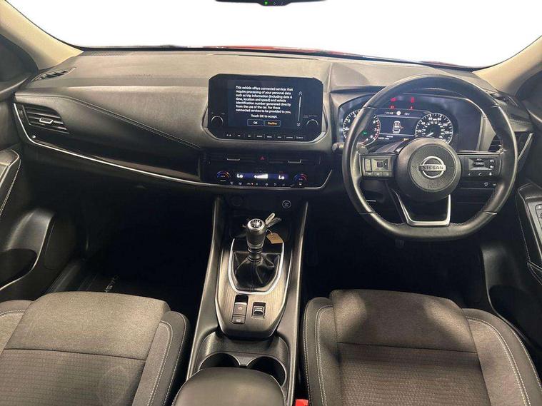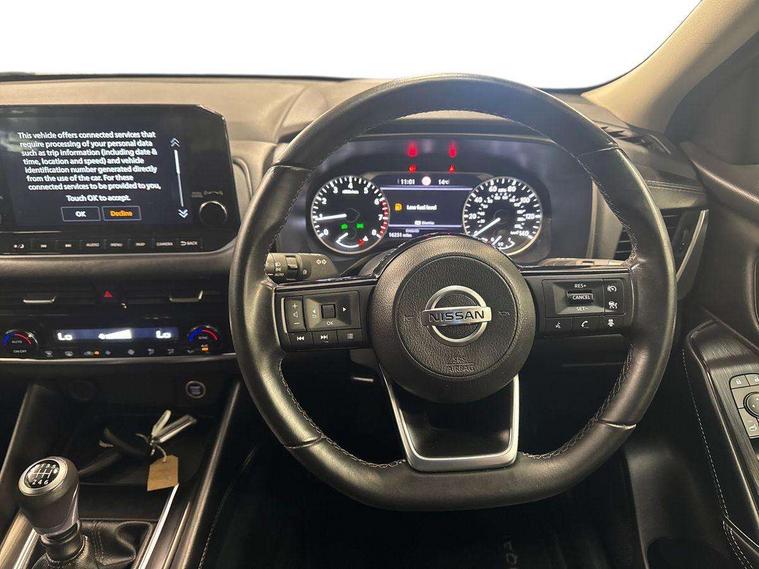 Android auto/Apple CarPlay (Wired), Blind spot warning, Drive modes (sport, normal, eco), Electric speed sensitive power steering, Emergency and breakdown call, Front and rear parking sensors, Full Digital 12.3" TFT Digital Combimeter, Google maps services - search, weather, 3D maps and Google street view, Idle stop/start system, Intelligent around view monitor, Intelligent Cruise control (ICC), Intelligent driver alert system, Intelligent forward collision warning, Intelligent lane intervention, Lane departure prevention, Lane departure warning system, Maximum speed limiter, Moving object detection, Nissan connect 12.3 inch touchscreen infotainment system, Nissan connect navigation, Push button starter, Rear cross traffic alert, Rear view camera, Remote control services - door locks, lights, horn and car locator, Telematics - notifications and connectivity services, TomTom live traffic services, Traffic sign recognition with legal speed adjustment, Trip computer, Virtual personal assistant and firmware over the air capability, Wireless apple carplay, 6 speakers, AM/FM audio system with DAB, Bluetooth audio streaming, Front USB connections (Type-A and Type-C), Rear USB charging only ports (Type-A and Type-C), Auto dimming rear view mirror, Auto rear wiper when reversing, Automatic hazard signal with emergency stop signal, Body colour mirror caps, Body coloured door handles, Bodyside mouldings, Chrome side window finisher, Door handle with button, Electric auto folding door mirrors, Electrically adjustable and heated door mirrors with LED turn indicator, Follow me home headlights, High beam assist, Intelligent auto headlights, LED daytime running lights, LED Headlights, LED rear lights, One touch front and rear electric windows with remote opening and closing, Partially body coloured bumpers, Privacy glass, Rear bumper with graphite insert, Rear reversing light (bulb lighting), Rear roof spoiler, Rear side wing doors, Rear styling plate, Shark fin antenna, Splash free rain sensing wipers, Super UV and infrared cut glass, Three blink turn signal, 12v power socket in dashboard and luggage, 2x Rear coat hooks, 3 bench rear seats in 2nd row, 3 rear headrests, 4 folding assist grip, 6 Luggage hooks - 4 on floor, 2 on side, 6-way manually adjustable driver's seat, 60/40 split folding rear seat bench, Ambient lighting around centre console, Centre console storage tray, Chrome interior door handles, Cloth monoform upholstery, Driver and front passenger sunvisors with illuminated vanity mirrors, Driver seat back pocket, Dual zone automatic climate control with pollen filter, Electrically adjustable lumbar support for driver, Front and rear door storage, Front centre console and armrest, Front cupholders x 2, Front door with bottle holders, Glovebox with light, Hard trunk cover, Height adjustable driver's seat, Height adjustable front headrests, Height adjustable passenger seat, Leather shift knob, Leather steering wheel, Luggage board system, Luggage space lighting, Manually adjustable passenger (slide recline + lifter), Multifunction steering wheel, Passenger seat back pocket, Rear armrest with 2 cupholders, Rear door bottle holders, Single front passenger seat, Soft PVC kneepad, Steering wheel switches, Sunglasses holder, Tilt/telescopic adjustable steering wheel, Two rear isofix child seat anchorage points with top tether, Welcome light and console tray ambient lighting, 3x3 point rear seatbelt pretensioners + load limiters, ABS with EBD and brake assist, Active brake limited slip, Auto hold function, Child locks on rear doors, Curtain and front side, far side airbags, Driver and passenger airbags, Driver, passenger and 2nd row rear seat belt reminder, Electronic parking brake, Front seatbelt pretensioners + load limiters, Height adjustable front seatbelts, Hill start assist, Intelligent blind spot intervention, Intelligent front emergency braking with pedestrian, cyclist recognition and junction assist, Intelligent rear automatic braking, Tyre pressure monitoring system, Vehicle dynamic control, Capless fuel filler, Engine immobiliser, Intelligent Key, Remote central door locking with deadlocking, Thatcham Cat.1 alarm, Interior instrumental panel B finisher, 18" Diamond cut alloy wheels, Tyre puncture repair kit,