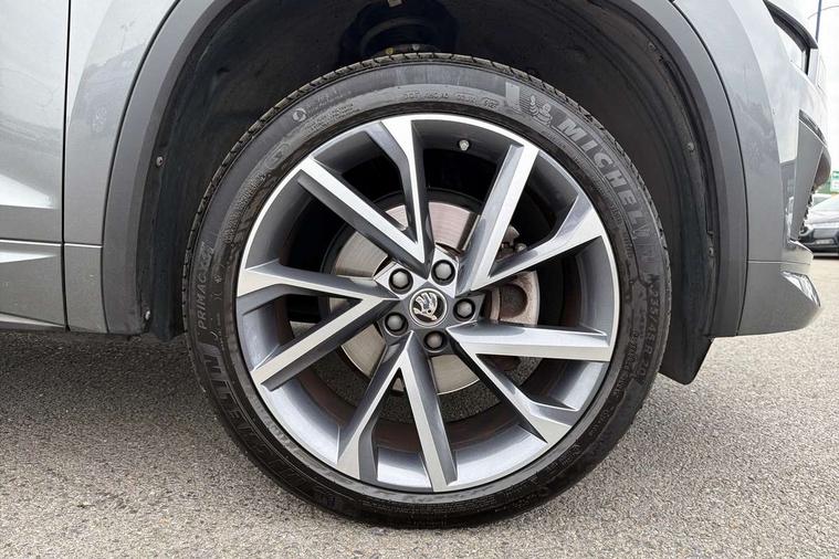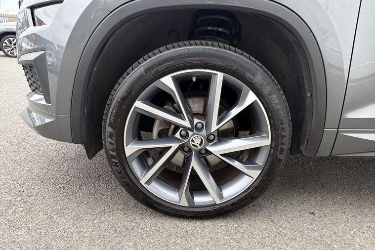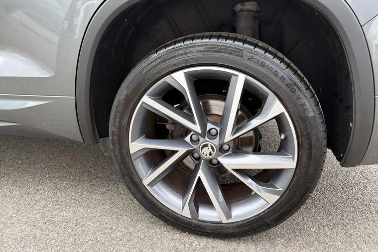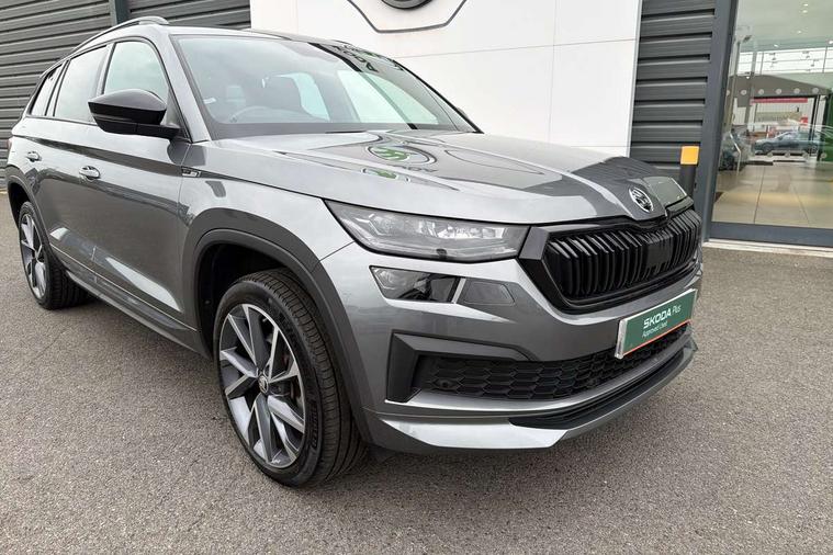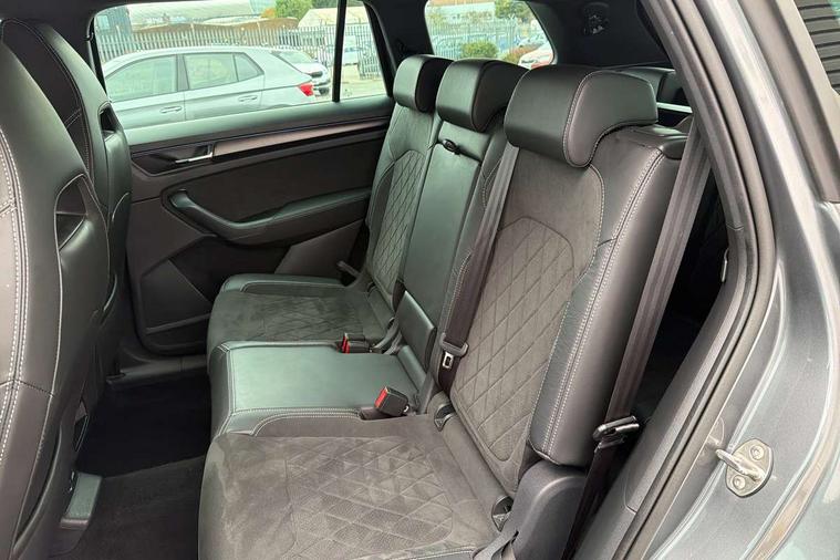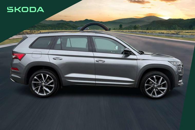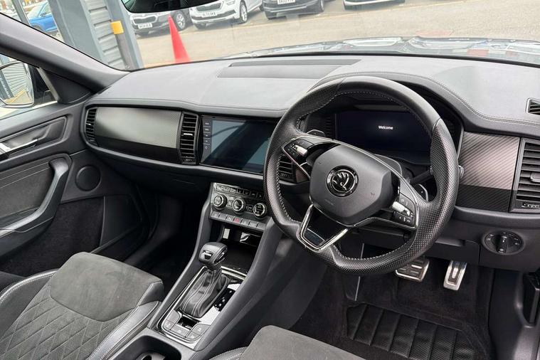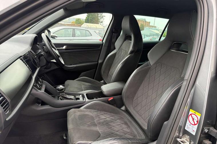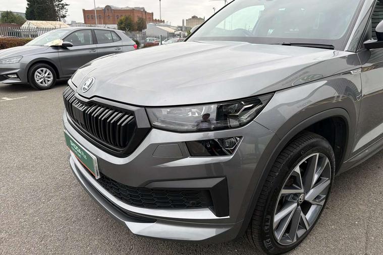 Bluetooth system, Columbus satellite navigation with 9.2" touchscreen, integrated Wi-Fi, web radio, Digital voice enhancement, e call+, ECO Stop/start function, Exterior temperature indicator, Progressive steering, Rear view camera, Smartlink wireless for apple carplay and wired for android auto, Speed limiter, Tailgate unlocking from outside, USB C Port x 2 in front centre console, Virtual Cockpit - 10.25" digital display with additional sports design, Wireless charging, 8 Speakers, DAB Digital radio, Aero front windscreen wipers with intermittent function, Aero rear window wiper, Auto dimming rear view mirror, Black roof rails, Black sports styling including front grille and window surrounds, Black wheel arch surrounds, Body colour bumpers, Body colour door handles, Electric adjustable/heated/folding door mirrors, driver side auto dimming with boarding sports and memory function, Electric front and rear windows, Extended rear spoiler with finlets in gloss black, Front fog lights, Full LED matrix headlights with AFS (adaptive front light system), cornering function and AWL (all weather lighting system), Gloss black door mirrors, Headlight washers, Heated rear window, Invisible tailpipe, LED daytime running lights, LED rear fog light, LED third brake light in rear spoiler, Light assistant (coming/leaving home/tunnel light), Off-road style lower front bumper element, Privacy glass, Rain and light sensors, Rear diffuser, Rear LED lights (high functionality) with welcome effect and dynamic indicators, Rear side wing doors, Safety reflectors on front and rear doors, Sportline badge on front fender, Sports front and rear bumpers including lower rear chrome strip, Tailgate lettering in Black, Window control switches with black trim, 12V socket in boot, 2 rails with 2 hooks, 2 seat bench in 3rd row, 3 seat bench in 2nd row, 4 foldable roof handles with rear coat hooks, 60:40 foldable rear seat with sliding adjustment and backrest angle adjustment, Aluminium pedals, Black roof headlining, Bottle holders in door panel in the 1.5 litre front and 1 litre rear, Cargo storage compartments, Chrome headlight control button, Chrome interior door handles, Coat hooks on B pillar, Covered storage compartment on driver side, Decorative door sill covers, Front and rear door armrest with black adductor trim, Front centre armrest with storage compartment, cup holder and 12V socket, Front courtesy lights, Gear shift lever with chrome frame and black gloss insert, Grey stitching in front and rear armrests and door armrests + door inserts, Height adjustable front headrests, Illuminated and cooled glovebox, Illuminated luggage compartment, Isofix child seat fittings in outer rear seats with top tether, Manually adjustable steering column, Microsuede door panels, Net programme in boot (1x horizontal Net, 2x vertical Nets), Overhead glasses storage compartment, Pollen filter, Rear centre armrest with cupholders, Single front passenger seat, Sliding trunk cover, Small Bags on the inner sides of the front backrests, Sports seats, Sunvisors with illuminated vanity mirrors, Three rear height adjustable headrests, Ticket holder on A Pillar, Umbrella in door panel, Variable boot floor, LED Interior light pack - Kodiaq, Auto door release and activation of warning lights in the event of an accident, Child locks on rear doors, Driver and front passenger airbag with knee airbag and front passenger airbag deactivation, Electronic parking brake with hill start assist, Emergency rear braking signal, ESC (incl. ABS+MSR+ASR+EDS+HBA+DSR+RBS+MKB), Front assist with autonomous emergency braking, Front side airbags with curtain airbags, Fuel cut off safety device, Height adjustable front 3 point seatbelts + pretensioners, Hill hold control, Rear disc brakes, Safety vest holder in door, Seat belt reminder for all seats, Three point rear seat belts, Two tone horn, Tyre pressure monitor, Alarm with interior monitoring and tilt sensor with safe function, Anti-theft wheel bolts, Immobiliser, Keyless entry and start system (KESSY), Remote central locking with 2 keys, Black air vent surround, Carbon finish dashboard and door inserts, Grey stitching in dashboard, 20" Vega Anthracite alloy wheels, Temporary spare wheel (space saver),