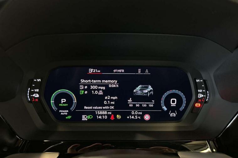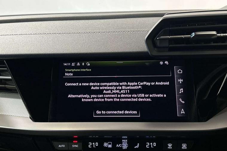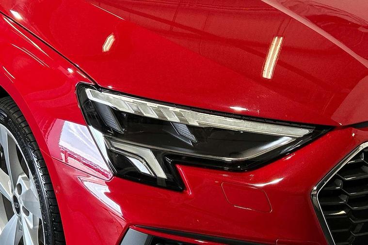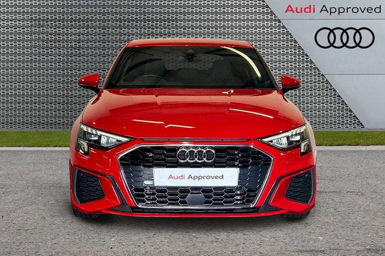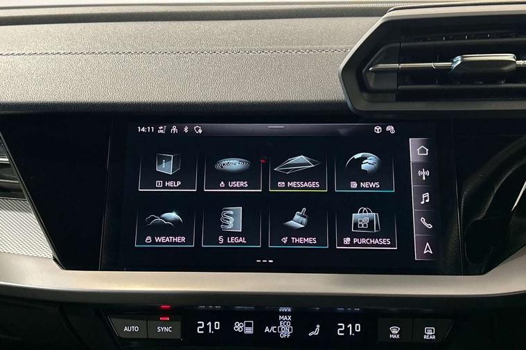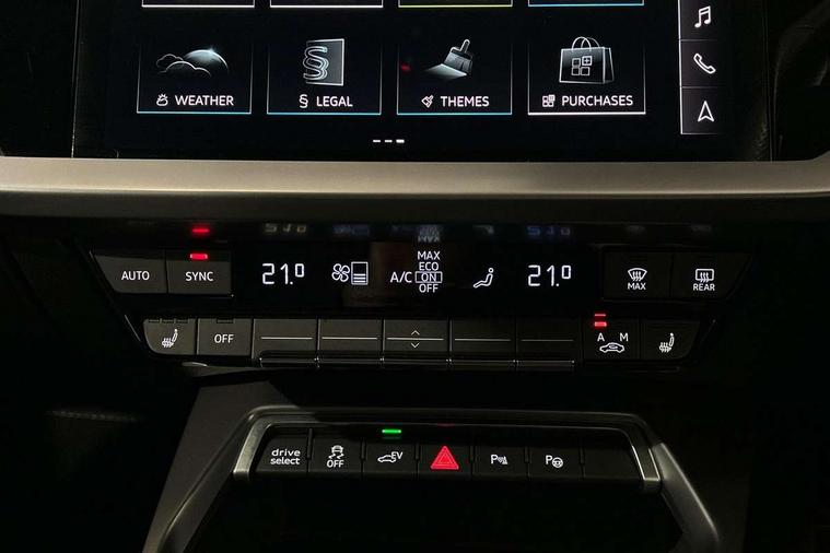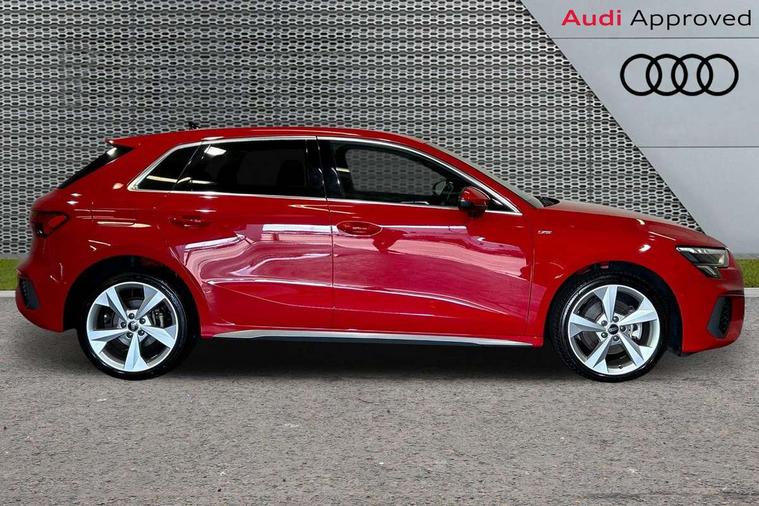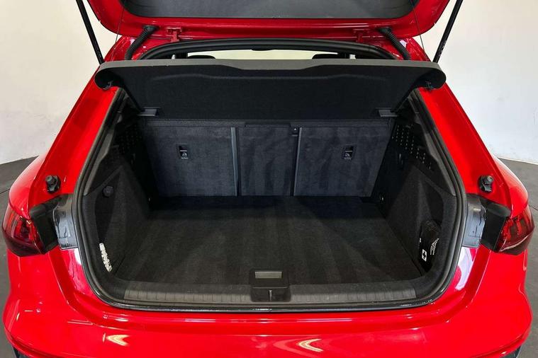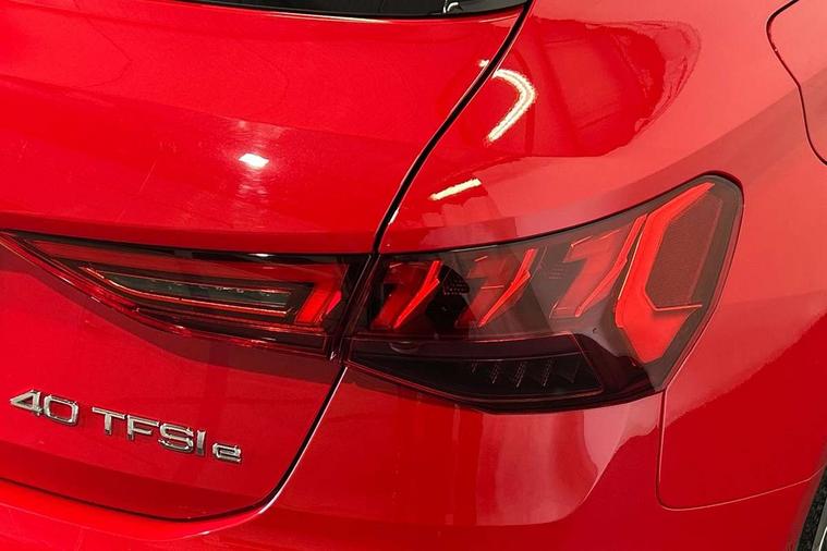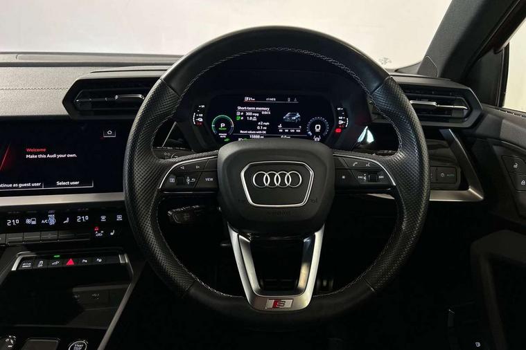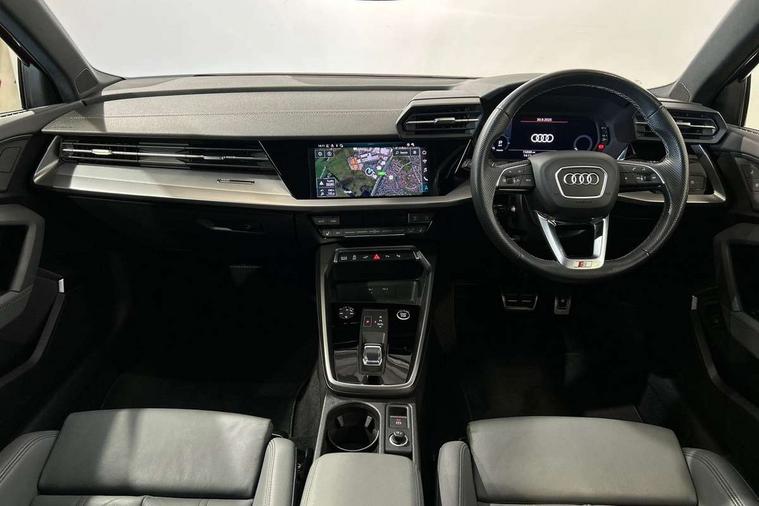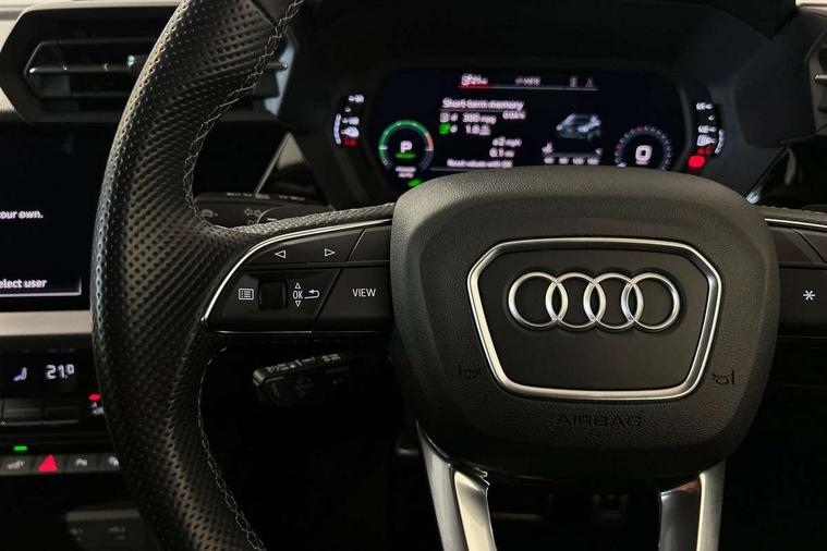 Audi drive select (Auto, Comfort, Dynamic, Efficiency and Individual), Audi smartphone interface, Audi Virtual Cockpit - 10.25" digital and colour instrument cluster, Automatic start/stop system with recuperation, Bluetooth interface, Camera based traffic sign recognition, Collision avoidance assistant, e-Call (emergency call), Electromechanical power speed sensitive steering, Lane departure warning system, MMI Navigation Plus with high resolution 10.1" colour touch screen display, Service indicator, Trip computer, Voice control system with natural language interaction, 3 pin 10 amp domestic charging cable, 3.6 kw On-board charger, Standard suspension, Type 2 mode 3 32 amp charging cable, Type 2 socket for AC charging, 2xUSB-C connection with data and charging functions, 6 passive loudspeakers, DAB Digital radio, 3rd brake light, Acoustic glass windscreen, Aluminium window trim, Auto dimming frameless rear view mirror, Body colour exterior mirrors, Electrically adjustable/heated/folding/dimming door mirrors with kerb view includes integrated LED indications + kerb view function for passenger side, Front electric windows, Illuminated aluminium inserts front door sills with S logo, LED daytime running lights, LED headlights with LED rear lights and dynamic rear indicators, Light and rain sensors, Privacy glass - dark tinted rear window, rear door and side windows, Rear electric windows, Rear side air outlets in grained matt black, Rear side wing doors, Rear wiper, S line bumpers, S roof spoiler, 12V socket and storage compartment in front centre console, 3 seat bench in 2nd row, 3 spoke leather multifunction steering wheel with paddle shift, 4 way electrically adjustable lumbar support for driver and front passenger, 60/40 split folding rear seat bench, Black cloth headlining, Dual zone electronic climate control, Front and rear centre armrest in leather, Front and rear headrests, Front/rear floor mats, Height and reach adjustable steering wheel, Interior lighting - glove compartment light and right hand side, Luggage compartment floor covering, Manual boot compartment lid, Manually adjustable front seats, Seat side bolsters, Single front passenger seat, Stainless steel pedals and front footrest in black, Tool kit, Twin leather upholstery with front sports seats S embossed logo, Aluminium interior elements pack - A3 Sportback, LED interior lighting pack - A3 Sportback, S line styling pack - A3 Sportback, 3x3 point rear seat belts, Driver and front passenger airbag with passenger airbag deactivation, Electronic Stabilisation Control (ESC) including ABS, ASR and EDL, First aid kit with warning triangle and 2 safety vests, Front side airbags with head airbags and interaction airbag, Pre-sense front with pedestrian and cyclist detection, Seatbelt monitoring, Tyre pressure loss indicator, Anti theft alarm, Anti-theft wheel bolts, Electronically operated child lock, Immobiliser, Remote control central locking, Dark spectrum aluminium inlays, accent surfaces in the dashboard and centre console in platinum grey silk effect paint finish, Tyre repair kit,