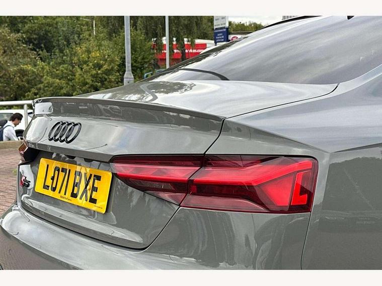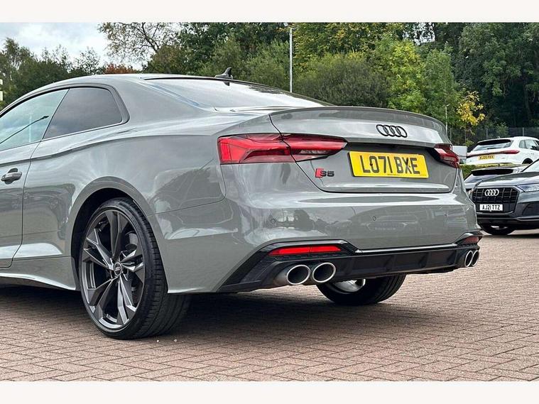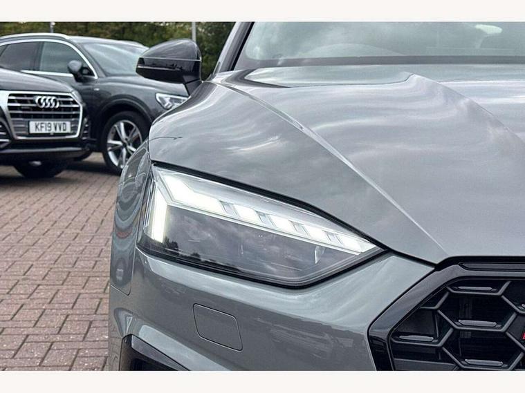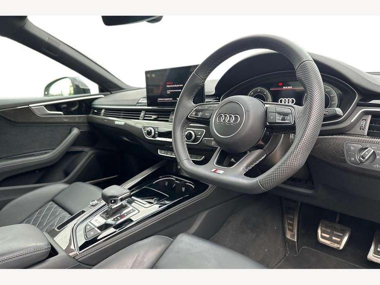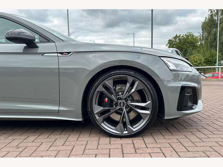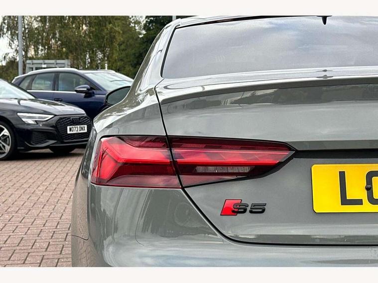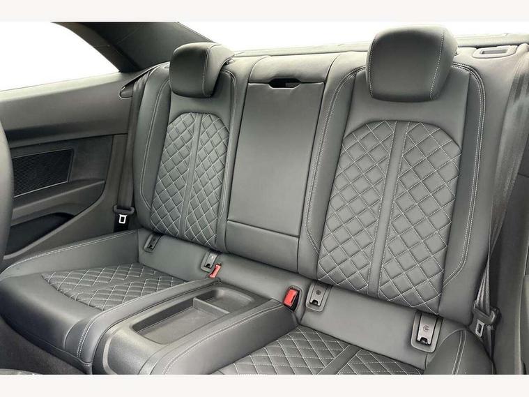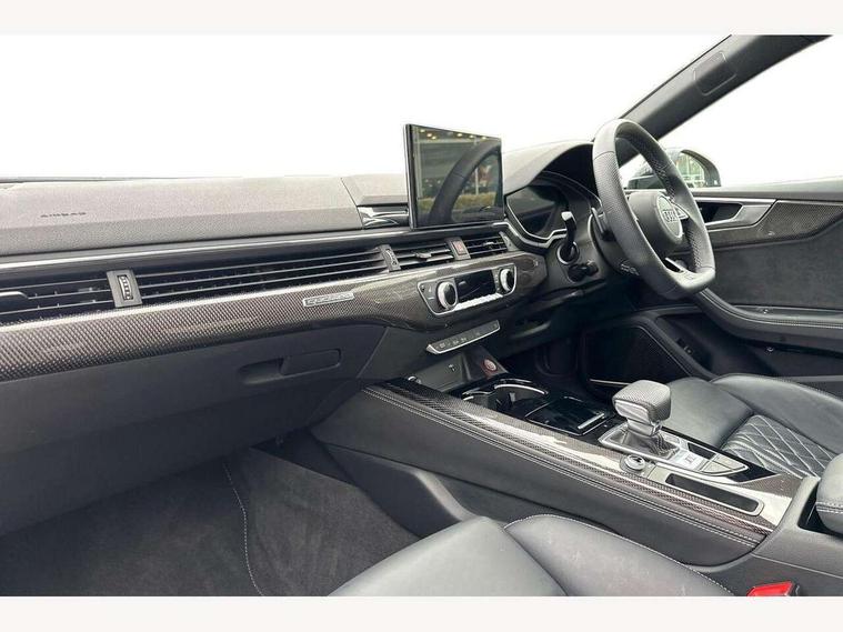 Audi connect safety and service (e-call), Audi connect with Amazon Alexa Integration, Audi drive select (Auto, Comfort, Dynamic, Efficiency and Individual), Audi parking system plus with front and rear sensors, Audi smartphone interface, Audi virtual cockpit - 12.3" full colour digital instrument cluster, vehicle/engine speed, Radio/media information+Driver assistance systems, Automatic start-stop system with coasting functionality and efficiency programme, Bluetooth interface, Electric boot lid release, Electro-mechanical power steering, Email, calendar and text messages displayed via MMI, MMI nav+ with MMI touch - 10.1" high resolution MMI display, touch sensitive, 3D map, route/country info, dynamic route guide, personal route assist, Rear view camera, S instrument dials, Service interval indicator, Voice control system, Diesel particulate filter, S sports suspension, Audi sound system with 10 loudspeakers, CD player, DAB digital radio reception, Two additional USB ports for rear passenger in rear centre console, Two SDXC card slots, Audi Beam uses LEDs to project the Audi logo, Audi matrix LED headlights with LED rear lights + dynamic front and rear indicators, Auto dimming rear view mirror, Black door mirror housings, Body colour door handles, Body colour front spoiler lip, Body colour side sill trim, Electric adjustable heated door mirrors, Electric folding door mirrors, Electric front windows, Front fog lights, LED daytime running lights, LED third brake light, Privacy glass, Rain and light sensors, Rear side wing doors, S line front and rear bumpers with side skirts, S model rear spoiler in black, S radiator grille in twilight grey matt with dual struts in aluminium and S5 logo, S rear diffuser in twilight grey matt and honeycomb grille in black, S specific dual branch chrome tailpipes with twin oval pipes on left and right, S specific side air inlets in titan black with chrome inlays in unique S design, Variable front intermittent wipers, Windscreen with acoustic glazing, 40/20/40 split folding 2 seater rear seat bench with rear centre armrest, Adjustable steering column, Black cloth headlining, Black leather gear lever knob, Contrast stitching on seats, steering wheel and gear lever gaiter, Deluxe 3 zone electronic climate control, Electrically adjustable front seats, Fine nappa leather upholstery with S embossed logo + super sports seats, Front centre armrest, Front head restraints, Front/rear floor mats, Gear lever with diamond S badge, Heated front seats, Illuminated door sill trim with S logo, ISOFIX child seat mounting and top tether, Key with S5 logo, Luggage compartment mat, Pneumatically adjustable lumbar support with massage function, Rear headrests, Single front passenger seat, Stainless steel pedals, Sunvisors with vanity mirrors, Black styling pack - A5 Coupe/Sportback, Extended leather pack - A5, LED interior light pack - A5/RS5, 2 x 3-point rear seatbelts, 6 airbags - Driver, front passenger, curtain and side airbags, Electromechanical parking brake, Electronic Stabilisation Control (ESC) including ABS, ASR and EDL, Front brake calipers painted in black with S5 logo, Front passenger airbag deactivation, Height adjustable front seatbelts, Hill hold assist, Multi collision brake assist, Pop-up bonnet for pedestrian protection, Pre sense city, S model enhanced braking system, Seatbelt monitoring, Tyre pressure warning, Variable restraint system, Warning triangle and first aid kit, Anti theft alarm system, Anti theft wheel bolts, Immobiliser, Keyless Go, Remote central locking, 20" 5 twin spoke polygon design alloy wheels in gloss anthracite black and gloss turned finish, Tool kit, Tyre repair kit,
