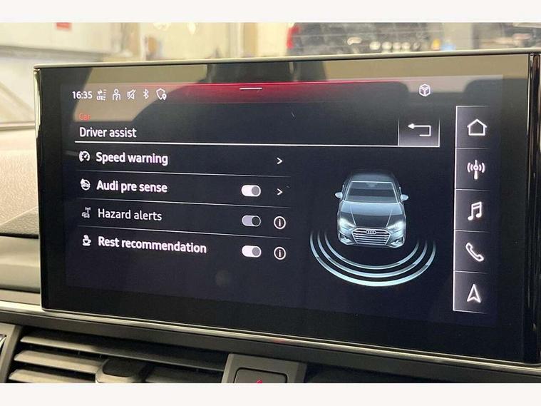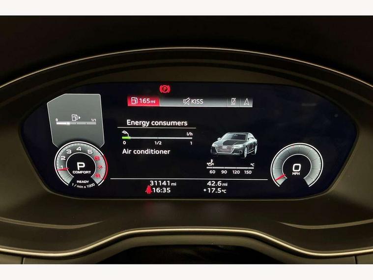 Audi connect safety and service (e-call), Audi connect with Amazon Alexa Integration, Audi drive select, Audi parking system plus with front and rear sensors, Audi smartphone interface, Audi virtual cockpit, Automatic start-stop system with coasting functionality and efficiency programme, Bluetooth interface, Cruise control system with speed limiter, Electric boot lid release, Electromechanical power steering, Email, calendar and text messages displayed via MMI, MMI Navigation plus with MMI touch includes 10.1" high resolution colour MMI display, 3D map, Rear view camera, Voice control system, 54 litre fuel tank, Comfort dynamic suspension, 2 USB charging ports, 8 passive loudspeakers, DAB digital radio reception, Auto dimming rear view mirror, Body coloured door mirrors, Electrically folding auto dimming/adjustable/heated door mirrors with LED side indicators and kerb view function for passenger side, LED headlights and rear lights with LED daytime running lights, LED third brake light, New design rear diffuser, Rain and light sensors, Rear boot, Rear side wing doors, Variable intermittent front wash/wipe, Windscreen with acoustic glazing, 3 spoke high multi-function leather sport steering wheel with paddle shift and height and reach adjustable, 4 way electric lumbar support for driver and front passenger, 40/20/40 split folding 3 rear seat bench in 3 parts with rear centre armrest, Deluxe 3 zone electronic climate control, Door sill trims with aluminium inlay, Front and rear head restraints, Front centre armrest, Heated front seats, Interior lighting, ISOFIX child seat mounting and top tether, Manual seat adjustment, Single front passenger seat, High gloss package - A4, 3 rear seatbelts, 6 airbags - Driver, front passenger, curtain and side windows, Electronic Stabilisation Control (ESC) including ABS, ASR and EDL, Hill hold assist, Multi collision brake assist, Pop-up bonnet for pedestrian protection, Pre sense city, Rear door child safety locks, Seatbelt monitoring, Warning triangle and first aid kit, Anti theft alarm, Anti theft wheel bolts, Central locking, Keyless Go, Tool kit, Tyre repair kit,
