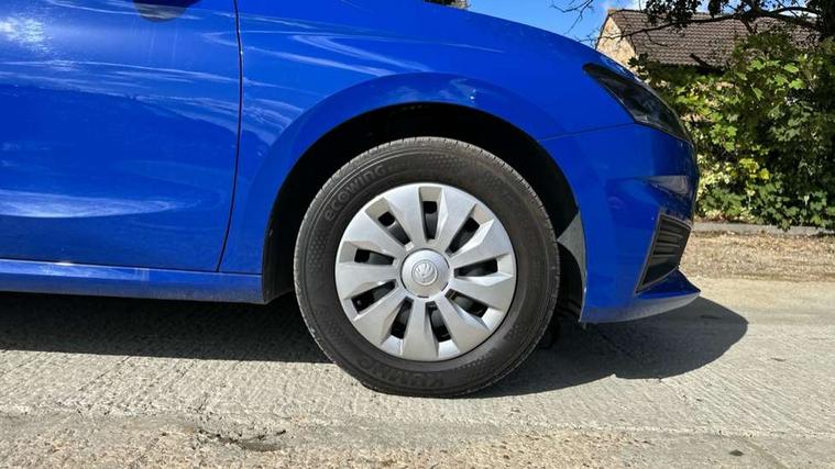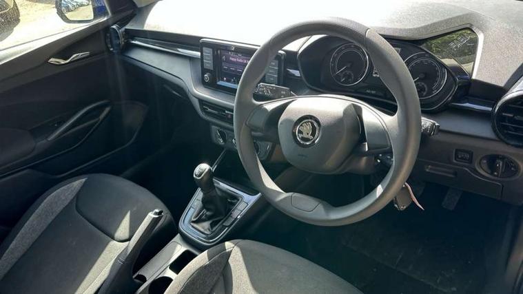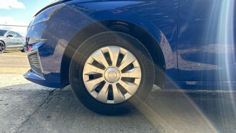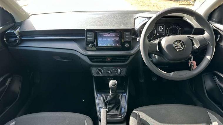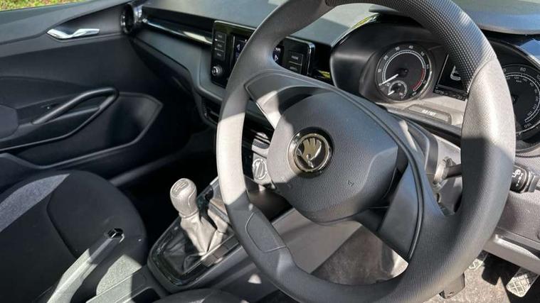 Bluetooth connection, Driver alert system - DAS, Electromechanical power steering, Exterior temperature gauge, Lane assist including road edge detection, Multifunction trip computer in black and white, Service interval indicator, Speed limiter, 2x USB-C in the front (for data transmission and charging), 4 speakers in front, Auxiliary socket for external MP3 player, DAB digital radio reception, Radio Swing with 6.5" colour display, Basic LED Headlights, Basic rear lights, Body colour door mirrors, Body coloured bumpers, Dimming rear view mirror with black frame, Door mirror integrated indicators, Electrically adjustable and heated door mirrors, Electrically adjustable front windows with function auto up/down, Front window wiper intermittent control, Headlight range control - Automatic, Ice scraper in fuel cap, LED daytime running lights with coming and leaving home feature, Mechanical adjustable rear windows, Rain sensor, Rear LED fog light, Rear side wing doors, Rear window wiper with washing nozzles, Roof mounted spoiler, SKODA tailgate lettering in chrome, Third brake light, 2 reading lights in front and 2 reading lights in rear, 2 spoke plastic steering wheel, 3 rear headrests, Backrest split and folding, Central console with fixed cup holder and storage box, Fabric upholstery, Gearshift knob/handle in plastic, Grain satin black interior door handles, Hand brake lever in plastic, Height adjustable drivers seat, Height adjustable front headrests, Height adjustable steering wheel, ISOFIX and TopTether anchorage points to the outer rear seats, ISOFIX and TopTether on the front passenger seat, Luggage compartment lighting, Manual air conditioning, Pollen filter, Rear seat bench unsplit, Single front passenger seat, Storm grey headlining, Sun visors with mirror and airbag label on passenger side, Ticket holder, 3-point height adjustable front seats belts with pretensioner and force limiter, Automatic warning lights in case of crash, Driver and passengers airbag with switch off function, e-Call+, ESC including ABS, MSR, ASR, EDS, HBA and XDS, Front and rear seat belt warning, FRONT ASSIST (AEB City and AEB Inter Urban), Front side airbags, Head airbags, One tone horn, Pedestrian protection, Three rear 3-points safety seat belts with pretensioner and force limiter including stop function for outer rear seat belts, Tyre pressure monitoring system, Anti-theft alarm system including immobiliser, interior monitoring, backup horn, and towing protection, Central locking with radio remote control, interior controls, SAFE function and 2 foldable keys, Black painted air vents, Glossy black decorative trim, Grain satin black central console cover, Grain satin black lower decorative trim, Satin black door and side trim panel in front, 15" Calisto silver steel wheels, Standard wheel bolts, Super-low rolling resistance tyres,