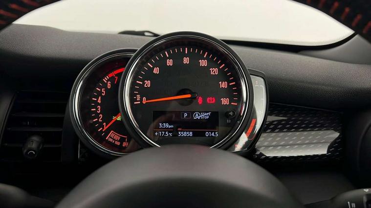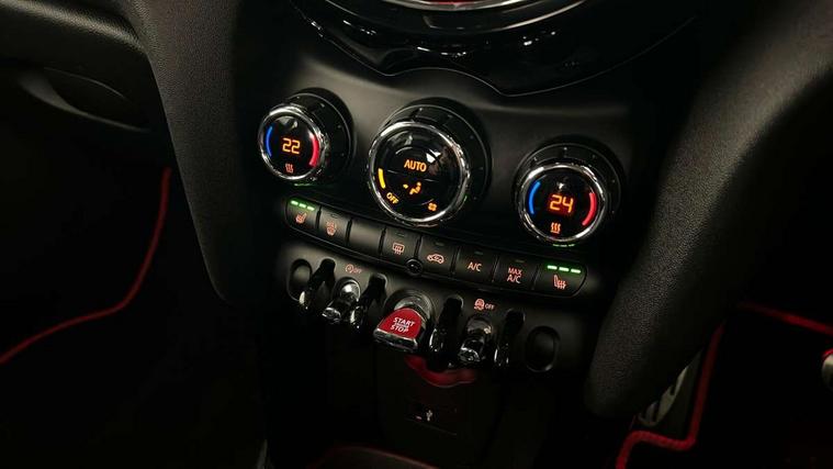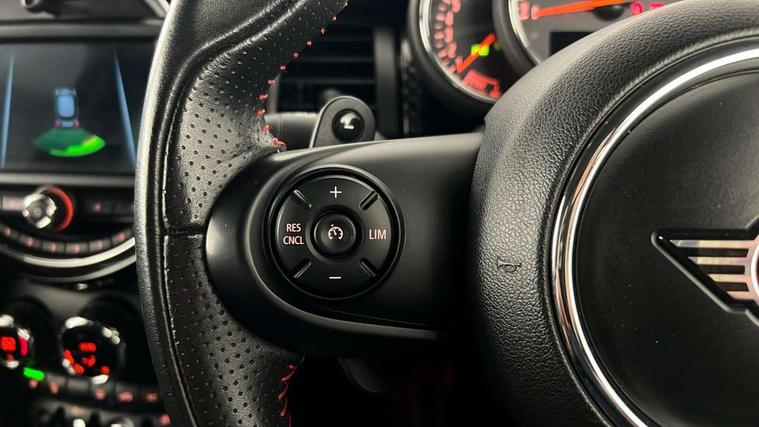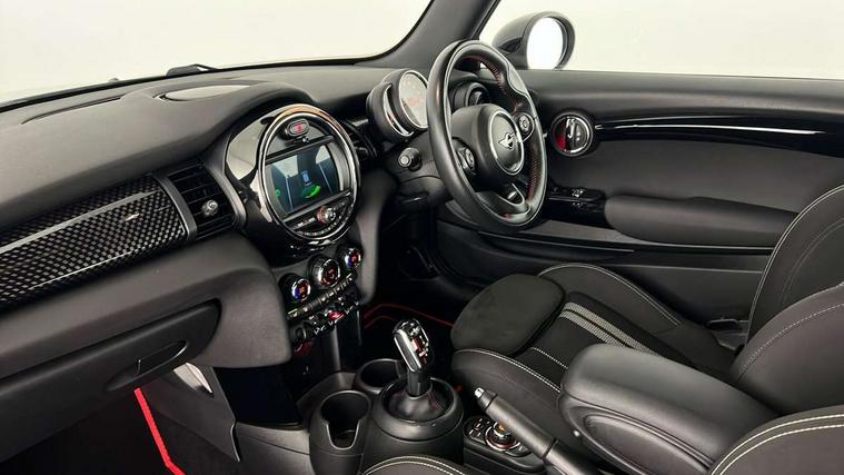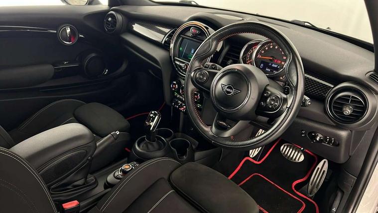 Compatible mobile phone bluetooth with audio streaming, Instrument cluster, Mini E-call, MINI TeleServices, On board computer, Service interval indicator, Performance Control, Steptronic sport transmission with double clutch and steering wheel paddles, 6.5" touchscreen with LED ring, FM tuner and DAB digital radio, Automatic headlight activation switch, Bonnet scoop, Chrome border honeycomb structure radiator grille with S badge, Chrome plated fuel cap, Dynamic brake lights, Electric front+rear windows, Heated rear window, Heated windscreen washer jets, John Cooper Works - aerodynamic kit (front and rear apron, spoiler), front and rear sport bumpers and part-painted side sills with door sill finishers, John Cooper Works rear spoiler, LED headlight with closed ring and daytime driving lights, Metal door sill strips with Cooper S imprint, Model logo Cooper S on right of tailgate, Rain sensor window wipers, Rear fog lights, Rear LED lights with union jack design, Rear window wiper, Side scuttle panel with integrated indicator, Sun/heat protection glass, Two central exhaust tailpipes with chrome finisher, White indicator lenses, 12V Accessory socket in centre console, 4 lashing eyes in luggage compartment, 60/40 split folding rear seat, Anthracite headlining, Chrome interior highlights, Cupholders, Front and rear isofix with front passenger airbag deactivation, Glove compartment, Height and length steering column adjustment, Interior lighting with 12 basic colours selectable via toggle switch in roof, John Cooper Works leather steering wheel with contrasting stitching in Chilli Red with John Cooper Works logo, John Cooper Works Logo in seat, Leather gearshift lever and handbrake gaiters, LED reading lights, vanity mirror lights, front foot well light and spotlight on front seats, Manual air conditioning, Mechanical seat adjustment, driver seat height adjust, forward/back and front seats backrest, Mini logo projection on floor from drivers exterior mirror, Multifunction steering wheel, Storage compartments in doors, Storage pocket on back of front seats, Sunvisors with vanity mirrors, Tool kit, 3 point seatbelts on all four seats, 6 Airbags - front, side, head and seat belt tensioners, Anti-lock braking system (ABS), DSC - Dynamic Stability Control, Front and rear disc brakes, Hill start assist, Two tone horn, Tyre pressure monitoring system, Alarm system with tilt sensor, monitoring doors, bonnet interior and tailgate, Electronic vehicle immobiliser, Start/stop toggle with keyless go,