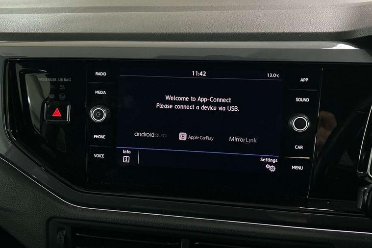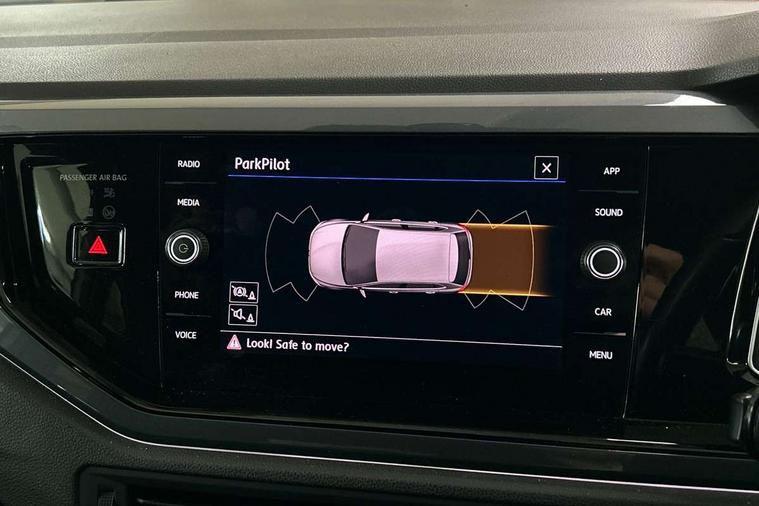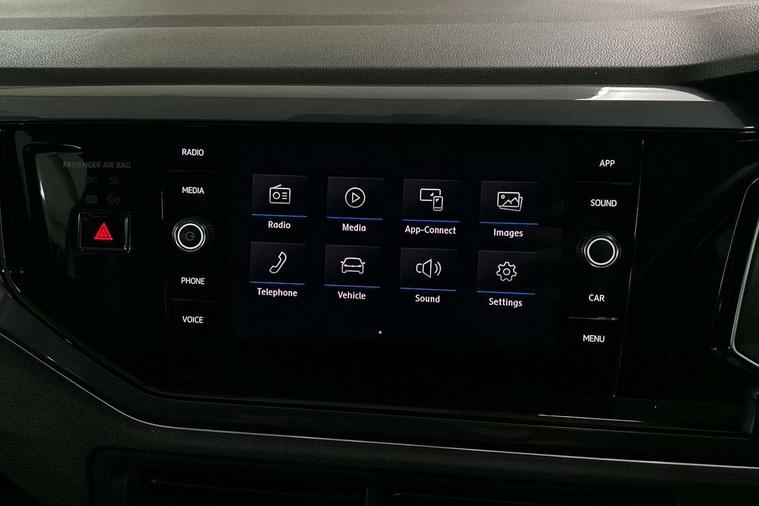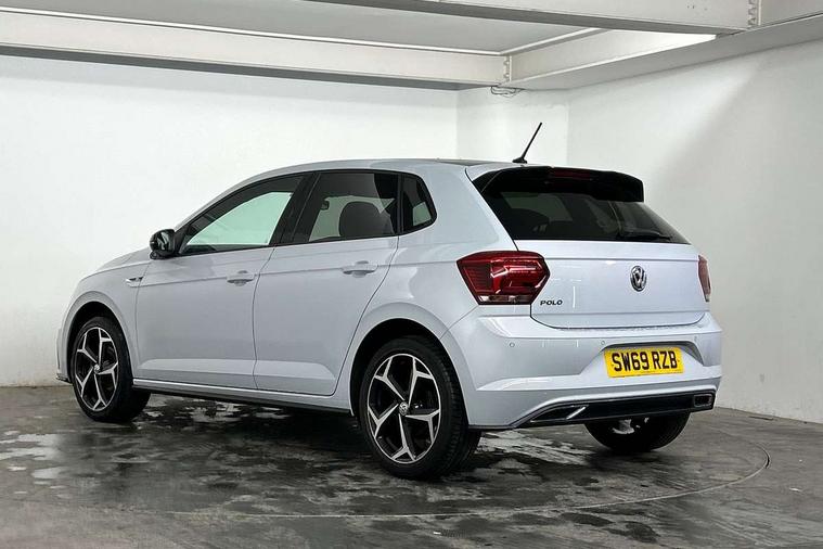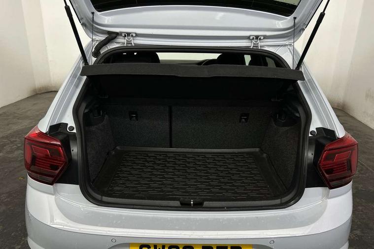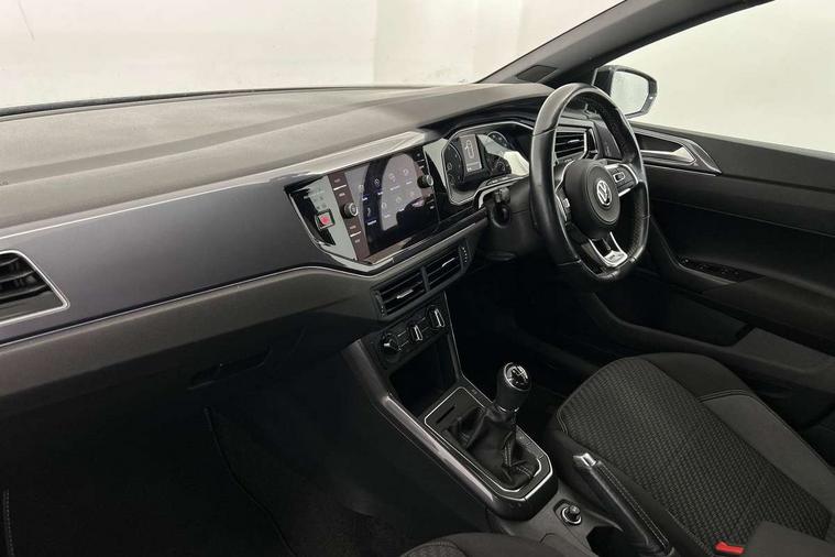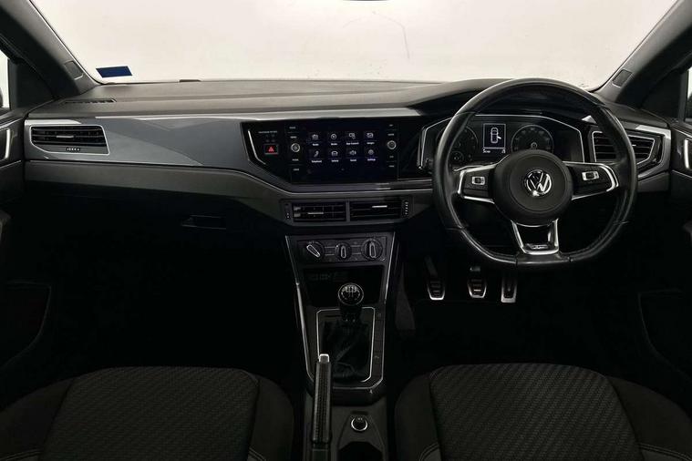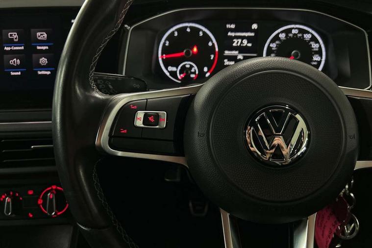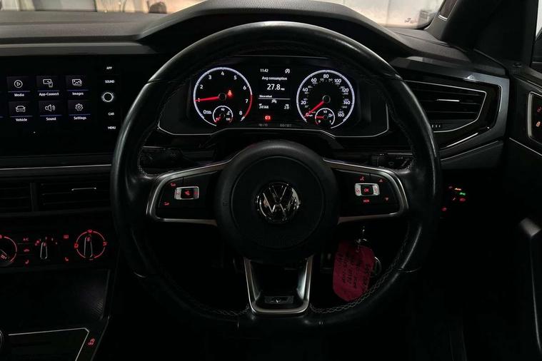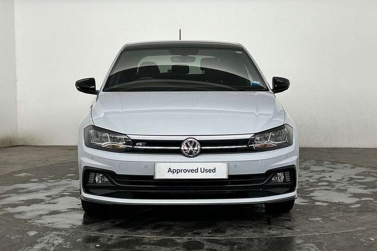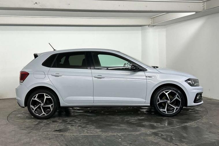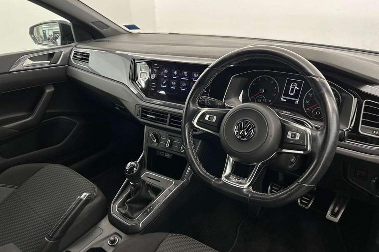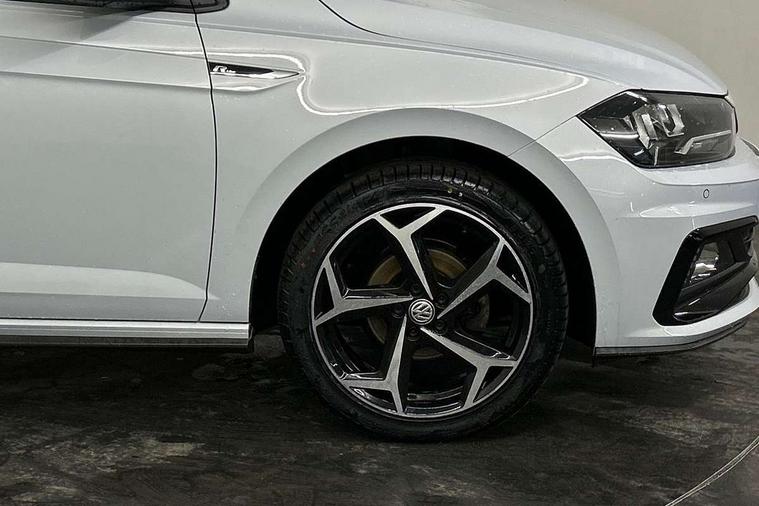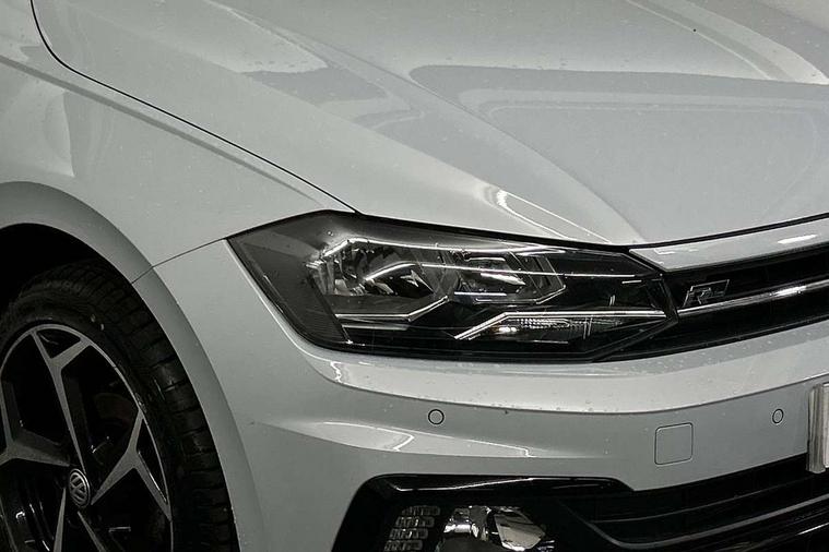 App-Connect, Digital clock, Driver alert system, Lights on warning, Multifunction computer plus, Power assisted speed sensitive steering, Speedo and rev counter, electronic odometer, trip, service interval display and fuel gauge, Start/stop system, Volkswagen connect, Warning buzzer and light for front seatbelts unfastened, Battery regeneration during braking, Galvanished body, Black grille with chrome surround, Body colour door handles, Body coloured side sills, Chrome trimmed strip on lower bumper, Electric front windows, Electrically foldable, adjustable and heated door mirrors with reverse activated kerb view adjustment on passenger's side, Front fog lights including static cornering, Front windscreen washers and wipers with 4 speed intermittent delay, Heated rear window with auto timer, High level 3rd brake light, LED darkened rear light clusters, LED daytime running lights, LED rear number plate lights, Left and right chrome effect trapezoid fascia exhaust tailpipe surrounds, Rear diffuser, Rear electric windows, Rear windscreen washer and wiper with interval delay, reverse activated, Unique R Line badging, 2 bag hooks in luggage compartment, 2 front cupholders and 12 V socket with cover, 3 rear head restraints, 60/40 split folding rear seat, Ambient lighting in front foorwell, front/rear door and dashboard light strips, Carbon flag cloth upholstery, Centre console storage with open storage compartment, Chrome-plated electric mirror adjustment switch surround, Chrome-plated electric window button surround, Driver and front passenger seat height adjustment, Driver and front passenger sunvisors with illuminated vanity mirrors, Dust/pollen filter, Folding rear seat backrest, Front + rear carpet mats, Front centre armrest with storage compartment, Front head restraints, Front seat backrest storage pockets, Front sport seats with lumbar adjustment and R line logo on seat backrest, Gear lever gaiter in black trim surround, Glovebox, Handbrake grip button in chrome effect, Height/reach adjustable steering column, Instrument lighting, adjustable panel illumination, Interior light with delay, Isofix Preparation 2 Rear child seats, Jack and tool kit, Leather gear knob and handbrake grip, LED interior lighting - 2 reading lights front and rear with interior delay and dimming function, Luggage compartment cover, removable, Luggage compartment lighting, Luggage compartment with variable load floor, Stainless steel pedals, Storage compartment in front doors, Storage compartment in rear doors, Storage compartment under front seats, Three spoke leather trimmed multifunction steering wheel with aluminium inserts and R Line Logo, Titanium black roof lining and sun visors, Unique R Line door sill protectors, Light and sight pack - Polo, R Line styling pack - Polo, 3 point height adj front seatbelts + pretensioners, 3x3 point rear seatbelts, ABS, Automatic post collision braking, Driver/front passenger airbag, Drivers and front passengers safety optimised head restraints, ESP with EDL + ASR, Front and rear passenger curtain airbags, Front passenger airbag deactivation, Front seat side impact airbags, Front/rear disc brakes, Hill hold control, Hydraulic Brake Assist (HBA), Single tone horn, Tyre pressure monitoring system, Alarm with interior protection and deactivation via infotainment system, Electronic engine immobiliser, Remote central locking with 2 remote folding keys, Chrome plated air vent surround, Chrome plated instrument surrounds, Shadow steel decorative inserts, Steel space saver spare wheel,