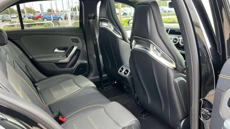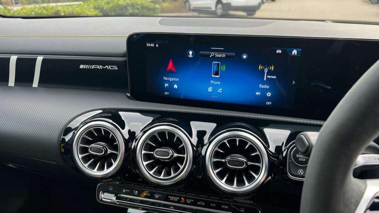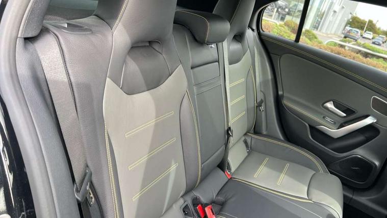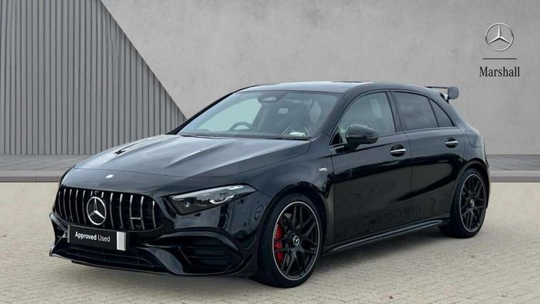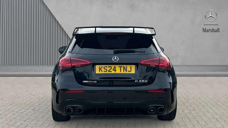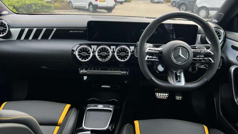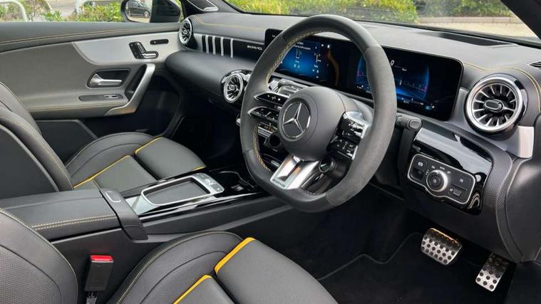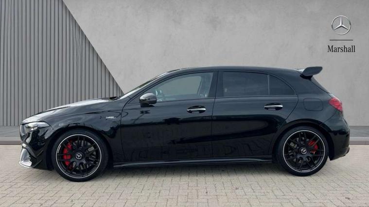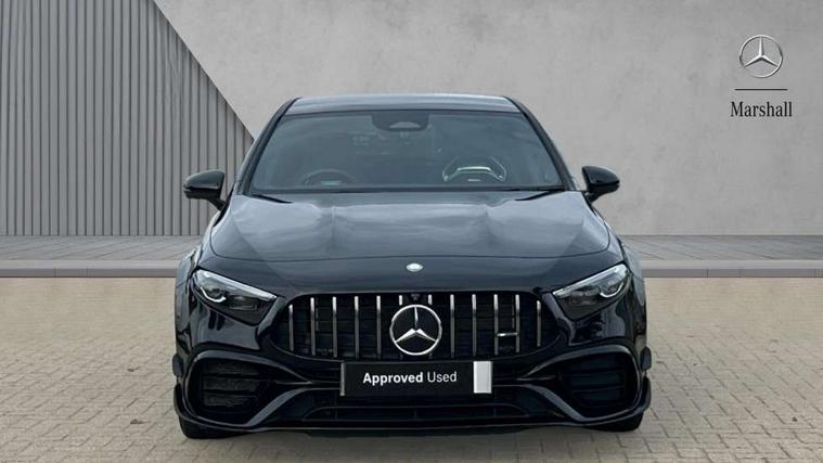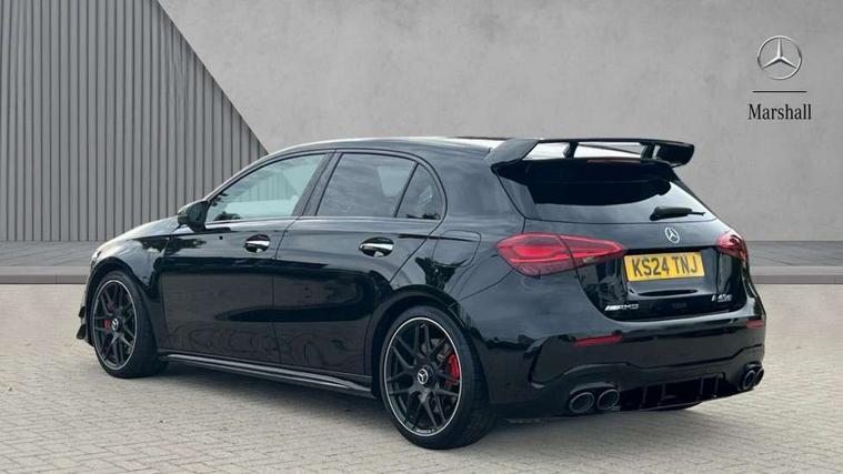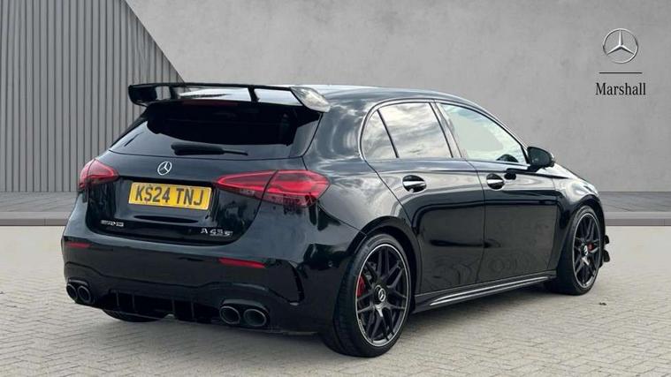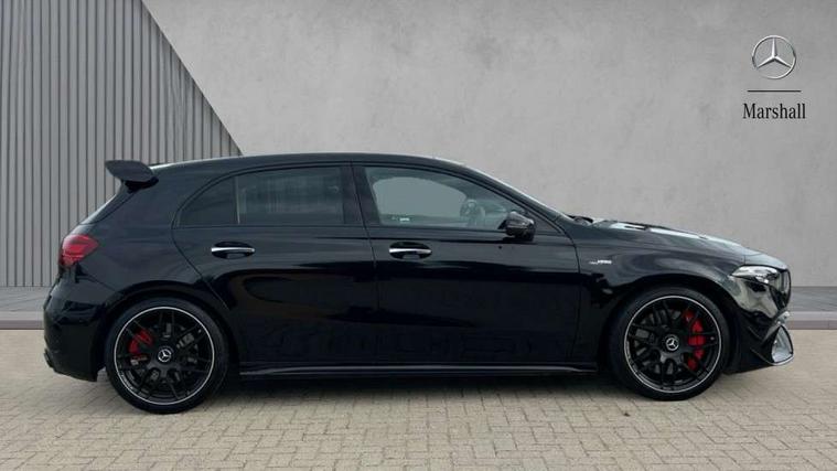 10.25 inch touchscreen central media display with AMG specific, AMG start up logo, visualisation of the AMG drive programs, vehicle and engine data, 10.25" Digital instrument cluster display screen, AMG DYNAMIC SELECT with drive modes(Slippery, Comfort, Sport, Sport+, Individual and Race) incl drift mode via steering wheel shift paddles+Race Start, AMG menu with sporty additional information - Gear indicator with yellow M symbol manual mode, Warm Up menu and Set Up menu, AMG speed sensitive steering with two sets of steering characteristics, Attention assist, Brake pad wear indicator warning light, Car wash mode, Direct steering, Dual bluetooth interfaces, ECO start/stop function, Engine start/stop button, Fluid level warning indicator for fuel, oil, coolant and washer fluid, Fluorescent jacket for driver, Hard-disk navigation, Head up Display, Hey Mercedes Voice activation, Lamp failure indicator, MBUX augmented reality for navigation, MBUX Interior assistant, Mercedes me connect including emergency call system, accident recovery, breakdown and maintenance management, Mercedes me remote services, Outside temperature gauge, Owners manual in English, Pre-installation of private car share, Preinstallation for Mercedes Benz link, Remote boot closing, Service indicator (ASSYST), Smartphone integration with Apple CarPlay and Android auto, Speed sensitive power steering, Tailgate, Traffic sign assist, Trip computer in multifunction display with current consumption indicator, Wireless charging, AMG performance 4MATIC+ with torque control, AMG suspension including AMG specific axles and sporty spring/damper setup, Suspension with adaptive damping system, Burmester surround sound system (590W) with Dolby atmos, speakers - 1 center+4 doors+2 in C pillars, tweeter, subwoofer, DSP amp, burmester lettering, DAB Digital radio, MBUX multimedia system, 4 Electric Front and Rear windows, Adaptive brake lights, AMG A45 S bodystyling -rear apron, four vertical fins, side sill panels, roof spoiler lip, specific front apron, diffuser look and S label on boot lid, AMG real performance exhaust sound system, AMG specific radiator grille in high gloss chrome with AMG lettering, Beltline strips in High gloss Black, Body colour bumpers, Body colour door handles with chrome inserts, Body colour side skirt, Electric adjustable and heated door mirrors with integrated LED side indicators, Headlamp assist automatic headlamp activation, Heat insulating dark tinted rear and rear side windows, Heated glass rear windscreen + timer control, LED daytime running lights, LED High level third brake light, LED tail lamp, Multibeam LED headlamps with adaptive highbeam assist and cornering function, Panoramic sliding sunroof, Privacy glass, Radio aerial, Rain sensing windscreen wipers with two sensitivity settings, Rear fog lights, Rear side wing doors, Rear windscreen wiper, Surround lighting with logo projection, Two round twin tailpipe trim elements each measuring 90 mm in diameter and AMG lettering plus ribbing on the inside of the pipe, Valve control dependent on drive program, Wider wheel arches for AMG wheels, Window line trim strip in black, 3 seat bench in 2nd row, 3 Spoke flattened lower section sporty design AMG Performance steering wheel in nappa leather/microcut microfibre, 40:20:40 split folding rear seats, Air conditioning - Two zone thermotronic luxury automatic climate control with display, AMG brushed stainless steel sports pedals with rubber studs, AMG centre console finished with trim in silver chrome, AMG floor mats, AMG performance seats, AMG sporty centre console with raised front section and integral control switched for manual transmission mode, AMG steering wheel buttons, Automatic child seat recognition sensor, Black air vents with surround in silver chrome, Black roof lining, Electrically adjustable front memory seats including lumbar support and backrest inclination, Front centre armrest with stowage, Front seat head restraints, Heated front seats, Height/reach adjustable steering column, Illuminated AMG front door sills with changeable cover, Interior lighting - 64 colour Ambient lighting, Interior mirror with reading lamps in black and frameless, Rear armrest with 2 cupholders, Rear head restraints, Seat occupancy sensor for front passenger seat, Silver coloured aluminium gear shift paddles on steering wheel, Single front passenger seat, Stowage compartment in centre console with retractable cover, Sunvisors with illuminated vanity mirrors, Twin front cupholders, Aerodynamic pack - A Class, AMG Driver's pack - A Class, AMG night pack - A Class, AMG performance high-end seat pack - A Class, Light and sight pack - A Class, Mirror package - A Class, Multi-contour seat pack - A Class, Parking pack with 360 degree camera - A Class, Seat comfort pack - A Class, USB pack plus - A Class, 3 rear 3 point seatbelts, 3 stage electronic stability programme, ABS with Brake Assist, Active bonnet, Adaptive brake assist with hold function and hill start assist, AMG high performance brake system with red painted brake callipers and black AMG lettering at the front, ventilated and perforated brake discs, Black seatbelts, Bonnet with power domes, Childproof locks manually operated for rear doors and electrically operated for rear power windows, Crash responsive emergency lighting, Driver and passenger head and side airbags, Drivers knee airbag, Dual stage driver/passenger airbags, Electronic parking brake, ESP curve dynamic assist, ESP with ASR, Exit warning, Front and rear seatbelt reminder, ISOFIX and top tether child seat fixing points in two outer rear seats, Tyre pressure monitoring system, Warning triangle and first aid kit, Window airbags, Alarm system/interior protection/immobiliser, Guard 360 degree vehicle protection, Keyless entry lock/unlock, Keyless Go, Remote central locking and crash sensor with emergency opening function, Aluminium AMG design black/silver interior trim, 19" AMG cross spoke forged wheels 