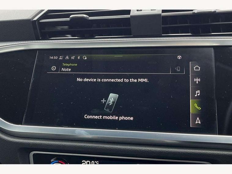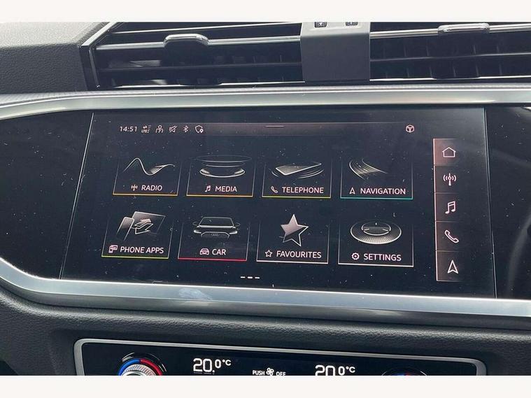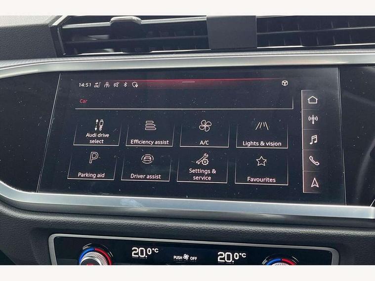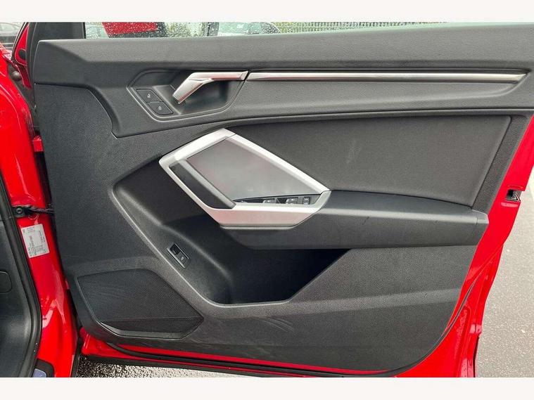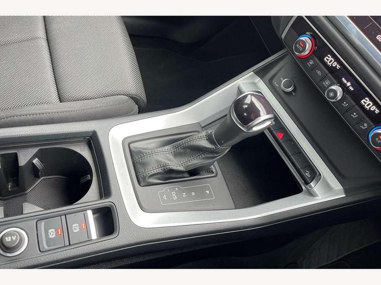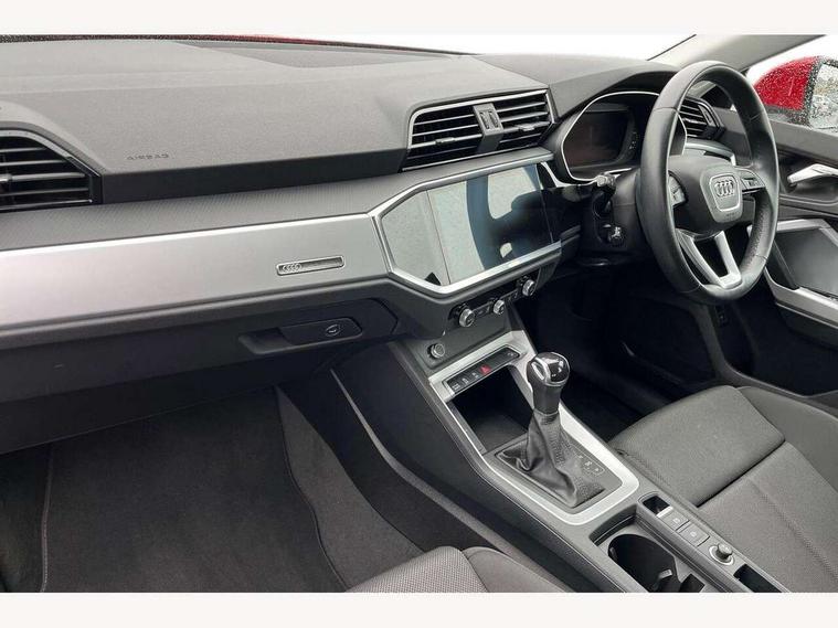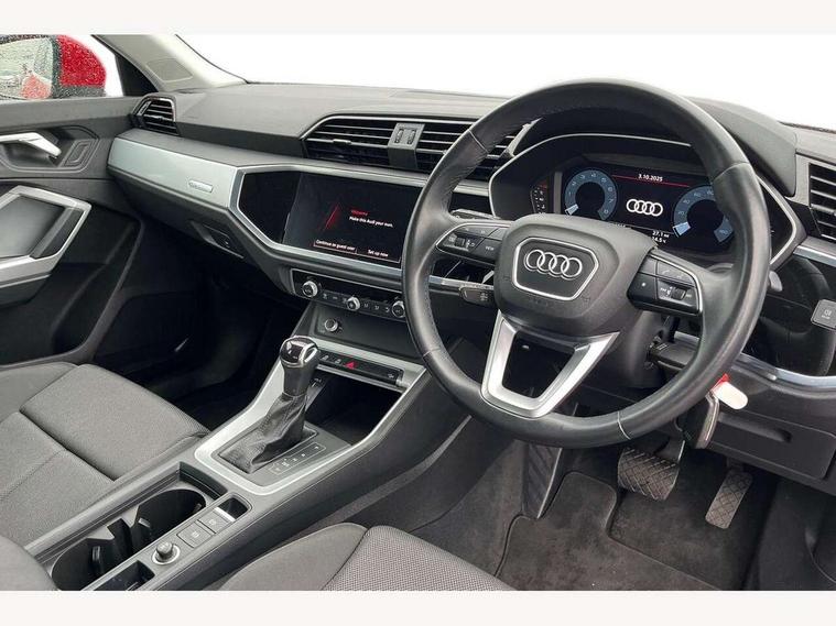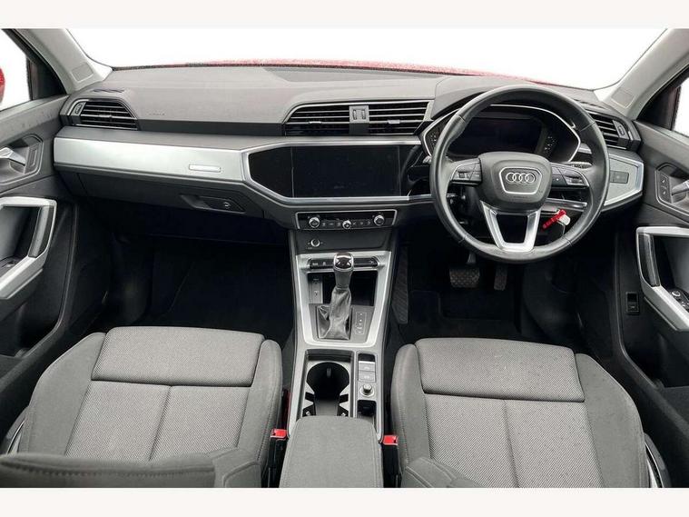 Amazon alexa Integration, Audi connect safety and service (e-call), Audi drive select, Audi lane departure warning, Audi smartphone interface includes wireless Apple carplay/Android Auto, Audi Virtual Cockpit - 10.25" display, Bluetooth interface, Camera based traffic sign recognition, MMI Navigation Plus with high resolution 10.1 inch touchscreen colour display, Power operated tailgate, Progressive steering, Service interval indicator, Start stop system with recuperation, Voice control system with natural language interaction, 48V Mild hybrid technology, Standard suspension, 2 USB-C ports with charge and data functions, 6 passive loudspeakers, DAB digital radio module, Acoustic windscreen, Aluminium roof rails, Aluminium window trim, Auto dimming frameless rear view mirror, Body coloured bumpers, Electrically folding, adjustable and heated door mirrors with integrated LED side indicators and kerb view function for passenger side, Front and rear electric windows, Front fog lights, Front side air inlets in matt selenite silver, Front spoiler in matt selenite silver, Grille vertical bars in aluminium silver/Matt, High gloss black finish B and C pillars, LED headlights with LED daytime running lights and dynamic rear indicator, LED rear lights, Rain and light sensors, Rear diffuser strip in matt selenite silver, Rear side wing doors, Rear wiper, Silver chrome grille surround, Third brake light, Titanium black radiator grille, Variable front intermittent wipers, 12V socket in rear centre console, 3 seat bench in 2nd row, 3 spoke multi-function leather steering wheel, 40:20:40 folding with manual adjustment for 60:40 forwards/backwards position and backrest angle, Aluminium door sill trims, Dual zone electronic climate control, Front and rear floor mats, Front and rear headrests, Front and rear roof module including reading lights, Front centre armrest, Glove compartment lighting, Height and reach adjustable steering wheel, ISOFIX child seat mounting for front passenger with airbag deactivation and outer rear seat including top tether attachment point for outer rear seats, Luggage compartment light, Lunar silver cloth headlining, Manual front seats with height adjustment, Single front passenger seat, Stainless steel luggage compartment sill finisher, Non smoking pack - Q3, 3x3 point rear seatbelts, 6 airbags - Driver, front passenger, curtain and side windows, Audi pre-sense front with pedestrain and cyclist recognition, Electrically operated child locks on rear doors, Electromechanical parking brake, Electronic stabilisation control including ABS, ASR and EDL, Front seatbelt reminder, Hill descent control, Hill hold assist, Pre sense basic, Seatbelt monitoring, Tyre pressure warning, Warning triangle and first aid kit, Anti theft alarm, Anti theft wheel bolts, Immobiliser, Remote central locking, Detail dashboard around MMI touch colour display in glass look, black with surround in aluminium look, Micrometallic silver inlay, Tool kit, Tyre repair kit,