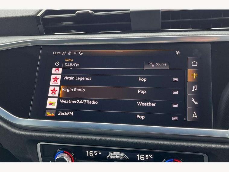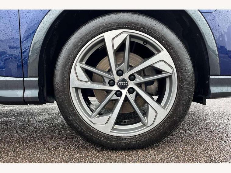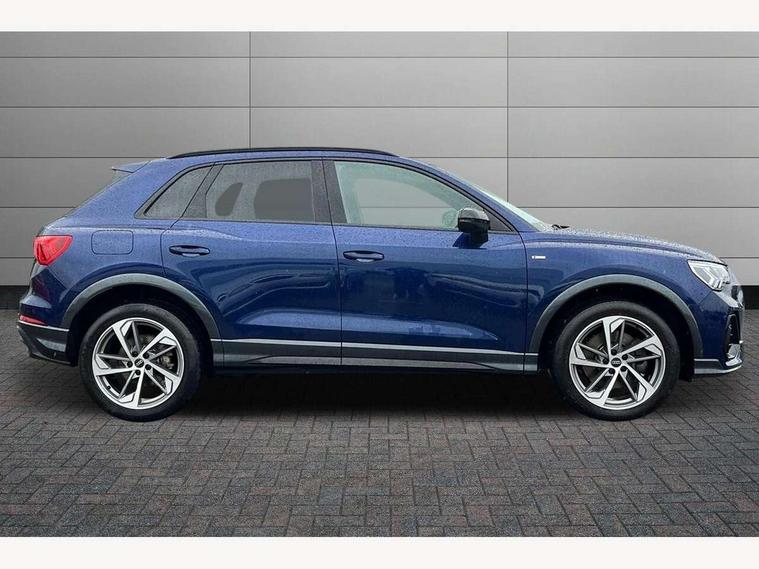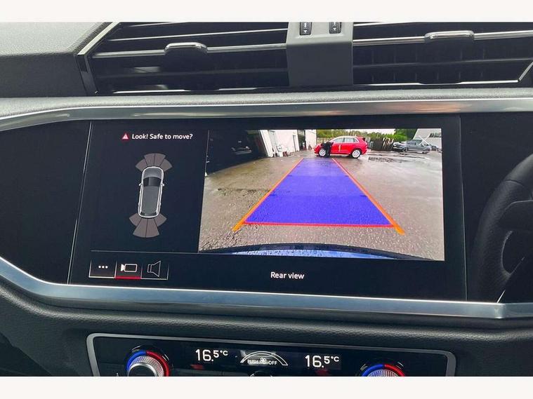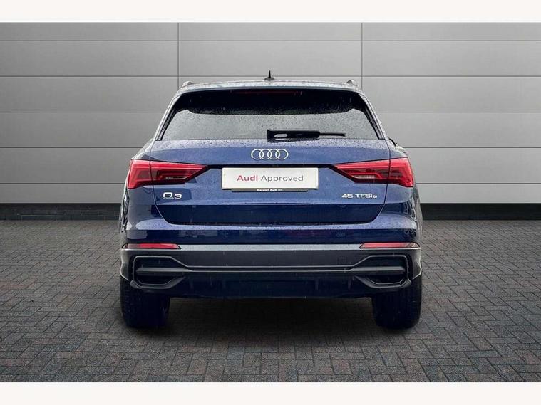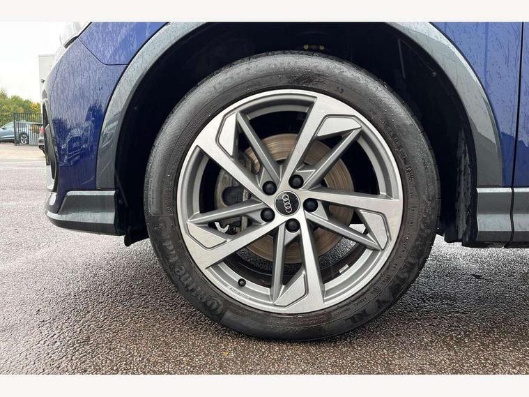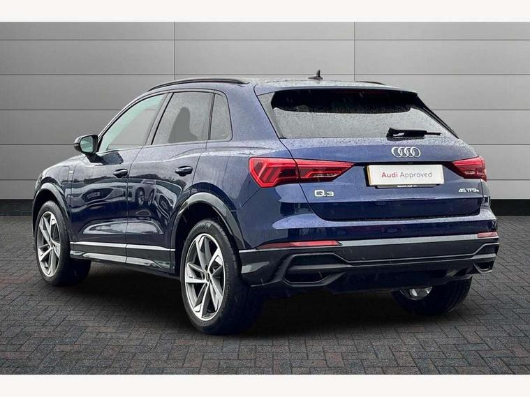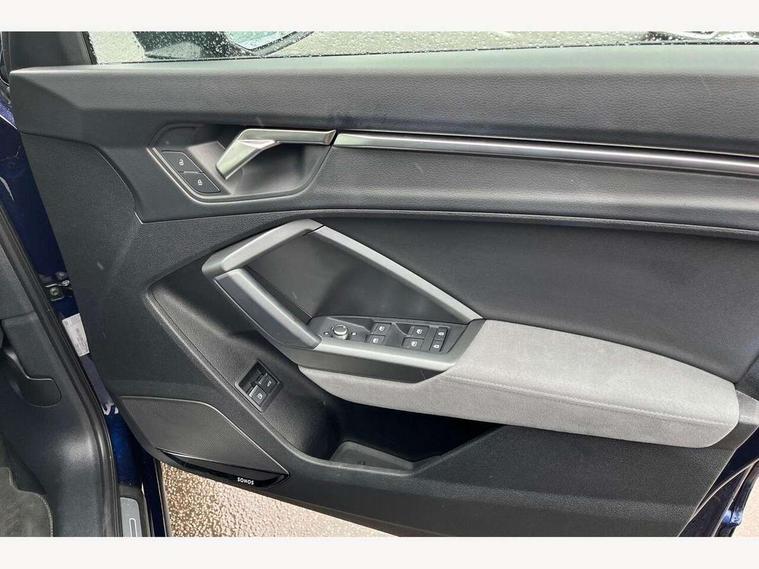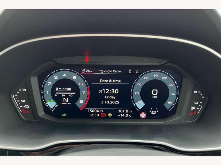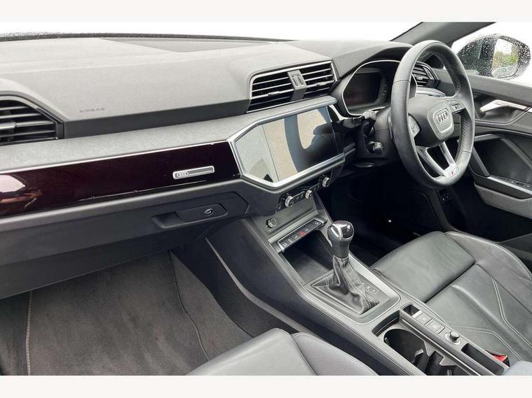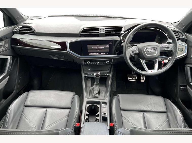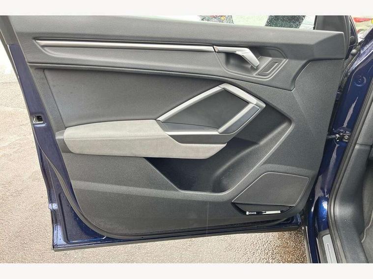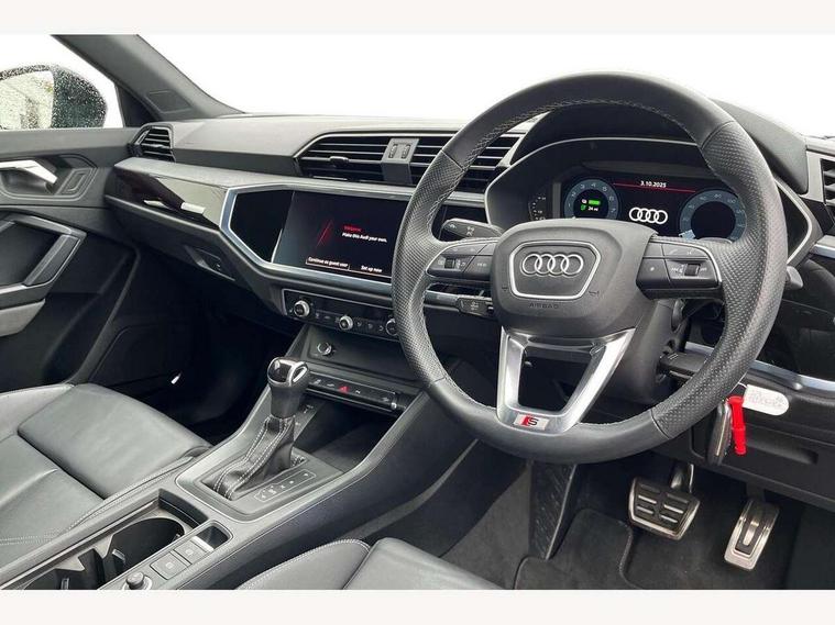 Amazon alexa Integration, Audi drive select, Audi lane departure warning, Audi smartphone interface includes wireless Apple carplay/Android Auto, Audi Virtual Cockpit - 10.25" display, Bluetooth interface, Camera based traffic sign recognition, Legal emergency call, MMI Navigation Plus with high resolution 10.1 inch touchscreen colour display, Power operated tailgate, Progressive steering, Service interval indicator, Start stop system with recuperation, Voice control system with natural language interaction, 3 pin 10 amp domestic charging cable, 3.6 kw On-board charger, Type 2 mode 3 32 amp charging cable, Type 2 socket for AC charging, 2 USB-C ports with charge and data functions, 6 passive loudspeakers, DAB digital radio module, Acoustic windscreen, Auto dimming frameless rear view mirror, Black roof rails, Electrically folding, adjustable and heated door mirrors with integrated LED side indicators and kerb view function for passenger side, Front and rear electric windows, Front fog lights, Grille vertical bars in aluminium silver/Matt, High gloss black finish B and C pillars, LED Dynamic rear indicators, LED headlights with LED daytime running lights, LED rear lights, LED third brake light, Privacy glass dark tinted rear and rear-side windows (from B-pillar backwards), Rain and light sensors, Rear diffuser grille in grained matt black, Rear diffuser strip in matt anthracite black, Rear side wing doors, Rear wiper, S line bumpers in contrasting Manhattan grey, Variable front intermittent wipers, 12V socket in rear centre console, 3 seat bench in 2nd row, 40:20:40 folding with manual adjustment for 60:40 forwards/backwards position and backrest angle, Adjustable rear seat bench/backrest with centre armrest and cupholder, Black cloth headlining, Dual zone electronic climate control, Front and rear black floor mats with contrast stitching in rock grey, Front and rear headrests, Front and rear roof module including reading lights, Front centre armrest, Glove compartment lighting, Height and reach adjustable steering wheel, Illuminated door sill trims with S logo, ISOFIX child seat mounting for front passenger with airbag deactivation and outer rear seat including top tether attachment point for outer rear seats, Luggage compartment light, Manual front seats with height adjustment, Perforated leather gearknob, Single front passenger seat, Stainless steel luggage compartment sill finisher, Stainless steel pedals, Tool kit, Ambient lighting pack - Q3, Black styling pack - Q3, Non smoking pack - Q3, 3x3 point rear seatbelts, 6 airbags - Driver, front passenger, curtain and side windows, Audi pre-sense front with pedestrain and cyclist recognition, Electrically operated child locks on rear doors, Electromechanical parking brake, Electronic stabilisation control including ABS, ASR and EDL, Front seatbelt reminder, Hill descent control, Hill hold assist, Pre sense basic, Seatbelt monitoring, Tyre pressure warning, Warning triangle and first aid kit, Anti theft alarm, Anti theft wheel bolts, Immobiliser, Remote central locking, Aluminium look interior elements, Detail dashboard around MMI touch colour display in glass look, black with surround in aluminium look, Leatherette door armrest, Piano black inlay, 19" 5 twin arm design diamond cut audi sport alloy wheels in matt grey look, Tyre repair kit,