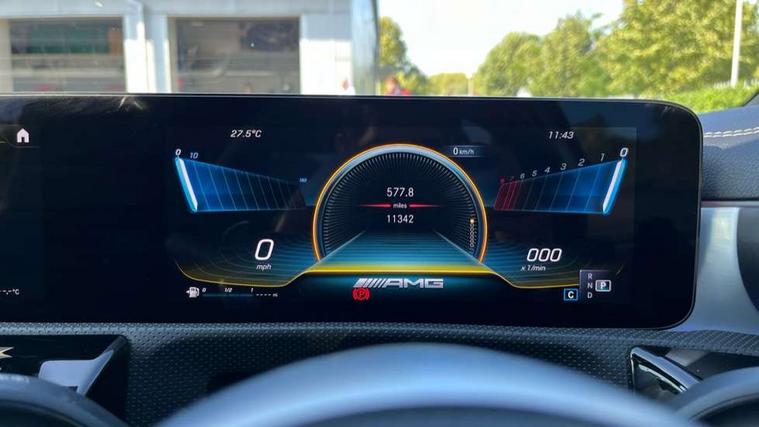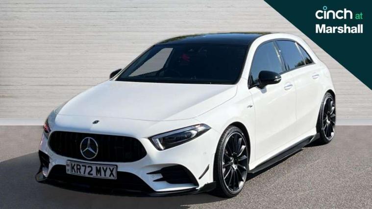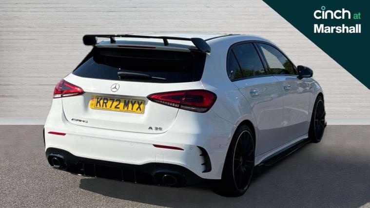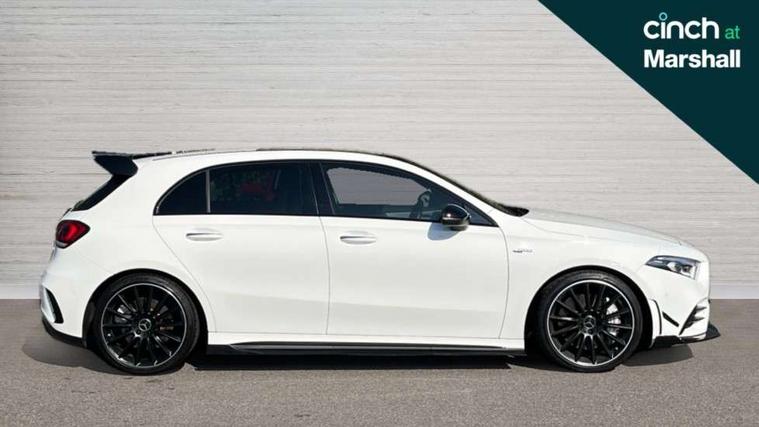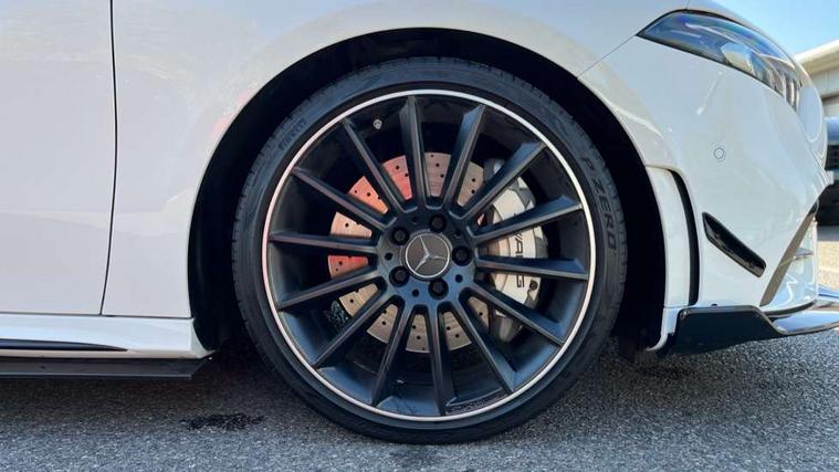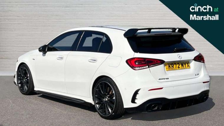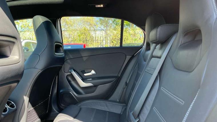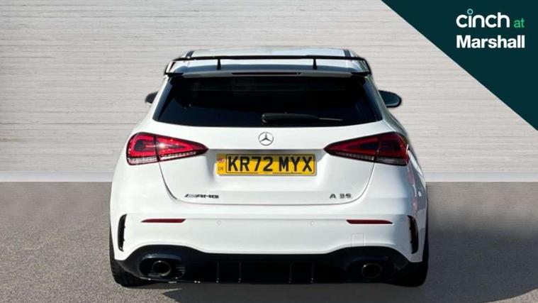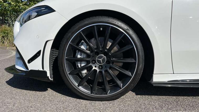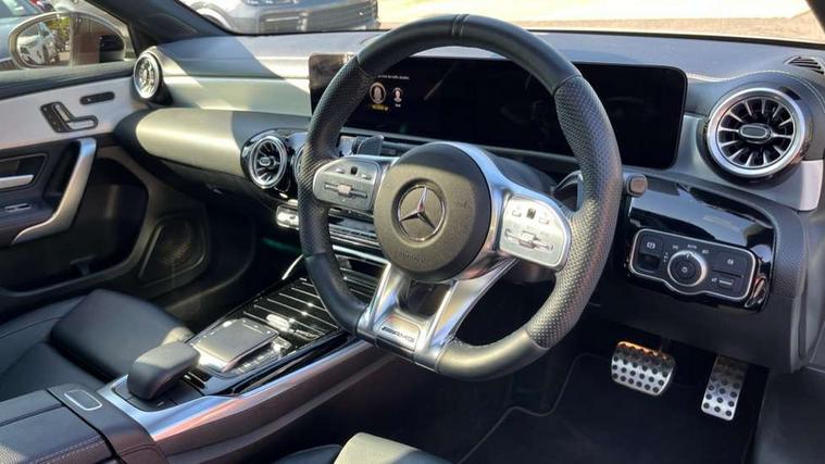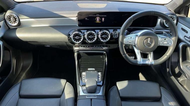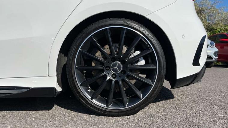 10.25" Digital instrument cluster display screen, 10.25" media display, 180 degree rear view camera with parking guidelines, Active parking assist with visual and audible warning of detected obstacles, Attention assist, Brake pad wear indicator warning light, Car wash mode, Cruise control + speed limiter, Direct steering, Dual bluetooth interfaces, DYNAMIC SELECT with driving programs (Slippery, Comfort, Sport, Sport+ and Individual), ECO start/stop function, Fluid level warning indicator for fuel, oil, coolant and washer fluid, Hard-disk navigation, Hey Mercedes Voice activation, Lamp failure indicator, Lane keeping system, Mercedes me connect including emergency call system, accident recovery, breakdown and maintenance management, Mercedes me remote services, Outside temperature gauge, Owners manual in English, Pre-installation for private car sharing, Preinstallation for Mercedes Benz link, Service indicator (ASSYST), Smartphone integration with Apple CarPlay and Android auto, Speed limit assist, Speed sensitive power steering, Traffic sign assist, Trip computer, Ultrasonic sensors positioned in the front and rear bumpers, AMG performance suspension, Rear axle multi-link, Suspension with adaptive damping system, 2 USB ports (type C) in rear stowage compartment and one in front of center console, 6 speakers, DAB Digital radio, MBUX multimedia system with DAB digital radio and touchpad including satellite navigation, Mercedes-Benz sound system - 100W, 4 Electric Front and Rear windows, Adaptive brake lights, AMG bodystyling - Front apron with splitter in chrome, rear apron with chrome trim and chrome visible trim elements in tailpipe, AMG Front apron with flics as air deflector elements on the outer air intakes, AMG radiator grille with twin blade lamella and AMG Lettering, AMG Rear apron with specific diffuser look with four vertical fins and two round chrome plated tailpipe trim elements with a diameter of 90 mm, AMG spoiler lip on roof, AMG Sports exhaust system with two round tailpipes measuring 90 mm in diameter attached in rear apron, AMG lettering plus ribbing on the inside of the, Automatic headlights, Black weather strip, Body colour bumpers, Body colour door handles with chrome inserts, Body colour side skirt, Electric adjustable and heated door mirrors with integrated LED side indicators, Front wings wheel arches with TURBO 4MATIC lettering, Headlamp assist automatic headlamp activation, Heated glass rear windscreen + timer control, LED daytime running lights, LED High level third brake light, LED tail lamp, Multibeam LED headlights with adaptive highbeam assist plus, Panoramic sliding sunroof, Privacy glass, Radio aerial, Rain sensing windscreen wipers with two sensitivity settings, Rear fog lights, Rear side wing doors, Rear wiper, Trim elements on louvres in outer air inlets in high gloss black, Wider wheel arches for AMG wheels, 3 seat bench in 2nd row, 40:20:40 split folding rear seats, AMG Performance steering wheel in nappa leather, Auto Mercedes-Benz child seat recognition sensor, Black air vents with surround in silver chrome, Black roof lining, Brushed stainless steel sports pedals with rubber studs, Controller on centre console with chrome surround, Electrically adjustable front memory seats including lumbar support, Floor mats with AMG lettering, Front centre armrest with storage compartment, Front seat backs luggage nets, Heated front seats, Height/reach adjustable steering column, Illuminated AMG front door sills with changeable cover, Interior lighting - 64 colour Ambient lighting, Interior mirror with reading lamps in black and frameless, Rear armrest with 2 cupholders, Rear head restraints, Seat occupancy sensor for front passenger seat, Silver coloured aluminium gear shift paddles on steering wheel, Single front passenger seat, Sports seats with integrated headrests, Stowage compartment in centre console with retractable cover, Sunvisors with illuminated vanity mirrors, Touchpad on center console, Twin front cupholders, Two zone thermotronic luxury automatic climate control, Aerodynamic pack - A Class, AMG night pack - A Class, Light and sight pack - A Class, Mirror package - A Class, Seat comfort pack - A Class, 3 rear 3 point seatbelts, ABS with Brake Assist, Active bonnet, Active brake assist includes forward collision warning system with autonomous braking, Adaptive brake assist with hold function and hill start assist, Black seatbelts, Childproof locks manually operated for rear doors and electrically operated for rear power windows, Crash responsive emergency lighting, Driver and passenger head and side airbags, Drivers knee airbag, Dual stage driver/passenger airbags, Electronic parking brake, ESP curve dynamic assist, ESP with ASR, Front and rear seatbelt reminder, Front brake calipers with AMG lettering, ISOFIX and top tether child seat fixing points in two outer rear seats, Perforated front brake discs, Tyre pressure monitoring system, Warning triangle and first aid kit, Window airbags, Alarm system/interior protection/immobiliser, Keyless entry lock/unlock, Keyless Go, Remote central locking and crash sensor with emergency opening function, Urban guard vehicle protection system with immobiliser and interior protection, Light aluminium with longitudinal grain interior trim, 19" AMG multi-spoke matt black painted light alloy wheels with high sheen finish, Summer tyres, Tirefit sealant kit,
