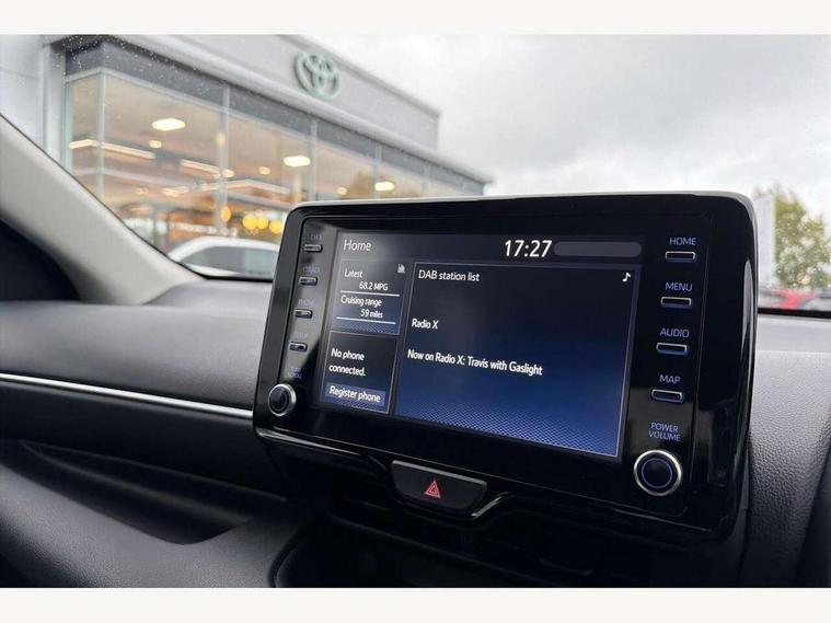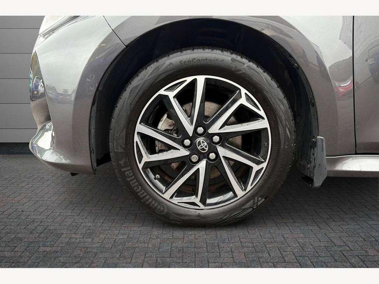 Adaptive cruise control, Adjustable speed limit with speed warning, Bluetooth connectivity, Colour binocular inspired displays with digital speedometer, E-call, Electric power steering, Hybrid energy display, Multi information display switches on steering wheel, Reversing camera, Smartphone integration with Apple CarPlay and Android auto, Tailgate, Voice recognition, Vehicle Stability Control (VSC), 4 speakers, 8" Multimedia display touch screen, USB connection, Acoustic windscreen glass, Auto windscreen wipers, Automatic headlights, Body coloured door mirrors, Electric adjustable heated door mirrors, Follow me home headlights, Front auto power windows with anti jam protection, Full LED rear lights, LED daytime running lights, LED front fog lights, LED front light guide, LED Headlights, LED High mounted stop lamp, LED Indicators, LED rear light guide, Manual headlight levelling, Painted chequered front grille, Rain sensor, Rear auto power windows with anti jam protection, Rear privacy glass, Rear side wing doors, Rear spoiler, Rear wiper, Shark fin antenna, Turning signal integrated indicators in door mirrors, Variable front intermittent wipers, 3 adjustable rear headrests, 3 spoke leather steering wheel, 60/40 split folding rear seat, Active headrests, Adjustable boot height, Auto air conditioning, Coat hooks in rear grab handles, Cup holders (2 front & door), Data Communication Module (DCM) connected services, Fabric upholstery, Front armrest, Glovebox, Grey roof lining, Height adjustable driver's seat, Isofix seat fixing, Leather gearshift, Pollen filter, Shopping bag hooks, Single front passenger seat, Tilt/telescopic steering column, 3 point seatbelts on all rear seats, ABS+EBD+Brake assist, Electronic parking brake, Emergency brake light system (EBS), Front passenger airbag on/off switch, Front seatbelt reminder, Hill start assist control (HAC), Rear child proof door locks, Rear seat belt reminder, Supplemental Restraint System (SRS) 8 airbags: Driver & passenger's airbags, dual side curtain airbags, side impact airbags, front centre airbag, Toyota Safety Sense 2, Precollison + Night time Pedestrian & Cyclist Detection, Lane Trace Assist, Auto High Beam, Intelligent ACC & Road Sign Assist, Tyre pressure warning system, 2x Master key, Alarm/immobiliser, Remote powered central double locking doors, Soft touch instrument panel, Space saver spare wheel,