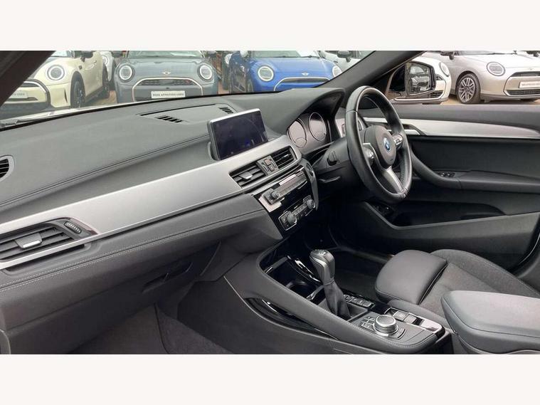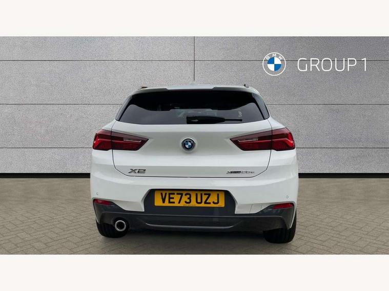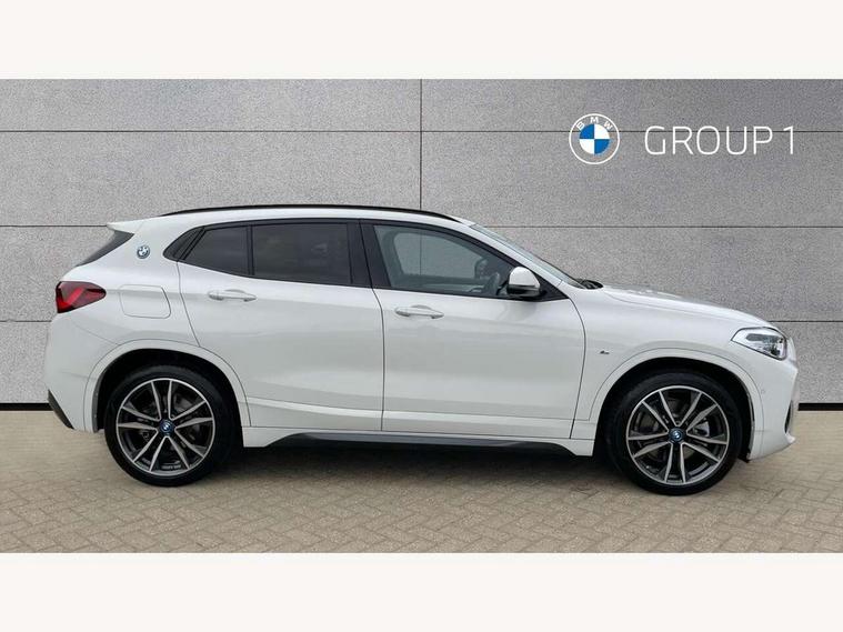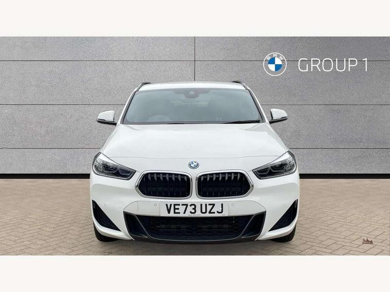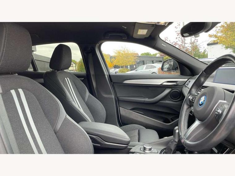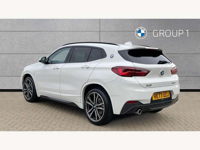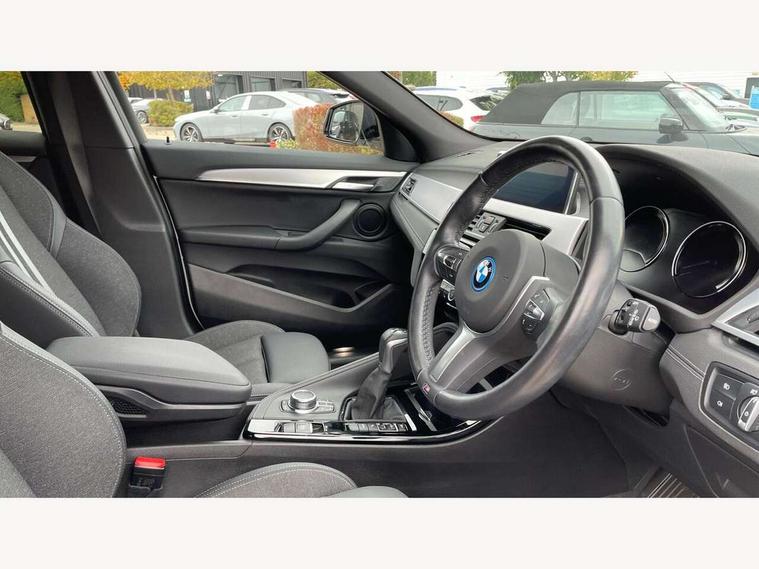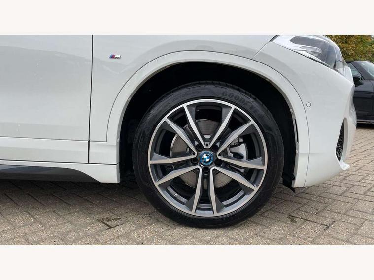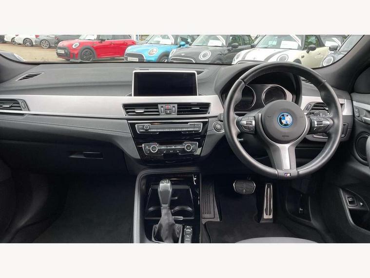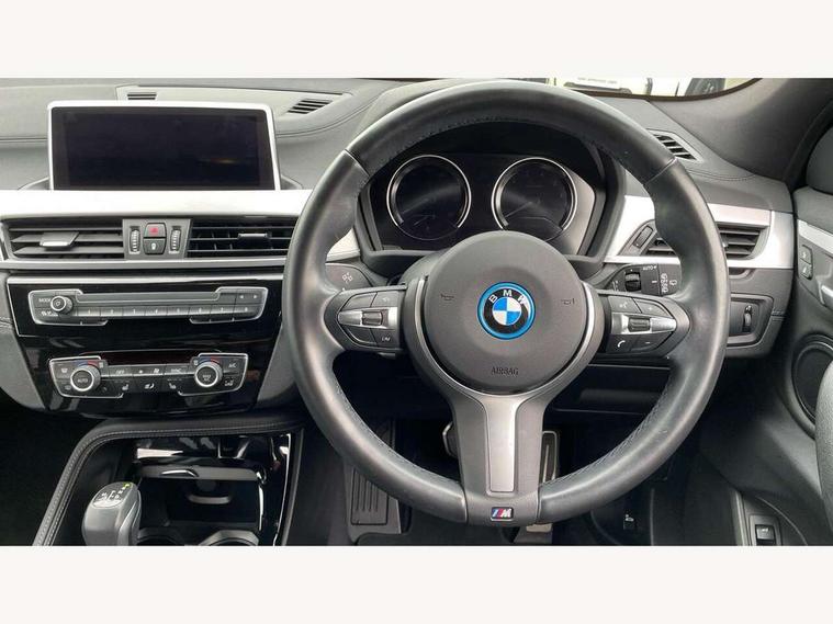 Active Guard incl approach control warning with city brake function and person warning with city brake function, Apple CarPlay preparation, Automatic powered electric bootlid, BMW ConnectedDrive online services, BMW Navigation system with 8.8" monitor, BMW Online services, BMW Teleservices, Brake pad wear indicator in front and rear, Check Control warning system for monitoring of lights and door/luggage compartment open warning, Connected eDrive Services, eDrive button activates auto eDrive, max eDrive and save battery modes, eDrive specific displays in instrument cluster and CID, Electric Power Steering (EPS) with Servotronic, Electro hydraulically controlled multi plate clutch in rear axle, Energy efficient operating strategy, Front axle single joint with specific axle kinematics to minimise drive influences on steering + provide increased rigidity agile driving behaviour, Instrument cluster with black optic and 5.7" colour display + speedometer + tachometer + fuel gauge + instant fuel economy, Integrated owners handbook, Lights on warning by audio warning signal when ignition is switched off, On board computer - average speed+fuel consumption, service interval, clock/date, odometer/trip meter, outside temperature display and ice warning, Operation by iDrive with direct selection buttons and 8 programmable buttons, Optimum shift indicator, Park assist system, Personal Profile, Real time traffic information, TMC for lifetime of vehicle, Variable and stepless distribution of drive torque between front and rear axle, 12V compressor with integrated sealant injection bottle and hose, 2.4kW AC charging with 5m cable, AC Fast Charging, Aluminium lightweight construction including crankcase, Anti roll bar front and rear, Automatic transmission, Balancer shaft, Double VANOS, Drive performance control with ECO PRO comfort + sport mode, eDrive exterior sound, Electric engine installed under rear seats driving the rear wheels, Electronic differential lock, High precision injection, Lithium-ion high voltage battery (10.0 kWh) fitted under rear seats, Performance Control, Transmission of power to rear axle via front axle differential and two-part cardan shaft, Twin tube gas filled shock absorbers with degressive characteristic curve, xDrive electric drive, after activation of the electric motor and common drive via all four wheels, 6 Speaker Loudspeaker system, Bluetooth audio streaming, BMW professional radio, DAB Digital radio, Steering wheel mounted audio/telephone controls, Adjustable headlights, Aero curtain, Automatic windscreen wipers and automatic headlight, Automatically dimming rear view mirror, BMW badge on bonnet, tailgate with integrated tailgate release and C pillars, Body colour door handles, Body colour mirror caps, Body colour roof trims, Chrome kidney grille with black vertical slats, Clear lenses direction indicator lights, Dark shadow front air intakes, Daytime running lights, Differentiation of xEV Vehicles - Blue ring around BMW roundel on wheel hub/tailgate/bonnet/c-pillar/steering wheel and side panel inscription, Direction indicator side lights integrated in exterior mirrors using LED technology, Door mirror integrated indicators, Dynamic brake lights, Electric folding exterior mirrors with anti-dazzle, Electrically adjustable and heated door mirrors glass aspheric on driver's side and convex on passenger side, Engine designation on electric bootlid - right, Fingertip control / anti-trap function on electric window, Front and rear bumper system, Front and rear electric windows, Green tinted heat protection glazing, Heated windscreen washer jets, High gloss black front side air intake with matt black insert, High gloss black in window frame, recess covers and B-Pillar trim, High gloss shadowline in window frame, recess covers, mirror frame and B-Pillar/C- pillar trim, High level third brake light, M logo designation in side chrome, M Sport spoiler, Model designation in left tailgate, Rear fog lights, Rear side wing doors, Rear tail lights with LED technology and 3D design, Rear window aerial, Rear window wiper with wash/wipe function, Reversing light in rear light cluster, Shark fin antenna, Single exhaust tailpipes with chrome finishers 90mm in left, Visible VIN plate, Welcome lighting, 2 cupholders in front centre console, 3 Spoke M sport nappa leather multifunction steering wheel, 40:20:40 manually split folding rear seat with two tilt positions for backrest, Anthracite headlining, Armrest in centre section of rear seat backrest and folding, Automatic two zone climate control air conditioning, Child seat ISOFIX attachment for two outer rear seats and front passenger seat with anchorage points, Conditioned based service, Contrast stitching on centre console and mid section of dashboard to match upholstery seam, Driver and front passenger seat heating, Driver/passenger sunvisors with ticket holders, Floor mats with black surround and M flag detail on front mats, Front and rear door armrests, Front armrest, Front axle always driven, Front door sill finishers with M designation, Front head restraints, Front sports seats, Illuminated charging socket with visual display of charge status, Interior light in front centre interior mirrors and rear centre auto interior light activation when door is opened when ignition switched off, Luggage compartment lighting, Luggage compartment loading edge with stainless steel insert, Luggage compartment with underfloor storage and four lashing eyes, Pre-conditioning of battery for optimum operating temperature, Pre-conditioning of interior via BMW Remote app or setting time within iDrive menu, Rake/reach adjustable steering wheel, Single front passenger seat, Three rear headrests, Additional interior lighting pack - X2, Extended storage pack - X2, M Sport aerodynamic pack - X2, 3 point seatbelts on all seats, front pyrotechnic belt tensioners, stopper and belt force limiters, rear coded belt buckles, Airbags - Front driver and passenger, front 