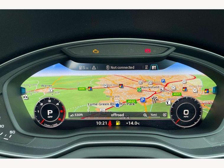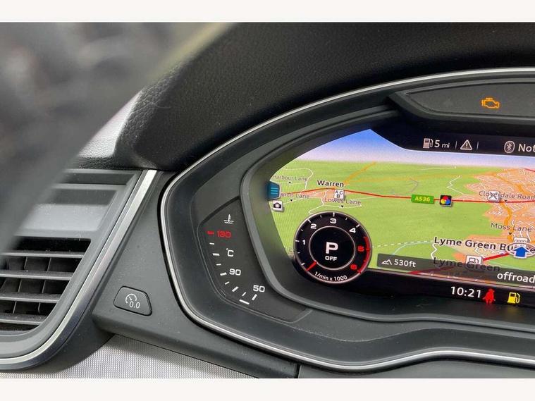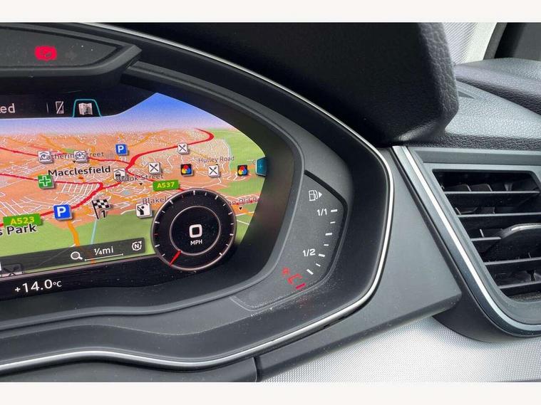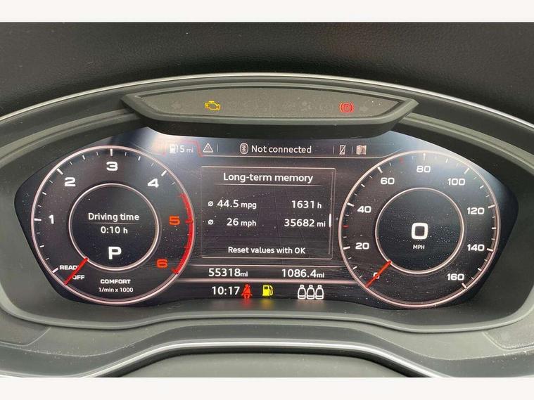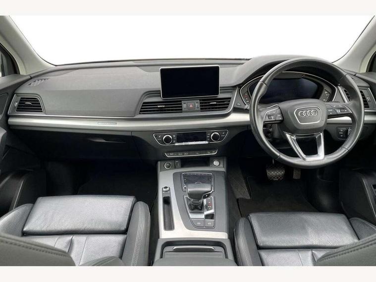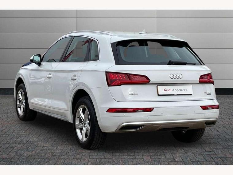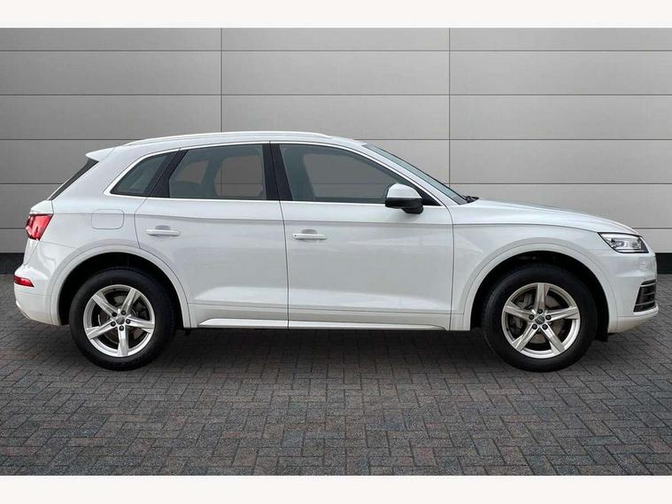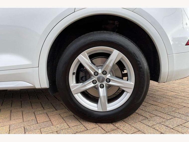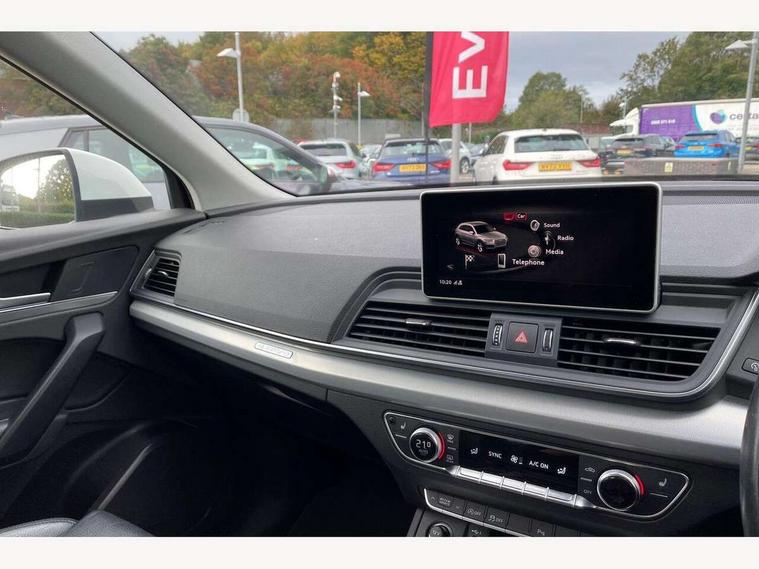 7" Colour driver information system, Audi drive select, Audi parking system plus with front and rear sensors, Audi smartphone interface, Automatic start/stop system, Electro - mechanical power assisted steering, MMI Navigation, Mobile telephone preparation - bluetooth interface, Power tailgate, Service interval indicator, Voice control system, Diesel particulate filter, 2x SD card slot, CD player, DAB Digital radio, MMI radio plus with 7" colour MMI screen and MMI controller, Acoustic windscreen, Air inlets in matt titanium black with blades in matt aluminium silver, Aluminium roof rails, Auto dimming rear view mirror, Automatic headlight levelling, Body colour bumpers, Body colour door mirrors, Chrome exhaust tailpipe, Front and rear electric windows, Light and rain sensor for auto activation of lights and windscreen wipers, Loading sill protector in stainless steel, Matt selenite silver underbody protection, Rear diffuser strip in selenite silver, Rear spoiler, Rear wiper, Side skirts in matt selenite silver, Twilight grey matt radiator grille with matt aluminium horizontal chrome struts, 2 x USB charging port with aux input socket, 3 rear headrests, 3 Spoke leather multi function steering wheel, 3 zone climate control, 40:20:40 split folding rear seat with rear centre armrest, Cloth headlining, Door sills trims with aluminium inlays, Front centre armrest, Front/rear floor mats, Height adjustable front head restraints, ISOFIX child seat mounting and top tether, Luggage compartment carpet, Removable luggage compartment floor, Sunvisors with vanity mirrors, Tool kit, Trunk roller cover, High gloss pack - Q5, Non Smokers pack, 3 point seatbelts on all seats, 6 airbags - Driver, front passenger, curtain and side airbags, Electromechanical parking brake, Electronic stabilisation control including ABS, ASR and EDL, Front passenger airbag deactivation, Hill descent control, Hill hold assist, Multi collision brake assist, Pop-up bonnet for pedestrian protection, Pre sense city, Seat belt force limiter, Seatbelt monitoring, Tyre pressure warning, Warning triangle and first aid kit, Anti theft alarm, Anti-theft wheel bolts, Keyless Go access/ignition system, Remote central locking, Aluminium rhombus inlay,