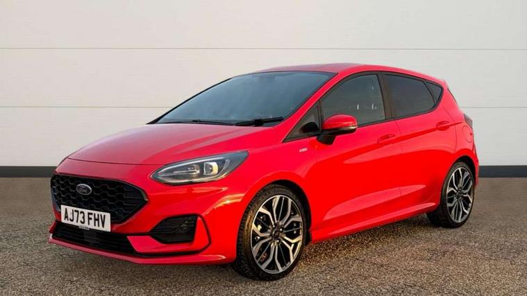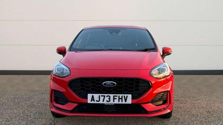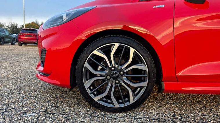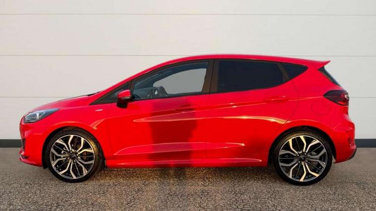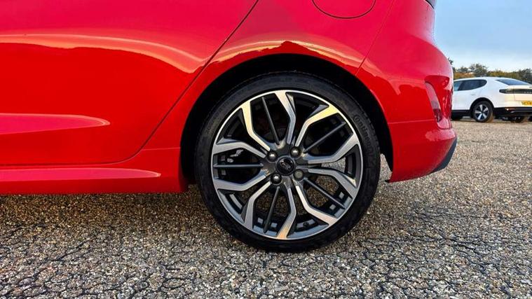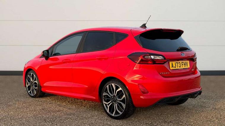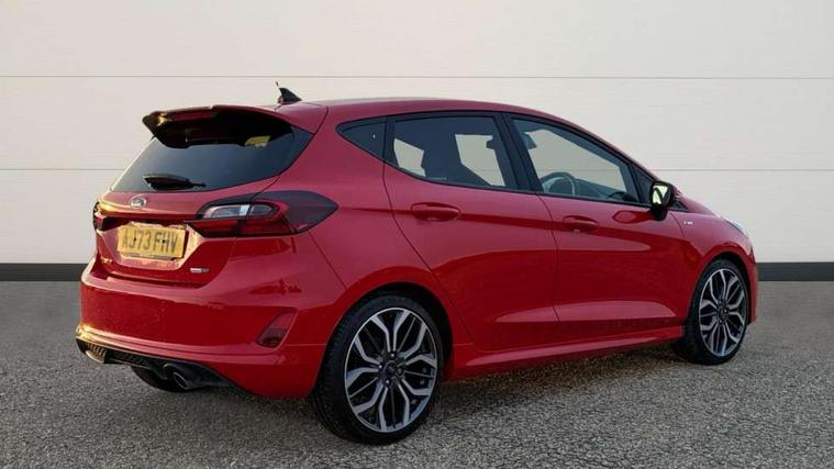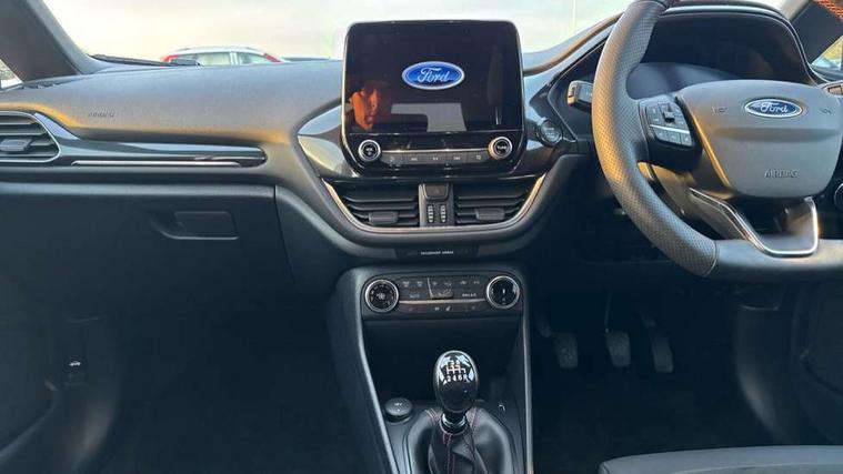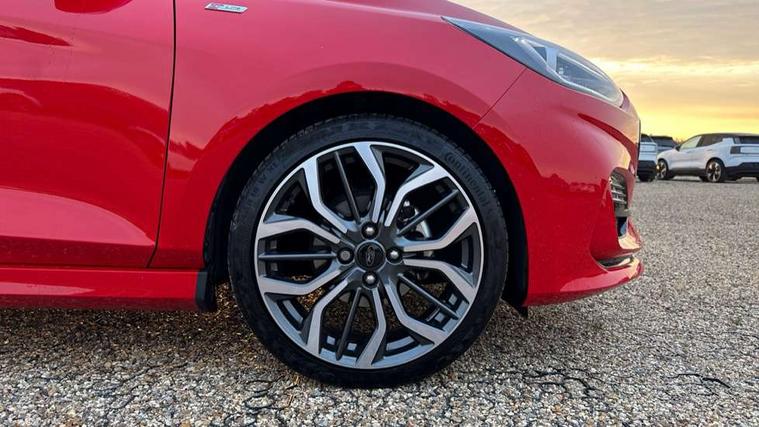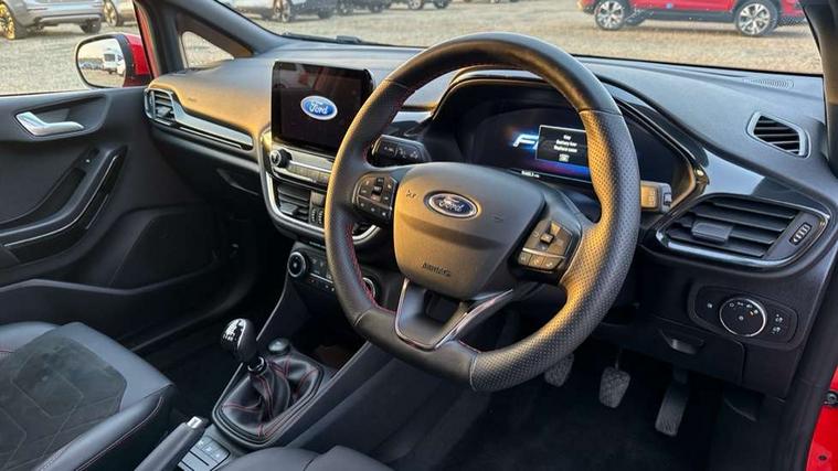 4.2" TFT instrument cluster screen, Bluetooth system, Electric power steering, Ford easy fuel, Rear parking distance sensors, Selectable drive modes (Normal, Sport, Track), Traffic sign recognition, Trip computer, Sports suspension, 2 USB ports, Auxiliary input socket, B&O Premium audio system with 8" touchscreen, 10 speakers, 360 degree sound system, Ford SYNC 3 navigation system and Ford pass connect, DAB Digital radio, Steering wheel mounted controls, Auto high beam, Body colour bumpers, Body colour door handles, Body colour large rear spoiler, Body coloured electrically operated and heated door mirrors with side indicators, Cornering front fog lights, Electric front windows/one touch facility, Electric rear windows, LED Night signature to rear lights, Power foldable door mirrors with puddle lights, Quickclear heated windscreen, Rain sensing wipers and auto dimming rear view mirror, Rear privacy glass, Rear wiper, Unique ST-Line upper grille & full bodystyling kit with ST-Line wing badges, 3 spoke flat bottomed leather steering wheel, 60/40 split folding rear seat, Adjustable head restraints, Black headlining, Boot carpet, Centre console with opening armrest, 2x cupholders, 12v and USB, Chrome inner door handles, Drivers and Passenger lumbar support, EATC - Electronic Auto Temperature control, Footwell illumination, Front floor mats in velour, Front map reading lights, Front seat and rear pockets, Height adjustable passenger seat, Illuminated glovebox, Leather gaiter, LED ambient lighting, Load area light, Manual 4-way driver seat adjust, Overhead console with sunglasses holder, Pollen filter, Rake/reach adjustable steering wheel, Sensico wrapped steering wheel, Sports front seats, NCAP Pack - Fiesta, ST-Line X Trim Pack - Fiesta, 3 point seatbelts on all rear seats, ABS+EBA, Curtain airbags, Driver and passenger airbags, Drivers knee airbag, Electronic stability control with hill start assist, Front passenger airbag deactivation, Front side airbags, Seatbelt warning, Two tone horn, Tyre pressure monitoring system, Ford keyfree system with Keyless entry and keyless start, MyKey system, Remote central locking & engine immobiliser, Thatcham Cat.1 alarm, 18" 5 spoke alloy wheels with rock metallic machined finish,