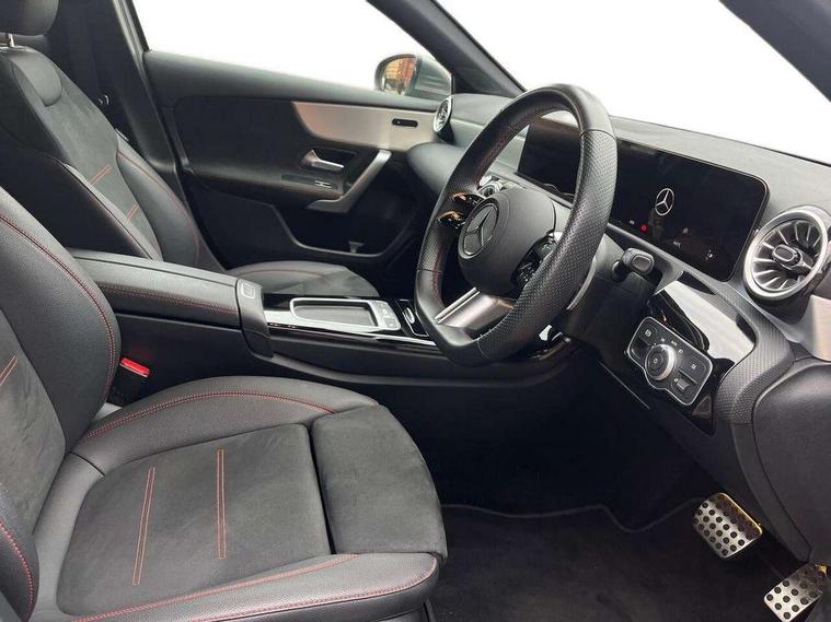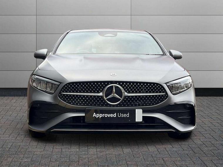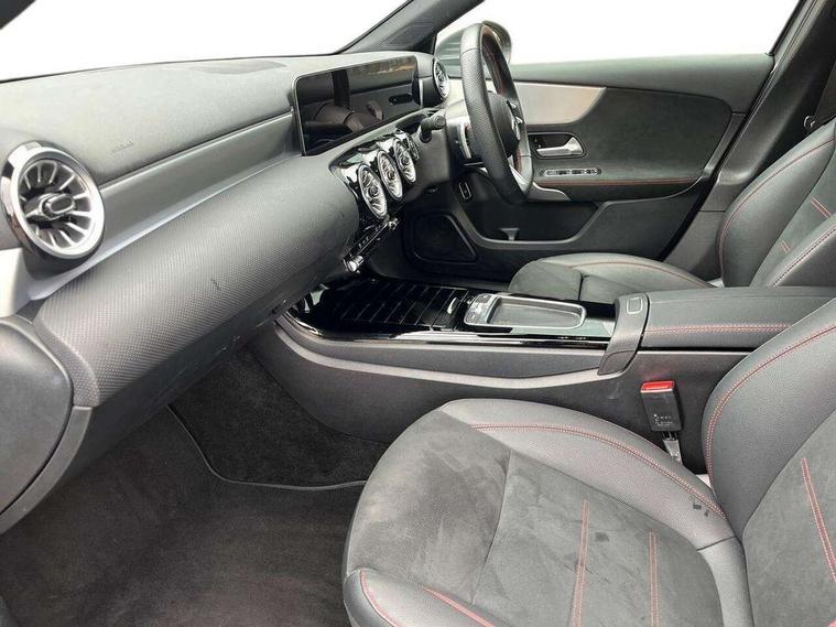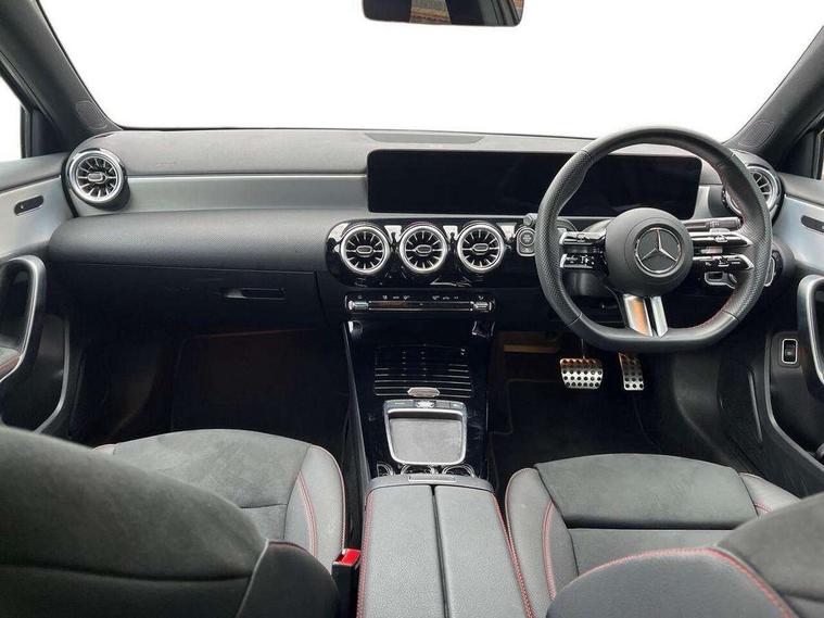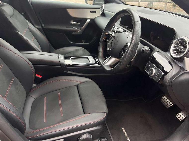 10.25 inch touchscreen central media display, 10.25" Digital instrument cluster display screen, Attention assist, Blind spot assist, Brake pad wear indicator warning light, Car wash mode, Cruise control + speed limiter, Direct steering, Direction indicators with lane change function, Dual bluetooth interfaces, DYNAMIC SELECT with a choice of driving modes (ECO, Comfort, Sport and Individual), ECO start/stop function, Engine start/stop button, Fingerprint scanner, Fluid level warning indicator for fuel, oil, coolant and washer fluid, Fluorescent jacket for driver, Hard-disk navigation, Hey Mercedes Voice activation, Lamp failure indicator, Lane keeping system, Mercedes me connect including emergency call system, accident recovery, breakdown and maintenance management, Mercedes me remote services, Outside temperature gauge, Owners manual in English, Pre-installation of private car share, Preinstallation for Mercedes Benz link, Remote boot closing, Service indicator (ASSYST), Smartphone integration with Apple CarPlay and Android auto, Speed limit assist, Speed sensitive power steering, Trip computer in multifunction display with current consumption indicator, Wireless charging, Lowered comfort suspension, DAB Digital radio, MBUX multimedia system, Mercedes Benz sound system (100 W) with 6 speakers, 4 Electric Front and Rear windows, Adaptive brake lights, AMG body styling - AMG front apron with front splitter and AMG rear apron and visible exhaust tailpipe trim elements, Body colour bumpers, Body colour door handles with chrome inserts, Body colour side skirt, Body coloured door mirrors, Chrome beltline strips, Diamond radiator grille with pins in fine star pattern, Electric adjustable and heated door mirrors with integrated LED side indicators, Exhaust system with 2 visible tailpipe trim elements and rear apron, Headlamp assist automatic headlamp activation, Heat insulating dark tinted rear and rear side windows, Heated glass rear windscreen + timer control, LED High Performance headlamps including integral LED daytime running lamps and adaptive highbeam assist, LED tail lamp, Privacy glass, Radio aerial, Rain sensing windscreen wipers with two sensitivity settings, Rear boot, Rear fog lights, Rear side wing doors, Third brake light featuring LED technology, Window line trim strip in chrome, 3 seat bench in 2nd row, 3 Spoke flat bottom leather multi function steering wheel with perforated leather in grip area, 4 way lumbar support, 40:20:40 split folding rear seats, Air conditioning - One zone thermatic automatic climate control with automatically controlled air distribution, AMG floor mats, Automatic child seat recognition sensor, Black air vents with surround in silver chrome, Black roof lining, Brushed stainless steel sports pedals with rubber studs, Front centre armrest with stowage, Front door sills with Mercedes Benz lettering, Front seat backs luggage nets, Galvanished gear shift paddles on steering wheel, Heated front seats, Height/reach adjustable steering column, Interior lighting - 64 colour Ambient lighting, Interior mirror with reading lamps in black and frameless, Rear armrest with 2 cupholders, Seat occupancy sensor for front passenger seat, Single front passenger seat, Sports seats with adjustable head restraints, Stowage compartment in centre console with retractable cover, Sunvisors with illuminated vanity mirrors, Twin front cupholders, Keyless go comfort pack - A Class, Light and sight package - A Class, Mirror package - A Class, Parking pack with 180 degree view - A Class, Seat comfort pack - A Class, USB pack plus - A Class, 3 rear 3 point seatbelts, ABS with Brake Assist, Active bonnet, Active brake assist includes forward collision warning system with autonomous braking, Adaptive brake assist with hold function and hill start assist, Black seatbelts, Bonnet with power domes, Childproof locks manually operated for rear doors and electrically operated for rear power windows, Crash responsive emergency lighting, Driver and passenger head and side airbags, Drivers knee airbag, Dual stage driver/passenger airbags, Electronic parking brake, ESP curve dynamic assist, ESP with ASR, Front and rear seatbelt reminder, ISOFIX and top tether child seat fixing points in two outer rear seats, Tyre pressure monitoring system, Warning triangle and first aid kit, Window airbags, Alarm system/interior protection/immobiliser, Guard 360 degree vehicle protection, Remote central locking and crash sensor with emergency opening function, Light longitudinal grain aluminium trim, 18" AMG 5 twin spoke light alloy wheels, aerodynamically optimised, painted in black with high sheen finish, Summer tyres, Tirefit sealant kit,