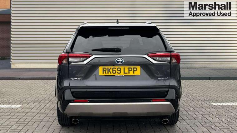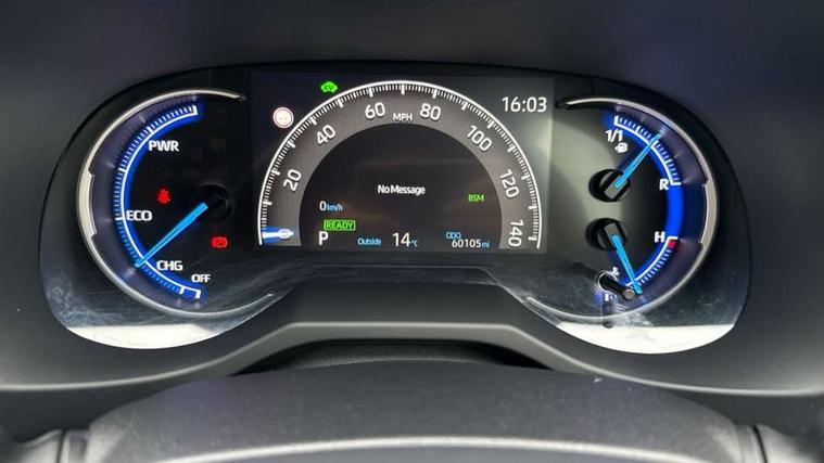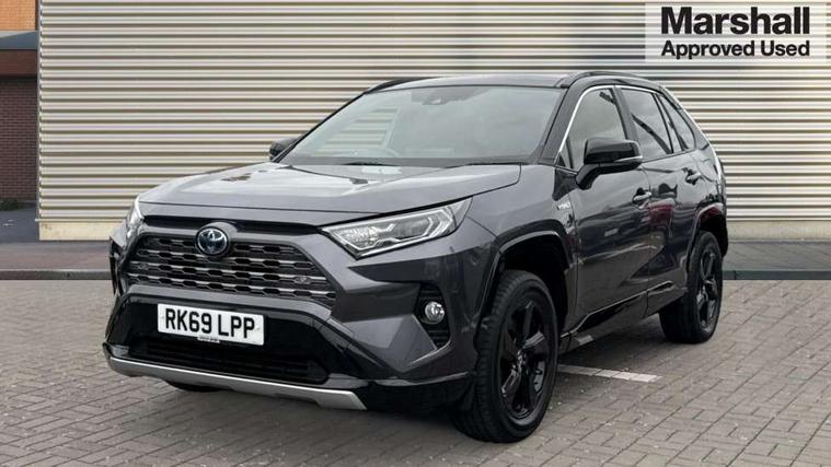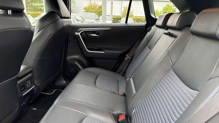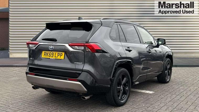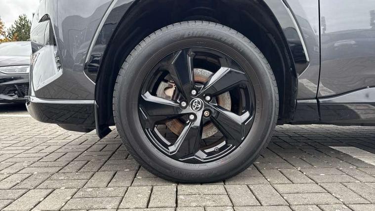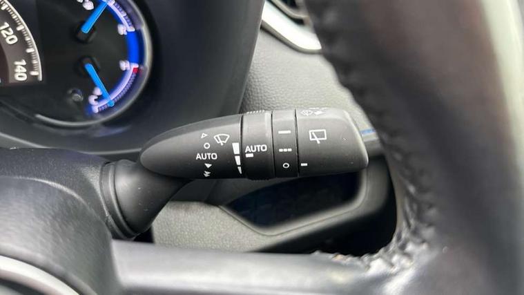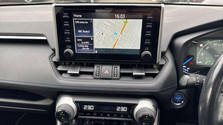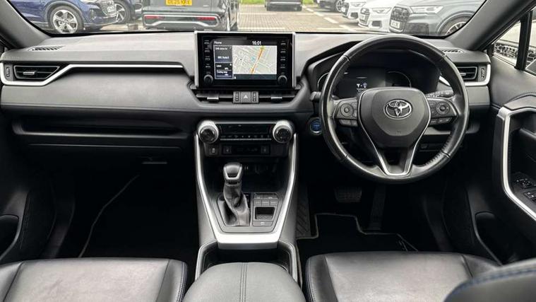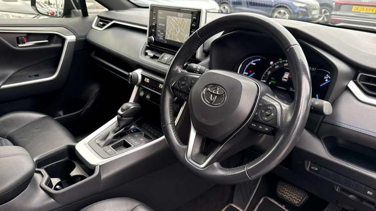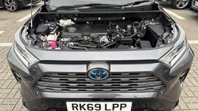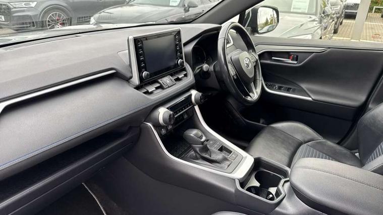 7" colour TFT display, Adaptive cruise control with lane trace assist, Adjustable speed limiter, Blind spot monitoring with rear cross traffic alert, Bluetooth system, Cyclist Detection, Drive mode selector, eCall emergency call system, ECO-driving indicator, Electric power steering, Hybrid system indicator, Lane departure warning system, Lights on warning, Night Time Pedestrian Detection, Pedestrial detection, Power boot opening and closing, Rear parking camera, Rear parking sensors, Remote boot door release in cabin, Tachometer, Touch 2 Go navigation system including 3D maps and voice control, Traffic sign recognition, Trip computer, Voice control system, Vehicle Stability Control (VSC), 6 speakers, 8" Multimedia display touch screen, Auxiliary socket for external MP3 player, DAB audio, Steering wheel mounted audio controls, Toyota touch media system, USB connection, Auto dimming interior mirror, Auto high beam, Automatic headlamp levelling, Automatic headlights, Automatically retractable door mirrors, Bi-tone black roof, Black door mirrors, Black rear spoiler, Black roof rails, Black Shark-fin antenna, Body colour door handles, Body coloured bumpers, Door mirror puddle lights, Electric adjustable door mirrors, Emergency brake-light signal (EBS), Follow me home headlights, Front fog lights, Gloss black front bumper insert, Gloss black rear bumper insert, Headlight cleaners, Heated door mirrors, LED daytime running lights, LED High mounted stop lamp, LED rear lights, Meshed upper front grille, Power front windows, Power rear windows, Privacy glass, Projector LED headlights, Rear screen wiper - intermittent, Rear windscreen defogger, Silver front under-run, Silver rear under-run, Trailer sway control, Turning signal integrated indicators in door mirrors, 3 rear headrests, 60/40 split fold rear seat back, Black roof lining, Boot light, Clean air filter, Driver and front passenger personal light, Driver and front passenger Whiplash Injury Lessening seats, Driver and passenger sunvisors with illuminated vanity mirrors, Dual sided deck board in boot, Dual zone automatic air conditioning, Floor mats, Folding rear centre armrest, Front and rear bottle holders, Front centre armrest, Front footwell lights, Front headrests, Front seat and rear pockets, Front sport seats, Front/rear roof mounted assist grips, Heated driver and front passenger seats, Isofix child seat preparation, Leather gear shift with chrome surround, Light blue ambient lighting on front cupholders and open tray, Manual telescopic and tilt 3-spoke leather steering wheel with Chrome insert, Manually reclining and sliding front passenger seat, Pollen filter, Power height-adjustable sliding reclining and lumbar support for driver seat, Rear coat hooks, Rear door armrests, Rear passenger air vents, Reclining rear seats, Satin chrome interior door handles, Sunglasses holder, Synthetic leather upholstery, Parking pack - Rav4, 3x3 point rear seatbelts, ABS/EBD, Adjustable front driver and passenger seat belt extender, Brake assist function, Child proof door locks, Collision mitigation braking system, Driver/Front Passenger airbags, Driver/front passenger side airbags, Drivers knee airbag, Electronic parking brake, Electronic Stability Programme (ESP), Emergency brake light system (EBS), Front and rear curtain airbags, Front and rear seatbelt reminder, Hill start assist, Passenger airbag cut-off device, Seatbelt pretensioners with load limiters, Traction control, Tyre pressure warning, Alarm/immobiliser, Glass-breaking alarm sensors, Light - on and Key in reminder, Remote central locking, Smart entry + Smart start, Speed sensitive auto door locking, Tilt detection sensors, Piano black centre console with silver insert, Soft-touch black lower dashboard, Soft-touch black upper dashboard with silver insert, Full size spare wheel,