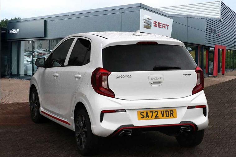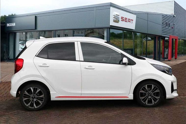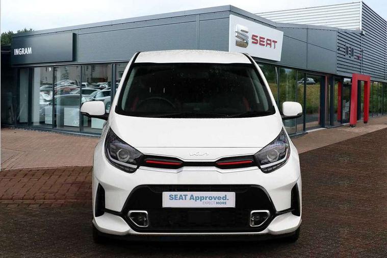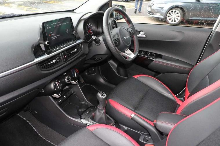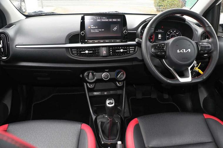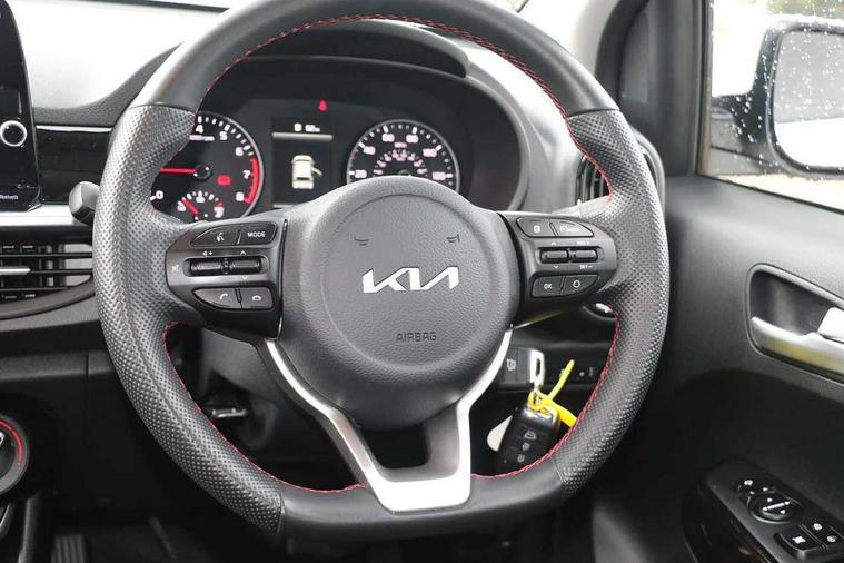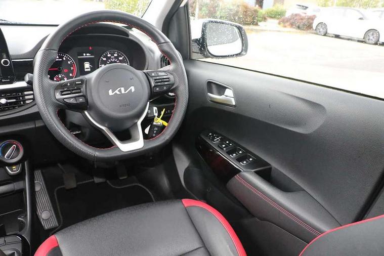 8" touchscreen display with RDS and DAB, Apple car play/Android Auto with voice control, Emergency call service, Emergency stop signalling system, External temperature gauge, Motor driven power steering, Reversing camera system with dynamic guidelines (Integrated into centre fascia screen), Tachometer, Trip computer, 6 speaker audio system, Bluetooth with music streaming, Steering wheel mounted controls, USB ports for connection of a media device, Automatic headlight control system, Bi-function projection headlights, Black beltline mouldings, Black grille with silver surround, Body colour B pillars, Body colour bumpers, Body colour mirrors and door handles, Body colour side sill mouldings, Day/night rear view mirror, Electric adjustable/heated/folding door mirrors with LED indicators lights, Front and rear electric windows with drivers's auto up/down function, Front fog lights, Headlamp levelling, Heated rear window, High mount brake light, LED daytime running lights, LED rear fog lights, Privacy glass - Rear windows and tailgate, Rain sensor, Rear side wing doors, Rear wash/wipe, Speed variable front wipers, Sports front and rear bumpers with gloss black skid plates twin exhaust, Tinted glass, Visible VIN plate, Welcome and follow-me home light functionality, 1 x rear coat hook, 12V power point front, 2 seat bench in 2nd row, 3 x passenger assist grips, 60/40 split/folding 2nd row of seats, All round height adjustable headrests, Black and red accents front door armrest, Centre Console with Storage Box and Sliding Armrest, Cupholders in centre console, D-cut steering wheel with red stitching, Driver and front passenger sunvisor with vanity mirror, Driver seat height adjust, Faux leather upholstery, Front cabin lights, Glovebox, High gloss lower centre fascia trim, door armrest and air vents, ISOFIX Child seat top tethers and anchor fixings, Leather trimmed steering wheel and gearshift, Luggage area light, Luggage area parcel shelf, Manual air conditioning, Passenger front seatback pockets, Satin chrome interior door handles, Single front passenger seat, Slide/reclining front seats, Tilt adjustable steering wheel, Advanced Driver Assistance Pack - Picanto, 2 x 3-point rear seatbelts, ABS/EBD, Automatic unlocking of doors in case of impact, Dual front airbags, ESC + BAS + VSM + HAC, Front passenger airbag cut-off switch, Front seatbelt height adjusters, Front seatbelt pretensioners + load limiters, Hill hold control, Knee airbags, Rear child proof door locks, Seatbelt warning, Side impact protection, Torque vectoring brake based and straight line stability (SLS), Traction control, Twin curtain airbags, Twin front side airbags, Tyre pressure monitoring system, Anti theft alarm, Engine immobiliser, Folding key, Locking wheel nuts, Remote central door locking, 16" alloy GT-Line wheels, Tyre mobility kit,