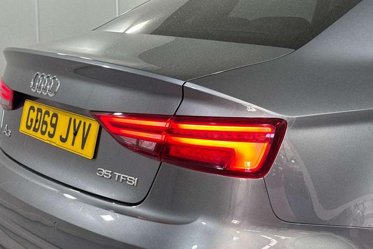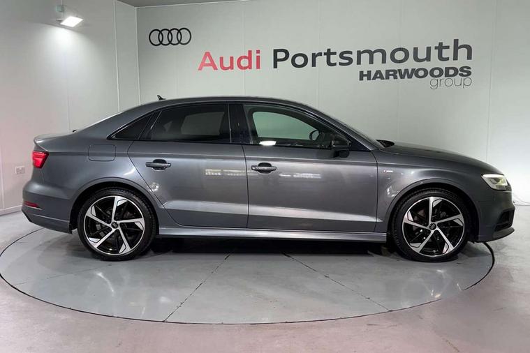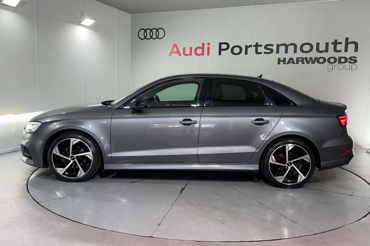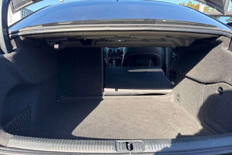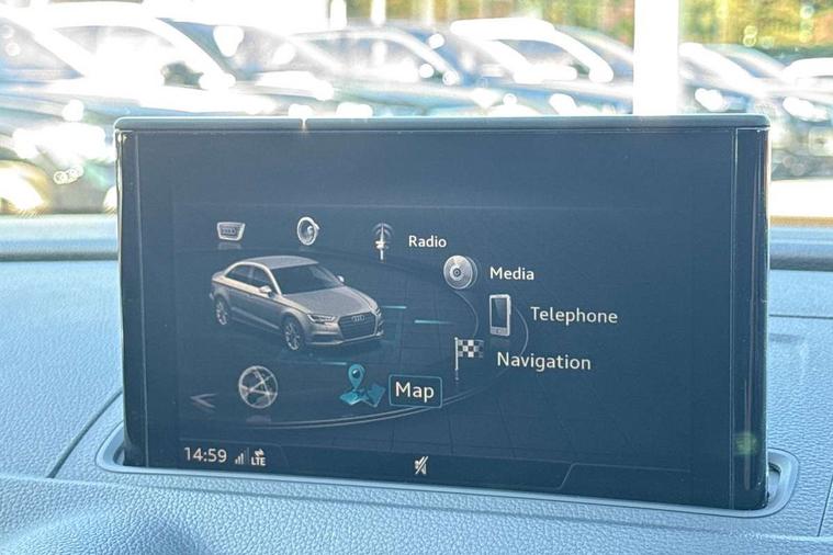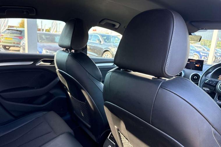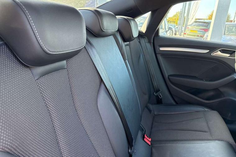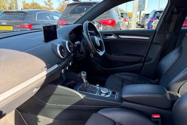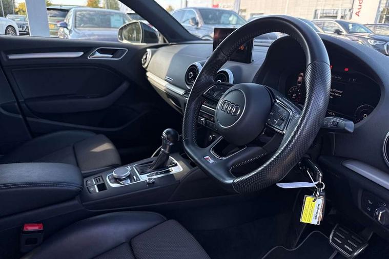 Audi connect, Audi drive select, Audi smartphone interface, Automatic start/stop system, Bluetooth interface, Colour driver's information system display, Electro-mechanical PAS, SD card based MMI navigation, Service indicator, Voice control system, Sports suspension, 2 USB interfaces and Aux-In jack, CD player, DAB Digital radio, MMI radio plus with 7" colour MMI screen and MMI controller, Two SDXC card slots, Auto dimming rear view mirror, Automatic lights and wipers, Black door mirrors, Body colour bumpers, Dual branch tailpipe, Electrically adjustable and heated door mirrors with integrated LED side indicators, Front and rear electric windows, Heated rear window, Heated windscreen washer jets, Model and engine designation badges at rear, Privacy glass - dark tinted rear and rear side windows from B-pillar backwards, S Line badges on the front wings, S Line body styling with high gloss dark chrome radiator grille and rear diffuser in platinum grey, S Line roof edge spoiler, Single chrome exhaust tailpipe, 3 adjustable rear headrests, 3 spoke flat bottomed high multi-function leather sport steering wheel with gearshift paddles, 4 lashing points to secure luggage, 60/40 split folding rear seat, Adjustable front centre armrest, Black cloth headlining, Driver/passenger sunvisors, Dual zone electronic climate control, Front and rear interior lights with delay, Front sport seats with S embossed logo, Front/rear floor mats, Height/depth adjustable steering column, Illuminated door sill trims with S logo, Illuminated glovebox, Illuminated luggage compartment, ISOFIX child seat mounting and Top Tether with front passenger airbag deactivation, Manual height adjustable front seats, Stainless steel pedals, Storage compartments in doors side trims, centre console and under front drivers seat, Black styling pack - A3/S3, LED interior light pack - A3/RS3, Non smoking pack - A3, Storage and luggage pack - A3/RS3, 3 point seatbelts on all seats, ABS/EBD, Active front headrests, Airbags - front driver/passenger, front & rear side, curtain, drivers knee, ASR, EDL, Electromechanical parking brake, ESC - Electronic Stability Control + traction control, Hill hold assist, Predictive pedestrian protection, Seatbelt warning, Tyre pressure warning, Warning triangle and first aid kit, Anti theft alarm, Anti-theft wheel bolts, Immobiliser, Remote control central locking, Aluminium air vent surrounds, Aluminium trim elements, Matt brushed aluminium inlays, 18" 5 arm trapezoid design sport alloy wheels in gloss anthracite black with diamond cut finish, Tool kit, Tyre repair kit,