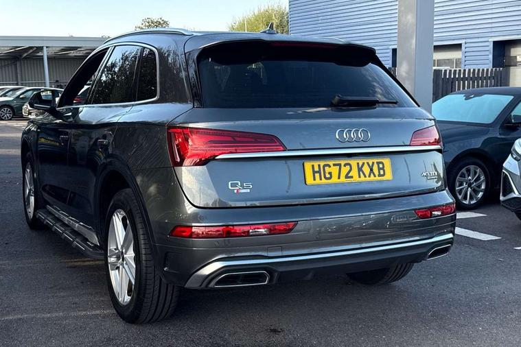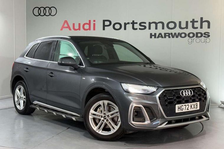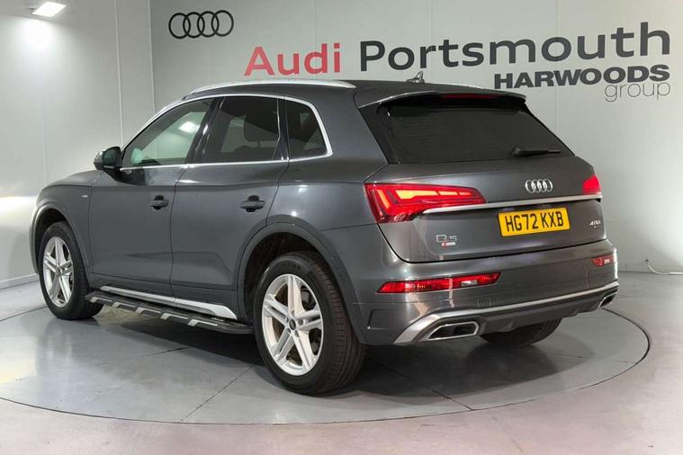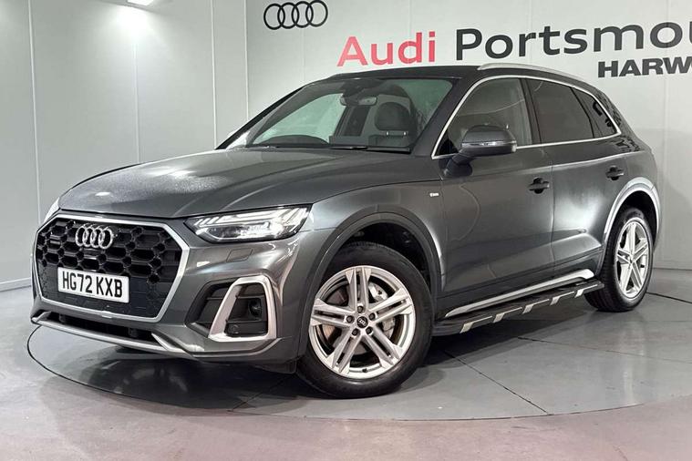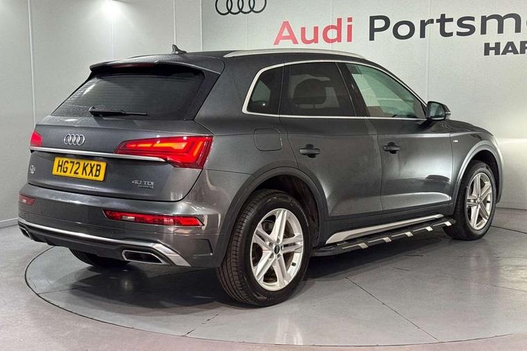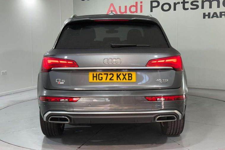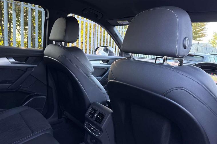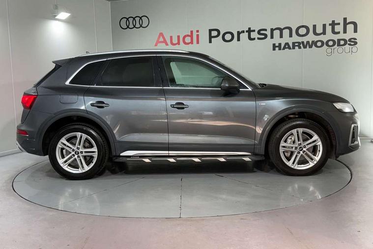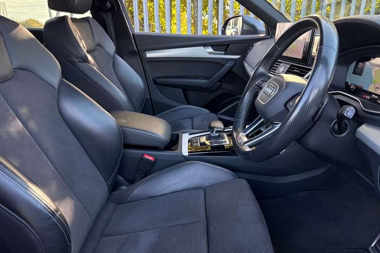Audi connect safety and service (e-call), Audi connect with Amazon Alexa Integration, Audi drive select, Audi virtual cockpit plus with 12.3" screen and three different layout designs, Audi wireless smartphone interface, Automatic start-stop system with coasting functionality and efficiency programme, Bluetooth interface, Electro - mechanical power assisted steering, MMI navigation plus with 10.1" touch screen, Power tailgate, Reversing camera, Service interval indicator, Voice control system with Audi hotword activation "Hey Audi", Diesel particulate filter, Quattro on demand, S line sports suspension, DAB Digital radio, Acoustic windscreen, Aluminium roof rails, Audi matrix LED headlights with dynamic front and rear indicators, Auto dimming door mirrors, Auto dimming rear view mirror, Automatic headlight adjustment, Automatic headlights and windscreen wipers, Body colour bumpers, Body colour door mirrors, Body colour rear diffuser with matt aluminium silver surrounds, Body colour underbody protection, Chrome plated exhaust trims, Daytime running lights, Door sills in Selenite silver, Electric adjustable/heated/folding door mirrors, Front air inlet surrounds in aluminium, Front and rear electric windows, Front radiator grille in honeycomb design, Headlight washers, High level LED brake light, Lower bumpers painted in contrast Manhattan grey, Rear chrome trim strip below lights, Rear privacy glass and rear side windows, Rear side wing doors, Rear wiper, Roof bars, S Line badges on the front wings, S Line front and rear bumpers, S Line rear spoiler, S Line side skirts, 2 x USB charging port with aux input socket, 3 rear headrests, 40:20:40 split folding 3 rear bench seat in 2nd row with rear centre armrest, Black cloth headlining, Comfort front centre armrest, Contrast stitching on seats, steering wheel and gear lever gaiter, Deluxe 3 zone electronic climate control, Front/rear floor mats, Gear lever in black leather, Heated front seats, Height adjustable front head restraints, Height/reach adjustable steering column, Illuminated door sill trims with S logo, ISOFIX child seat mounting and top tether, Luggage compartment cover, Manual seat adjustment with 4-way electric lumbar support, Removable luggage compartment floor, Single front passenger seat, Stainless steel pedals, Sunvisors with vanity mirrors, High gloss pack - Q5, LED interior light pack - Q5, 3 point seatbelts on all seats, 6 airbags - Driver, front passenger, curtain and side airbags, Electrically operated child locks on rear doors, Electromechanical parking brake, Electronic stabilisation control including ABS, ASR and EDL, Front passenger airbag deactivation, Hill descent control, Hill hold assist, Multi collision brake assist, Pop-up bonnet for pedestrian protection, Pre sense city, Seat belt force limiter, Seatbelt monitoring, Tyre pressure warning, Warning triangle and first aid kit, Anti theft alarm, Anti-theft wheel bolts, Keyless Go access/ignition system, Remote central locking, Matt brushed aluminium inlays,