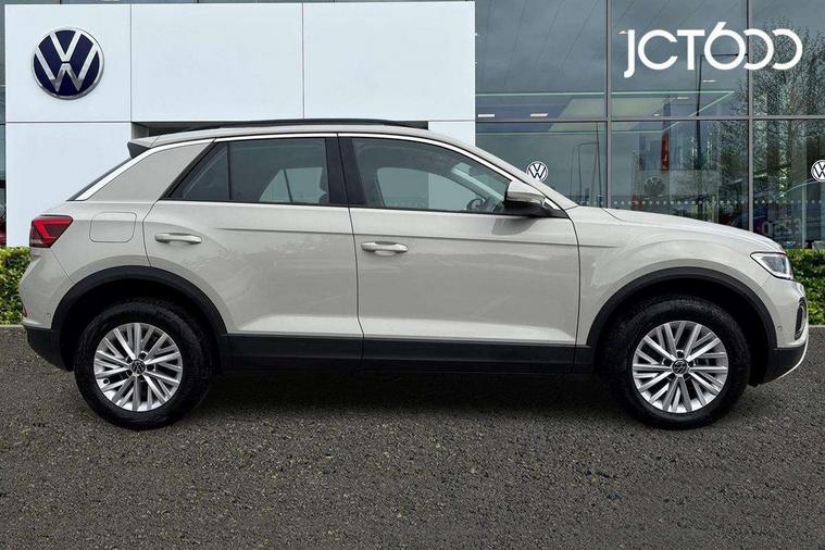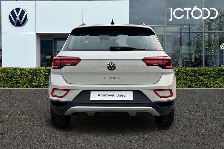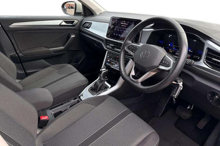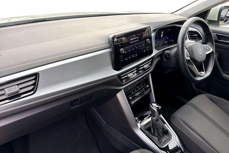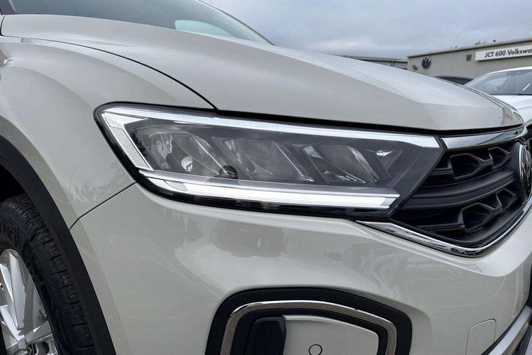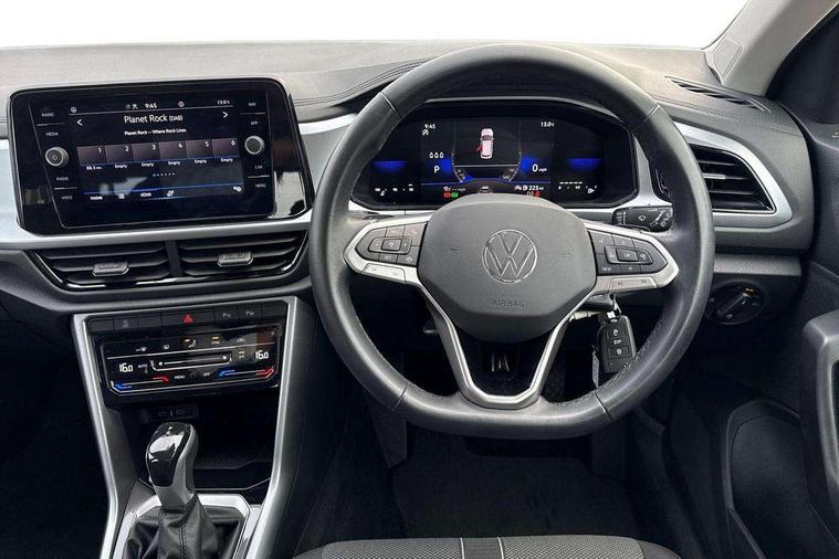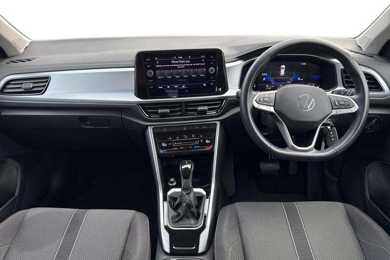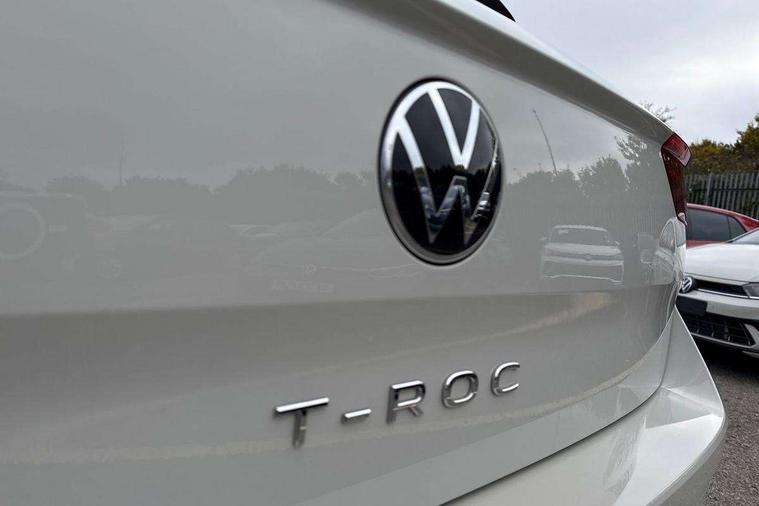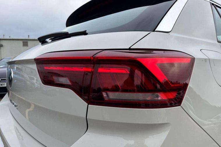 Bluetooth mobile phone interface, Driver alert system with fatigue detection, Driver tips and journey analysis, Emergency call service, Lane keeping system Lane Assist, Modified key software - reduce switch off time for key status change to Long no motion, Online services, Park assist including front and rear parking sensors, Power assisted speed sensitive steering, Service interval indicator, Tailgate/trunk lid release from outside, Think blue trainer driver tips and journey analysis, Warning sound and light for front seatbelts unfastened, Wireless app connect, Battery regeneration during braking, Front shock absorption, Rear shock absorption chassis with increased ride height, Start/stop function with battery regeneration, DAB Digital radio, Diversity antenna for FM reception, Front and rear 6 speakers, Music playback - MP3, WMA and AAC files, Premium USB cable in choice of either Apple or Android smartphone compatibility, SD card slot, Simultaneous pairing of 2 compatible mobile devices, Title and cover art display, We Connect and We Connect Plus functionality, 3rd brake light, Auto dimming interior rear view mirror, Automatic hazard lights activation under emergency braking, Automatic headlight control with LED separate daytime running lights with coming/leaving home function, Black roof rails, Body coloured bumpers and radiator grille with chrome trim and front fog lamps with chrome bezel, Body coloured exterior mirror housings and door handles, Extended roof spoiler, Exterior mirrors aspherical on driver side, convex on front passenger side, External USB type C socket and charging sockets, Front windscreen wiper with intermittent wipe and 4 position delay, Heated rear window, LED Headlights, LED rear combination lamps, LED rear number plate lights, LED tail lamp rear comination lamps, Power windows with comfort operation and circuit breaker, Rain sensor, Rear exhaust tailpipe, Rear fog light on one side and reversing lights on both sides, Rear side wing doors, Rear wash/wipe with intermittent wipe setting, Remote electrically foldable door mirrors, puddle lights and reverse activated passenger's door mirror, 12V power socket in centre console, 3 rear head restraints, 3 seat bench in 2nd row, 4 load lashing points in luggage compartment, Air care climatronic air conditoning system with active combination filter and 2-zone temperature control, Ambient lighting with mirror logo projection, Cloth upholstery, Door and side trim panel in cloth, Drawer under drivers seat, Driver/front passenger seat height adjustment, Front centre armrest, Front comfort sports seats, Front cupholders x 2, Front reading light, Instrument lighting, white adjustable panel illumination, Interior light delay, Isofix child seat preparation, Leather gearshift handle, Load-through provision with cup holder when folded down ('Unsplit rear seat bench, split folding backrest, with centre armrest), Luggage compartment lighting, Lumbar support for driver's and front passengers seat, Non-folding front passenger seat backrest, Single front passenger seat, Storage compartment in left and right luggage area, Storage compartment in rear doors, Storage compartments in driver and front passenger doors, Sunvisors with illuminated vanity mirrors, Variable boot floor, height adjustable and removable, Driver assistance pack without proactive passenger protection - T-Roc, 3 point height adj front seatbelts + pretensioners, 3 point seatbelts in outer rear with ECE label, ABS, Child locks on rear doors, Driver and front passenger airbag with front passenger airbag deactivation, Driver and front passenger safety-optimised head restraints, Drivers seatbelt reminder, Electronic parking brake, Electronic Stability Control (ESC) inc EDL (Electronic Differential Lock) and ASR (Traction Control), Front and rear passengers curtain airbag system including front side airbags, Front assist with city emergency braking and pedestrian monitoring, Front disc brakes, Front seat side impact airbags, Hill start assist, Predictive pedestrian protection, Rear disc brakes, Single tone horn, Tyre pressure loss indicator, Volkswagen roadside assistance, Alarm with interior protection, Anti-theft alarm system with interior monitoring, backup horn, and towing protection, Remote central locking with SAFELOCK, radio remote control with 2 remote control folding keys, Pewter matt decorative inserts for intrument panel, centre console and door panels at the front, Trims for alloy wheels,