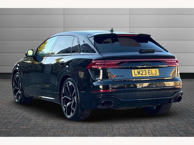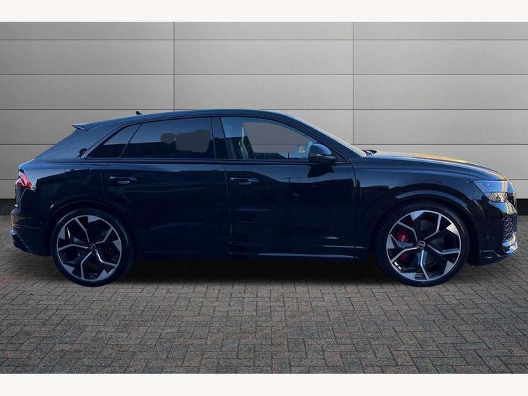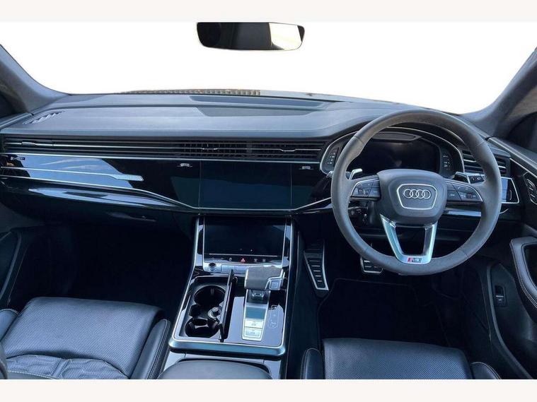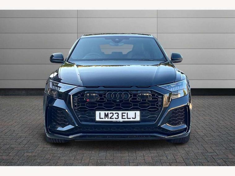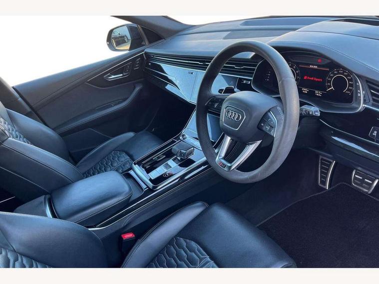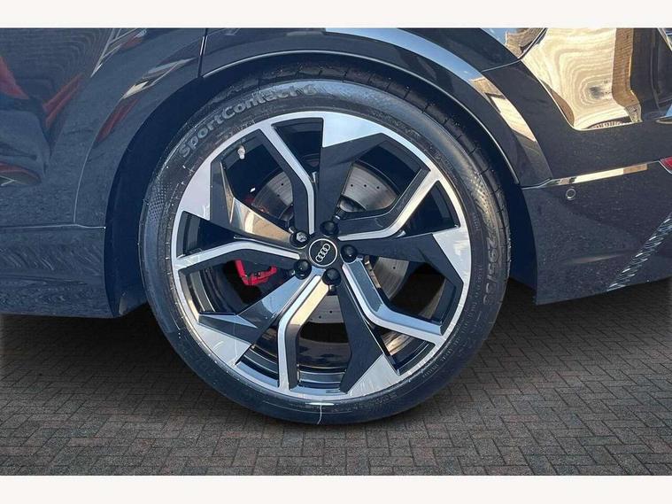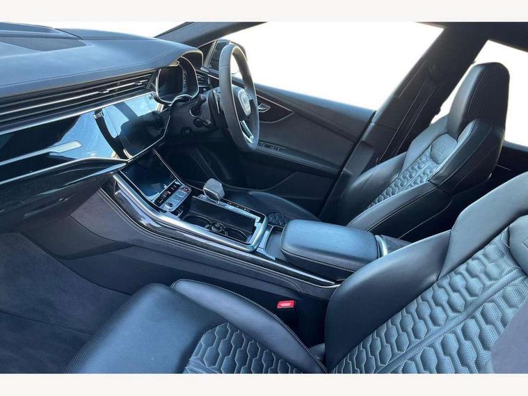 10.1" and 8.6" Dual colour touchscreens, 2 USB ports with charge and data functions in the rear, All wheel steering, Audi connect safety and service (e-call), Audi connect with Amazon Alexa Integration, Audi smartphone interface includes wireless Apple carplay/Android Auto, Audi virtual cockpit - 12.3" high resolution LCD display with fully customisable instrument cluster and RS specific menus and options, Automatic start/stop system, Bluetooth interface, Electro-mechanical PAS, Head up Display, MMI navigation plus with MMI touch, Natural voice recognition, On board computer, Operating buttons in black, glass look with haptic feedback, Power door closure, Power operated tailgate, RS Audi drive select, Service interval indicator, 48V Mild hybrid technology, Electromechanical active roll stabilisation, Quattro all wheel drive with sport differential, RS specific Adaptive air suspension, Audi music interface with 2 USB ports with charge and data functions, Aux-in socket, DAB Digital radio, Adaptive windscreen wipers with integrated washer jets, Audi Beam uses LEDs to project Vorsprung logo, Audi HD Matrix LED headlights in RS specific design with dynamic front and rear indicators, Auto dimming frameless rear view mirror, Electric front+rear windows, Electric panoramic glass sunroof, Electrically folding auto dimming/adjustable/heated door mirrors with memory function, LED side indicators and kerb view function for passenger side, Gloss black finish for exterior Audi rings and RS Q8 logo, Headlight washers, Heat insulating glass in windshield, Illuminated door sill trims with RS logo, LED 3rd brake light, LED signature daytime running lights, Privacy glass - dark tinted rear and rear side windows from B-pillar backwards, Rain and light sensors, Rear side wing doors, Rear wiper, RS badges on front wings, RS coming/leaving home animations in front and rear, RS manhattan grey front spoiler lip and rear diffuser insert, RS manhattan grey grille surround with honeycomb grille insert in black, RS specific bumpers in full body colour paint finish, RS sport exhaust system with black exhaust tips, 3 bench rear seats in 2nd row, 4 zone automatic climate control, 4-way lumbar support for front seats, 40:20:40 split folding rear bench seat, Black dinamica headlining, Comfort front centre armrest, Double sun visor with illuminated vanity mirror on driver and passenger side extendable, Driver and front passenger seat memory function for electrically adjustable front seats, Electric adjustable steering column with memory functionality, Electric sunblind for the rear side windows and manual sunblind for the rear window, Front head restraints, ISOFIX child seat mounting for front passenger seat and 2 outer rear seats with top tether child seat mounting for all 3 rear seats, Luggage compartment sill protection in stainless steel, Massage and ventilation function for front seats, Perforated Valcona leather upholstery + RS front super sports seats + honeycomb pattern with RS embossed logo, Rear headrests, Rear seat bench plus, Single front passenger seat, Stainless steel pedals, Tool kit, Air quality package - RS Q8, Anthracite black styling pack - RS Q8, City assist pack - Q8, Comfort and sound pack - RS SQ8, Multi-coloured extended LED interior lighting pack - RS Q8, RS specific styling pack - RS Q8, Tour pack - Q8, 3 point seatbelts on all seats, Audi pre sense front, Child locks on rear doors, Driver and front passenger, front side and curtain airbags, Electromechanical parking brake, Electronic Stability Control (ESC) including ABS, ASR and EDL, Front passenger airbag deactivation, Hill descent control, Hill hold assist, Predictive pedestrian protection, Seatbelt monitoring, Tyre pressure loss indicator, Warning triangle and first aid kit, Advanced key, Anti theft alarm with tow away protection, Anti-theft wheel bolts and wheel loosening detection, Immobiliser, 23" x 10.5J 5 Y spoke rotor design Audi sport alloy wheels in gloss anthracite black with diamond finish, Tyre repair kit,