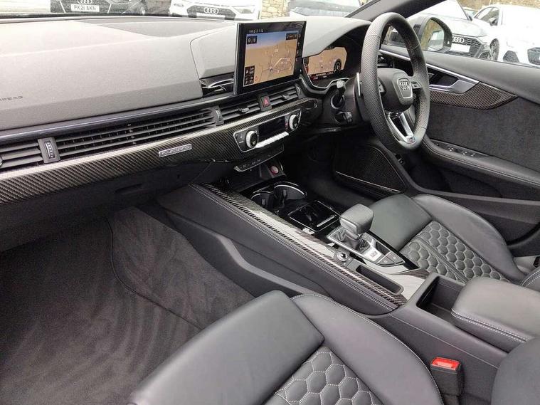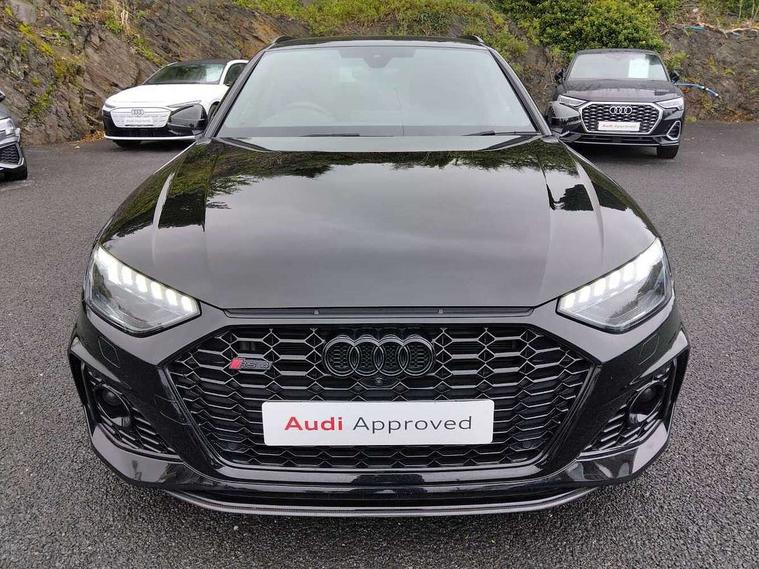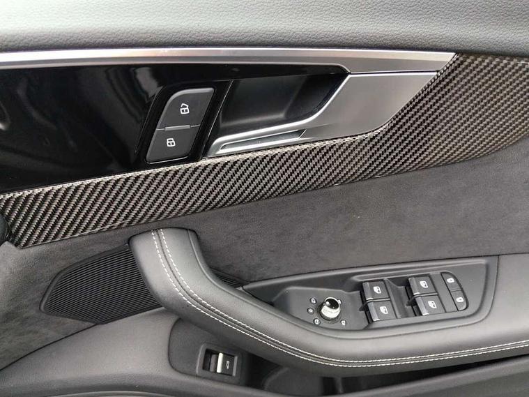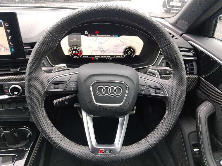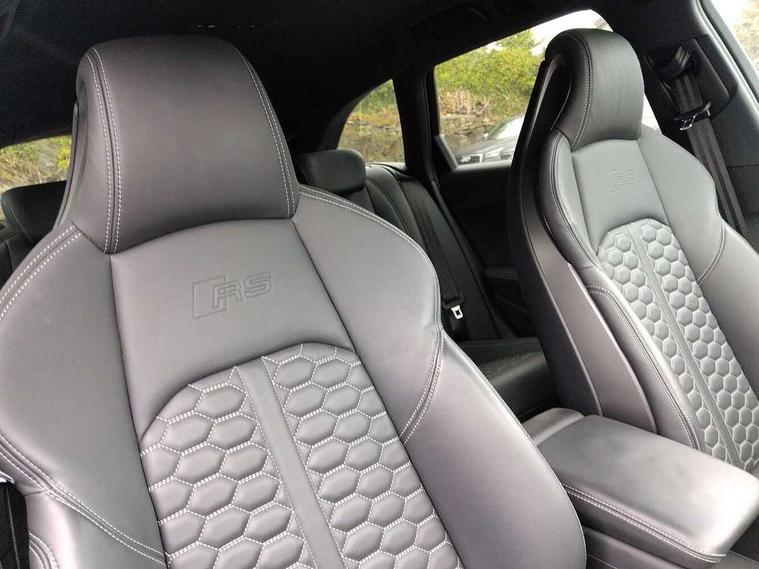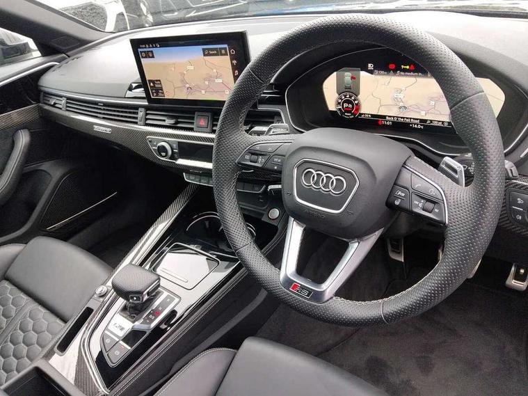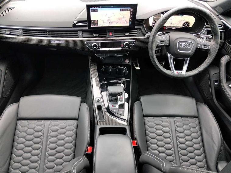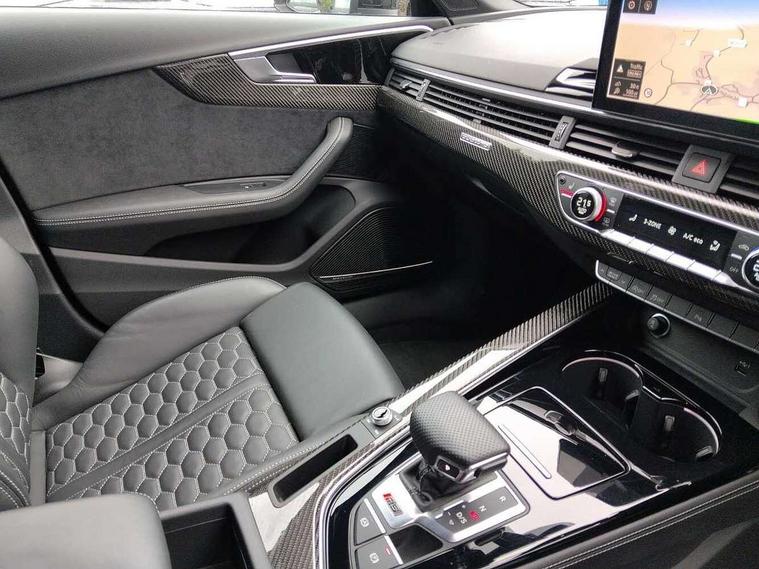 7" Colour driver information system, Audi connect safety and service (e-call), Audi drive select, Audi side assist, Audi smartphone interface, Audi virtual cockpit with RS specific display, Automatic start-stop system with coasting functionality and efficiency programme, Bluetooth interface, Camera based traffic sign recognition, Electromechanical power steering, Email, calendar and text messages displayed via MMI, Lane departure warning, MMI Navigation plus with MMI touch includes 10.1" high resolution colour MMI display, 3D map, Power opening/closing tailgate, Service interval indicator, Voice control system, 58 Litre fuel tank, Quattro sports differential, 2 USB charging ports, Audi sound system, DAB digital radio module, 3rd brake light, Acoustic windscreen, Audi Beam uses LEDs to project the RS logo onto ground as you exit your RS4, Audi matrix LED headlights with LED rear lights + dynamic front and rear indicators, Audi rings and lettering glossy black, Auto dimming rear view mirror, Automatic headlights + automatic windscreen wipers, Black roof rails, Blue tinted glass, Body colour door handles, Electric front windows, Electric rear windows, Electrically folding auto dimming/adjustable/heated door mirrors with memory function, LED side indicators and kerb view function for passenger side, Flared front and rear wheel arches, Front bumper with enlarged air inlets, Headlight range control, High beam assistant, High gloss black door mirror housing, High gloss black triangular aperture at rear door, Honeycomb design grille with quattro logo, Lateral air inlets next to front headlights, LED daytime running lights, LED indicators in door mirrors, Privacy glass with rear acoustic glazing, Rain and light sensors, Rear side wing doors, Rear wiper, Roof spoiler, RS 4 badges on grille and rear, RS4 dual branch chrome tailpipes with left and right oval pipes, 3 seat bench in 2nd row, 3 spoke multifunction plus leather steering wheel with heating and RS badging, 40/20/40 split folding rear seats with rear centre armrest, Black cloth headlining, Deluxe 3 zone electronic climate control, Door armrests and knee pad, Electric load area cover, Electrically adjustable front seats, Fine nappa leather with contrast honey comb stitching + super sports seats with pneumatic massage function, Front centre armrest, Front headrests, Front/rear floor mats, Heated front seats, Height and reach adjustable steering wheel with full size airbag, Illuminated door sill trims with RS4 logo, ISOFIX child seat mounting and top tether, Luggage compartment carpet, Perforated leather gear lever knob with contrast stitching, Rear headrests, Retractable load area cover, Single front passenger seat, Stainless steel pedals, Sunvisors with vanity mirrors, Carbon black styling pack - RS4, LED Interior light pack - RS4, Non Smokers pack, 3 point seatbelts on all rear seats, Adaptive driver and front passenger airbags, Attention and drowsiness assist, Electromechanical parking brake, Electronic stabilisation control including ABS, ASR and EDL, Enhanced braking system, Front head airbags, Front seatbelt pretensioners + load limiters, Front side airbags, Hill hold assist, Manual child lock in rear doors, Multi-Collision braking, Pop-up bonnet for pedestrian protection, Pre sense city, Rear side airbags, Seatbelt monitoring, Traction control, Tyre pressure warning, Variable restraint system, Warning triangle and first aid kit, Anti theft alarm, Anti-theft wheel bolts, Immobiliser, Keyless Go, Remote central locking, Remote control key with RS emblem, Carbon twill inlays, 20" 5 segment spoke evo design glossy black sport alloy wheels, Tool kit, Tyre repair kit,