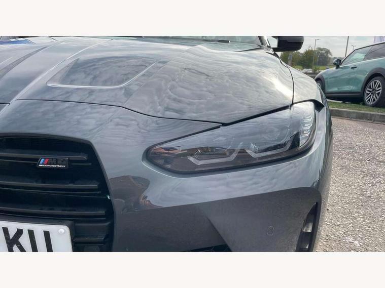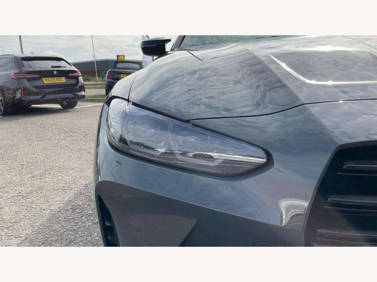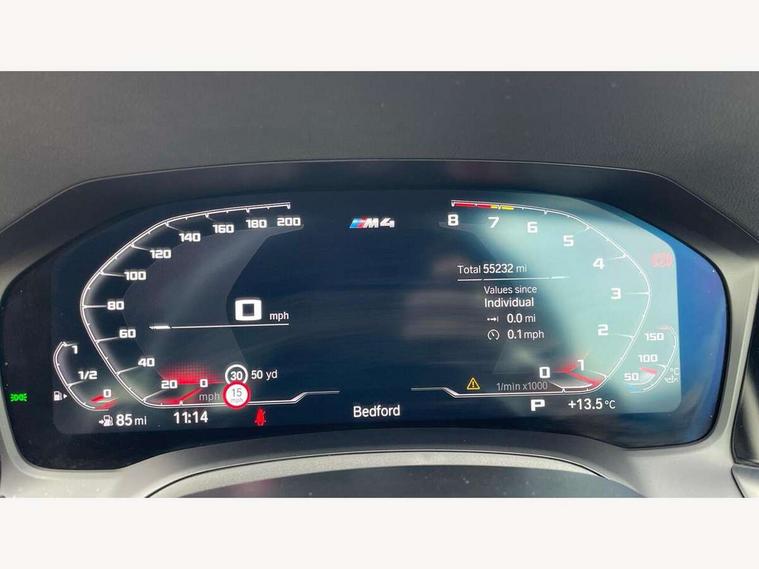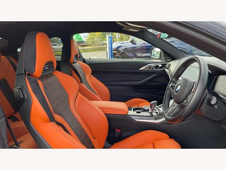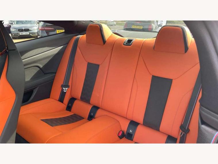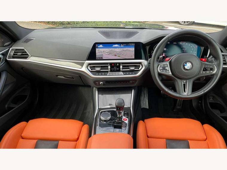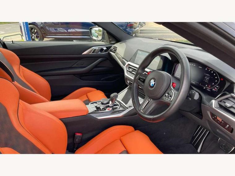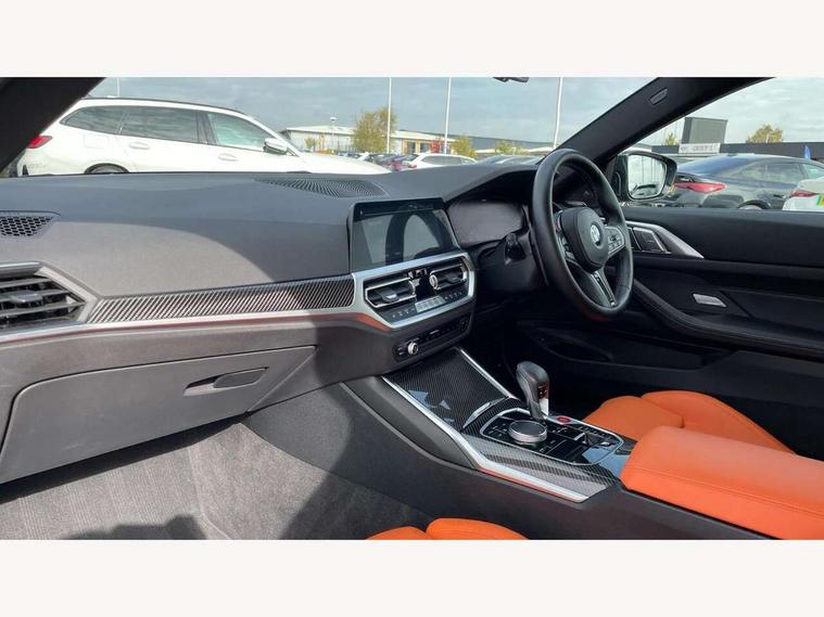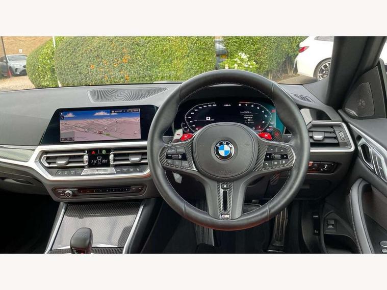 Active guard plus, Automatic start/stop system, BMW ConnectedDrive online services, BMW iDrive controller on centre console, BMW legal emergency call, BMW Live Cockpit Professional sat nav system with 12.3" instrument display and high resolution control display, BMW Teleservices, Brake pad wear indicator warning light, Condition based service, Connected drive services, Door/boot open warning light, Driving experience switch, Electric Power Steering (EPS) with Servotronic, Enhanced bluetooth with wireless charging, Head up Display, Instrument cluster with extended contents, Lights on warning, M drive buttons, Oil sensor for level and grade, warning by check control system, Oil temperature gauge, On board computer, On board diagnostics, Optimum shift indicator, Outside temperature display, Pull away assistant, Run flat indicator, Service interval indicator, Shifting point display, Speed limiter, Variable sport steering, Wi-Fi hotspot, Adaptive M Sport suspension, Double joint spring strut front axle, M Drive Professional including track mode, laptimer, traction control & Drift analyser, M Sport differential, M steptronic sport transmission with drivelogic, Safety battery terminal clamp, 8 programmable favourite buttons, Auxiliary point for auxiliary devices, BMW professional radio/CD/MP3, DAB Digital radio, Harman/Kardon loudspeaker system, Acoustic laminated side glass, Auto dimming driver's door mirror, Auto dimming rear view mirror, Automatic headlights + automatic windscreen wipers, Black chrome exhaust tailpipes, Black model designation badges, BMW high gloss shadow line with extended contents, BMW Individual shadowline lights, Body colour bumpers, Body colour door handles, Carbon fibre reinforced plastic (CFRP) roof, Day time running light, Door mirror integrated indicators, Door sill finishers with aluminium inserts, Dynamic brake lights, Electric adjustable heated door mirrors, Electric folding door mirrors, Follow me home headlights, Front and rear bumper system, Front electric windows with open and close fingertip control, anti trap facility and comfort closing, Headlight beam throw control, Heat protection, sun protection glazing, Heated washer jets, High beam assistant, High gloss black frameless kidney grille with M badge, LED number plate light, LED tail lights with 3D L-shaped LED light design, M designation, Mirror glass aspheric on driver's side, convex on passenger side, Rain sensor, Rear boot, Rear fog lights, Rear reflectors, Reversing light, Shark fin roof aerial, Third brake light, Visible VIN plate, Welcome lighting, 2 cupholders in front centre console, 2 rear head restraints, 2 x 12 V Power sockets (luggage compartment and front centre console), 2 x USB Type C ports for charging and data transmission in front centre console, 2 x USB Type C ports for charging in rear centre console, 40:20:40 split folding rear 2 seat bench with loading system, Ambient lighting, Anthracite headlining, Battery in luggage compartment, Carbon fibre centre console incl. cover for cupholders, Carbon fibre decorative steering wheel finishers, Carbon fibre shift paddles, Carbon fibre strip in instrument panel on front passenger side, Centre console armrest with storage compartment, Compartment in front of cupholder, Driver/passenger sunvisors with illuminated vanity mirrors + covers, Electric front seats + driver memory, English handbook, Floor mats in velour, Footwell lighting, Front and rear door exit lights, Front door storage bins with bottle holder, Front interior light, Front isofix attachment + airbag deactivation, Front seat backrest width adjustment, Front seats lumbar support, Front/rear door armrests, Gearshift lever with embossed M badge, Heated front seats, Height adjustable front headrests, Interior mirror lighting, Isofix on 2nd row outer seats, Lockable/illuminated glovebox, Luggage compartment lighting, Multifunction steering wheel, Rake/reach adjustable steering wheel, Single front passenger seat, Storage compartment in rear doors, Storage tray and compartment with cover in centre console, Three zone automatic air conditioning, Toolkit located in luggage compartment, Additional storage compartment pack - M4, Connected package professional - M4, High gloss shadowline exterior trim pack - M4, 4 x 3 point seatbelts, ABS/EBD, Automatic Stability Control (ASC), Brake energy regeneration, Brake fade compensation, Compound structure brake discs, Cornering brake control (CBC), Crash sensor, Curtain airbags, Driver/Front Passenger airbags, Dry braking, Dynamic brake control, Dynamic Stability Control with M Dynamic mode, Dynamic Traction Control - DTC, Electromechanical parking brake, Electronic differential lock control (EDLC), Front and rear head airbags, Front seat side impact airbags, Front seatbelt pretensioners + load limiters, Hill start assist, M Sport seat belts, Seatbelt warning, Side impact protection, Two tone horn, Tyre pressure sensor, Warning triangle and first aid kit, Centre lock switch, Closing system with central locking, Digital key, Electronic immobiliser, Remote central locking, Thatcham cat 1 remote alarm, Vehicle Key with 4 buttons including the integrated key, Galvanic finish to control surrounds, High gloss black interior trim, Tyre repair kit,