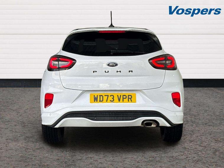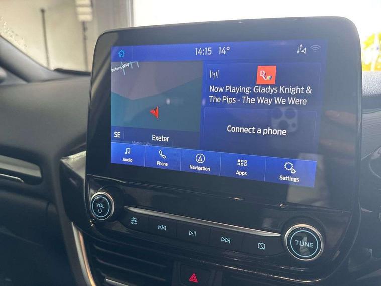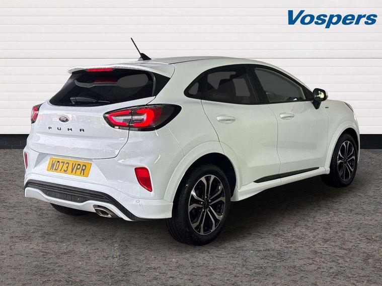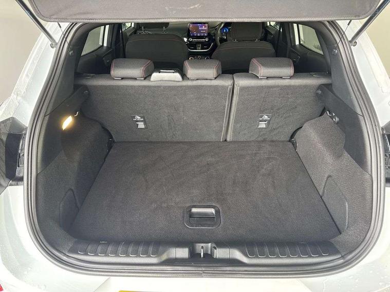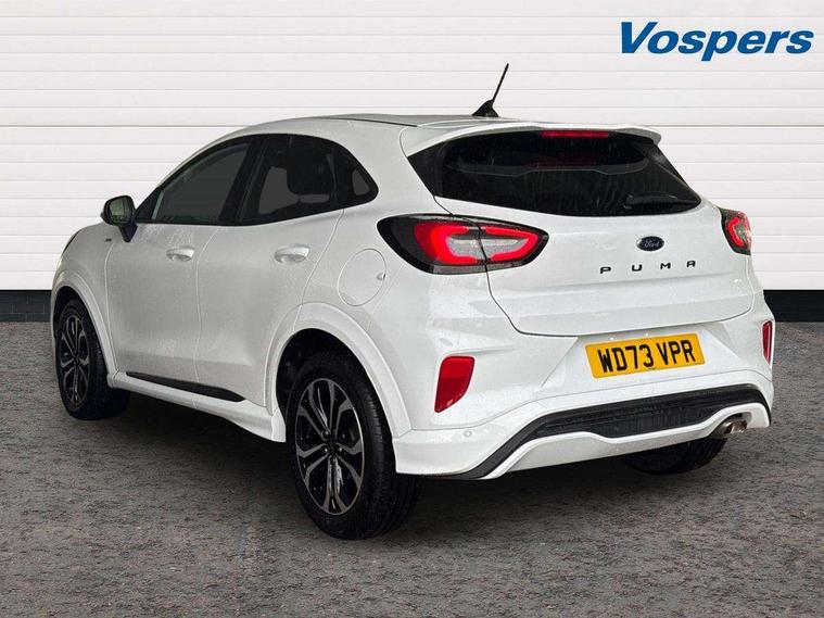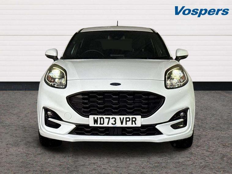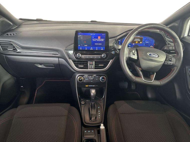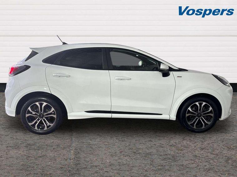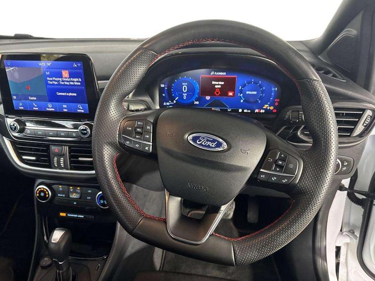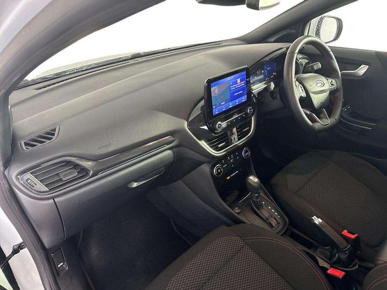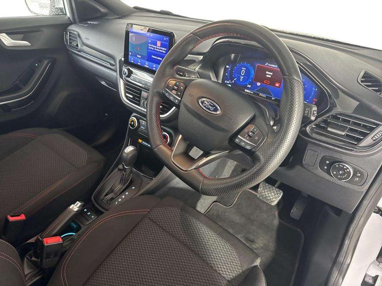 Driver impairment monitor, Emergency call service, Ford easy fuel, Full digital 12.3" instrument cluster, Lane keeping aid with lane departure warning, Power assist steering, Power start button, Rear parking sensor, Selectable drive modes(Normal, sport, Eco, trail, slippery), Speed sign recognition, Sport suspension, Automatic headlights with auto high beam, Automatic rain sensing wipers, LED rear lamps, Power foldable heated door mirrors with puddle lamps, Projector headlamps with LED day time running lights and front fog lamps, Quickclear heated windscreen, Rear side wing doors, Rear wiper, ST-Line body styling kit with unique grille, Third brake light, 3 seat bench in 2nd row, Centre console with armrest and stowage, Ford megabox extended bootspace, Front and rear head restraints, Front floor mats, Manual 2 way passenger seat adjustment, Manual 4 way driver seat adjust with lumbar adjustment, Single front passenger seat, ST- Line cloth trim with red stitching, ST-Line flat bottomed sensico leather steering wheel with leather handbrake and aluminium gear knob, Ford SYNC 3 navigation pack - Puma, 3 rear seatbelts, Child safety lock, Electronic stability control (ESC) and hill start assist, Pedestrian/cyclist detection & post-collision braking, Pre collision assist system, Tyre pressure monitoring system (TPMS), Thatcham alarm,