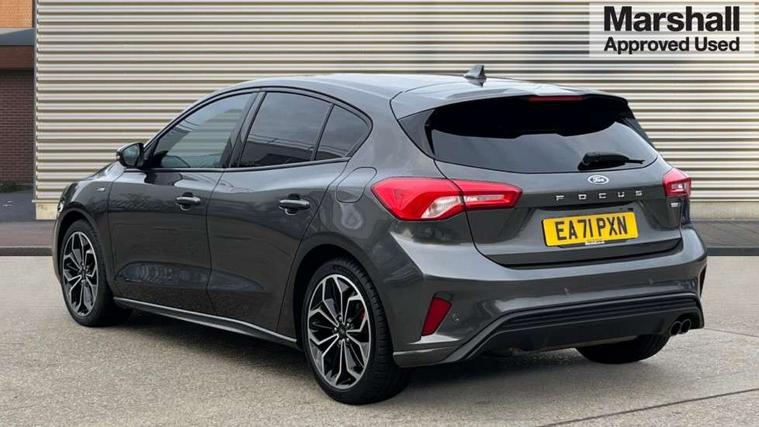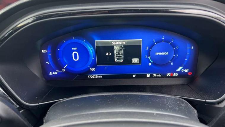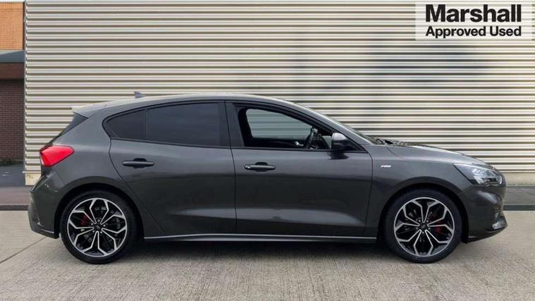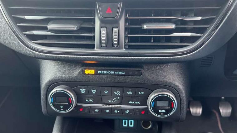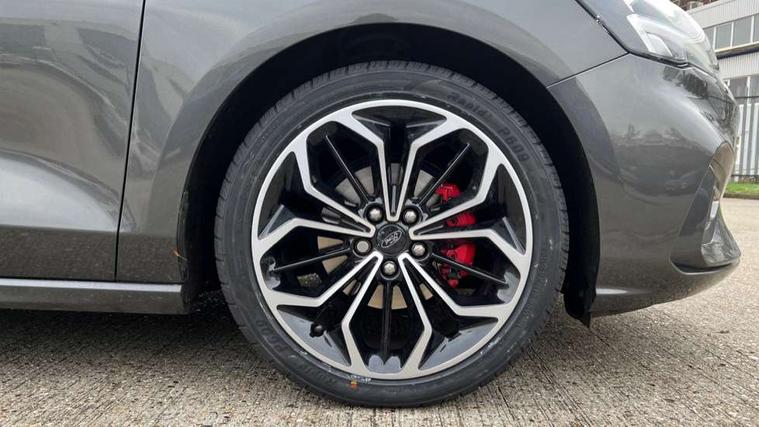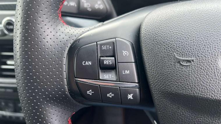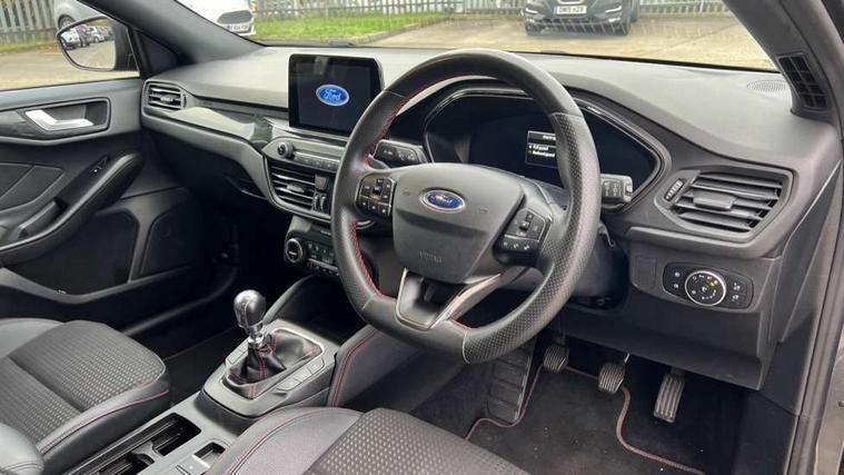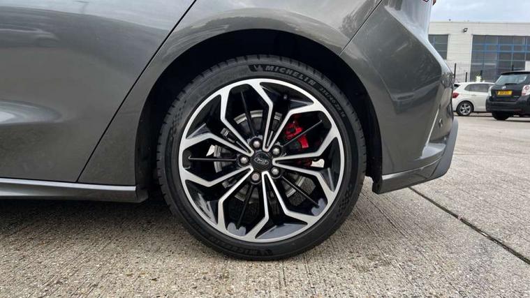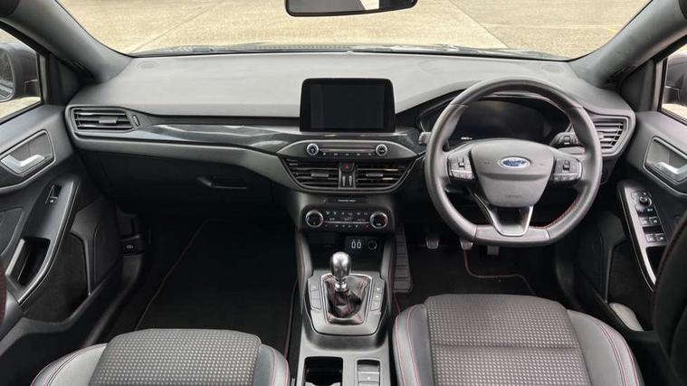 12.3" Digital instrument cluster, Bluetooth system, Digital clock, E-call, Easy fuel capless refuelling system, Eco mode, Ford SYNC 3 navigation with 8" TFT touchscreen, DAB radio and app link Android auto/Apple carplay, Intelligent speed assist, Lane keeping system - lane keeping alert and lane keeping aid, PAS, Selectable drive mode, Trip computer, Sports tuned suspension, 2 USB ports, Aux input, Auto dimming rear view mirror, Auto headlamps (on/off), Automatic rain sensing wipers, Body colour large rear spoiler, Body coloured bumpers, Body coloured door handles, Body coloured electrically operated and heated door mirrors with side indicators, Electrically operated front and rear windows with one touch opening and closing, Front variable intermittent wipers with electric wash, Heated rear window, LED daytime running lamp, Polished twin tailpipe, Power folding door mirrors with puddle lights, Quickclear heated windscreen, Rear privacy glass, Rear side wing doors, ST-Line upper and lower grille with full body styling kit and wing badges, Tailgate wash/wipe, Third brake light, Unique door and instrument panel inserts, 3 seat bench in 2nd row, 3 spoke flat bottomed Sensico steering wheel with red stitching, 6 way power adjustable driver seat, Aluminium gear knob, Dark headliner, Driver's lumbar support, Dual zone electronic air temperature control, Front and rear floor mats with red stitching, Heated driver and front passenger seats, Heating for Sensico steering wheel, Height adjustable front headrests, Isofix child seat preparation, Reach + rake adjustable steering column, Rear centre headrest, Sensico premium upholstery, Single front passenger seat, Soft console knee pads with red stitching, 3x3 point rear seatbelts, ABS+Electronic Brake force Distribution, Auto hold function, Driver airbag, Electronic parking brake, Electronic stability control, Front and rear seatbelt reminder, Front inertia reel height adjustable seatbelts with pre-tensioners, Front passenger airbag, Front side airbags, Hill start assist, Passenger airbag deactivate switch, Post collision braking, Pre collision assist with autonomous emergency braking and pedestrian/cyclist detection, Remote/power child rear door locks, Side curtain airbags, Three rear inertia reel lap/diagonal seatbelts, Tyre pressure monitoring system, Ford keyfree system with Keyless entry and keyless start/sleep mode key fob, MyKey system, Remote central locking & engine immobiliser, Thatcham category 1 alarm, 18" 5x2 spoke gloss black machined finish alloy wheels, Mini steel spare wheel,