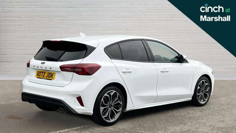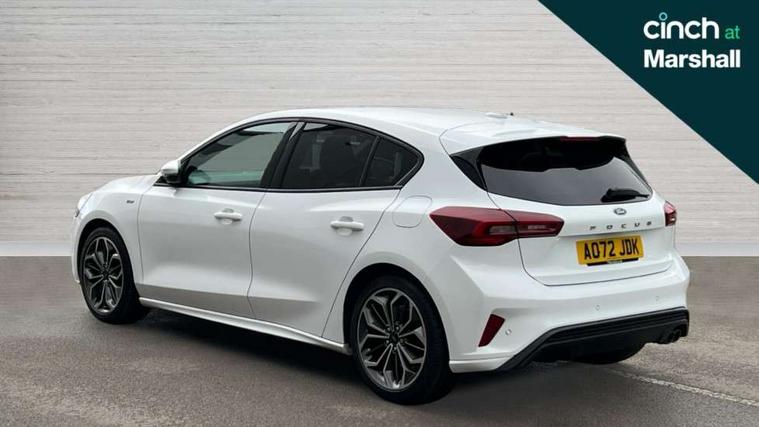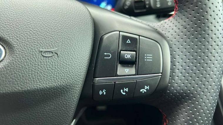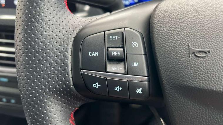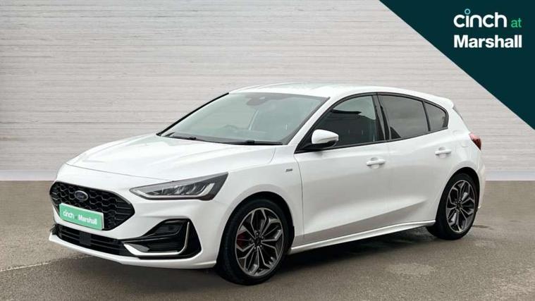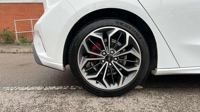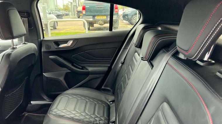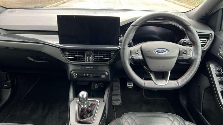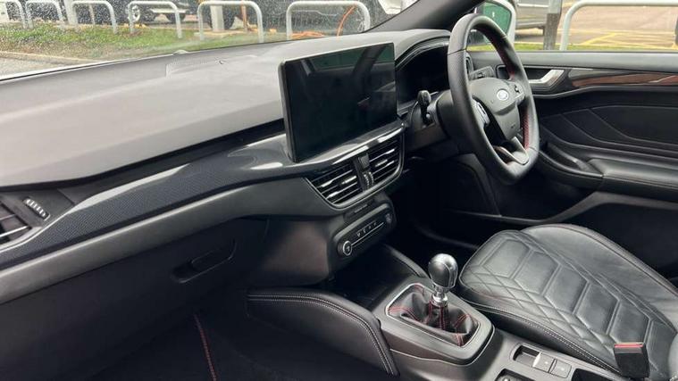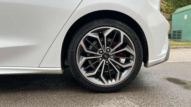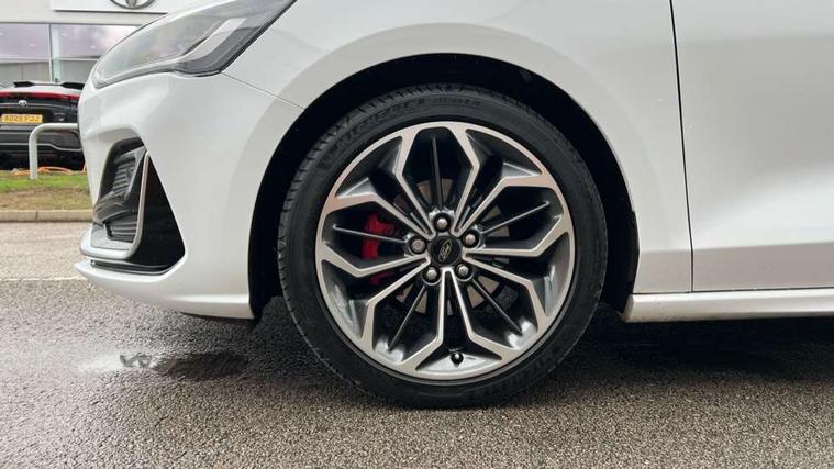 12.3" Digital instrument cluster, Bluetooth system, Digital clock, Easy fuel capless refuelling system, Eco mode, Ford SYNC4 Nav with 13.2'' touchscreen, DAB, Emergency Assistance, Apple Carplay & Android Auto, B&O Premium Audio with 10 speakers, FordPass Connect, Lane keeping system - lane keeping alert and lane keeping aid, PAS, Rev counter, Selectable drive mode, Service interval indicator, Trip computer, Wireless charging pad, Sports tuned suspension, 2 USB ports, Auto headlamps (on/off), Body coloured door handles, Electrically operated front and rear windows with one touch opening and closing, Electrically operated heated power fold door mirrors with puddle lamp with side indicators, Front variable intermittent wipers with electric wash, Heated rear window, LED daytime running lamp, LED rear lamps, LED third brake light, Polished twin tailpipe, Privacy glass, Quickclear heated windscreen, Rain sensor, Rear side wing doors, Tailgate wash/wipe, Unique ST-Line grille, full bodystyling kit, and large body coloured rear spoiler, 3 rear headrests, 3 seat bench in 2nd row, Dual zone electronic air temperature control, Full sensico premium upholstery, Height adjustable front headrests, Isofix child seat preparation, Load through ski hatch, Manual 4-way passenger seat adjusts, Power 4-way driver seat adjust, with power lumbar adjust, Reach + rake adjustable steering column, Single front passenger seat, Winter pack - Focus, 3x3 point rear seatbelts, ABS+Electronic Brake force Distribution, Auto hold function, Driver airbag, EDL traction control, Electronic parking brake, Electronic stability control, Front and rear seatbelt reminder, Front inertia reel height adjustable seatbelts with pre-tensioners, Front passenger airbag, Front side airbags, Passenger airbag deactivate switch, Post collision braking, Pre collision assist with autonomous emergency braking and pedestrian/cyclist detection, Red brake calipers, Remote/power child rear door locks, Side curtain airbags, Three rear inertia reel lap/diagonal seatbelts, Tyre pressure monitoring system, Keyless entry and keyless start, MyKey system, Remote central locking & engine immobiliser, Thatcham alarm with power door dead locks, 18" 5x3 spoke pearl grey high gloss machined finish alloy wheels with mini spare wheel,