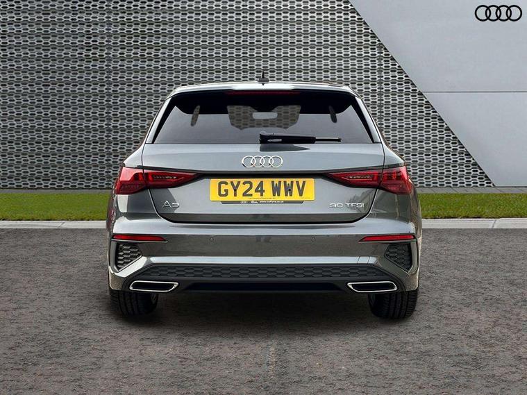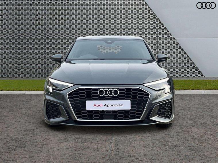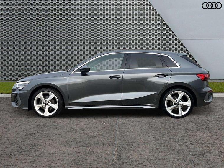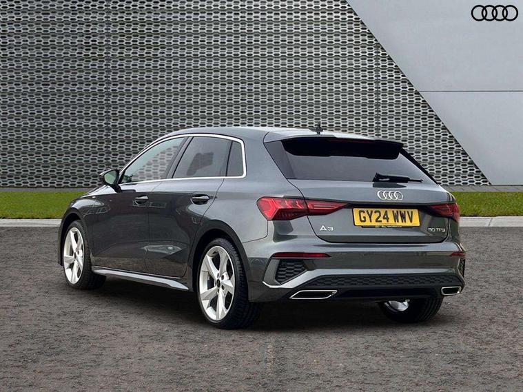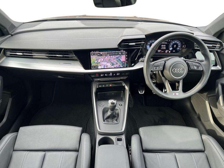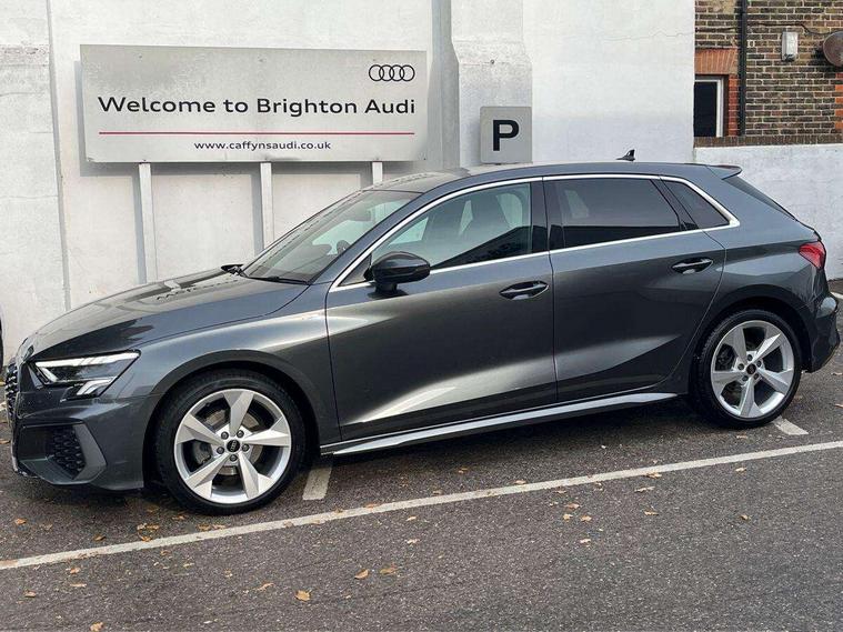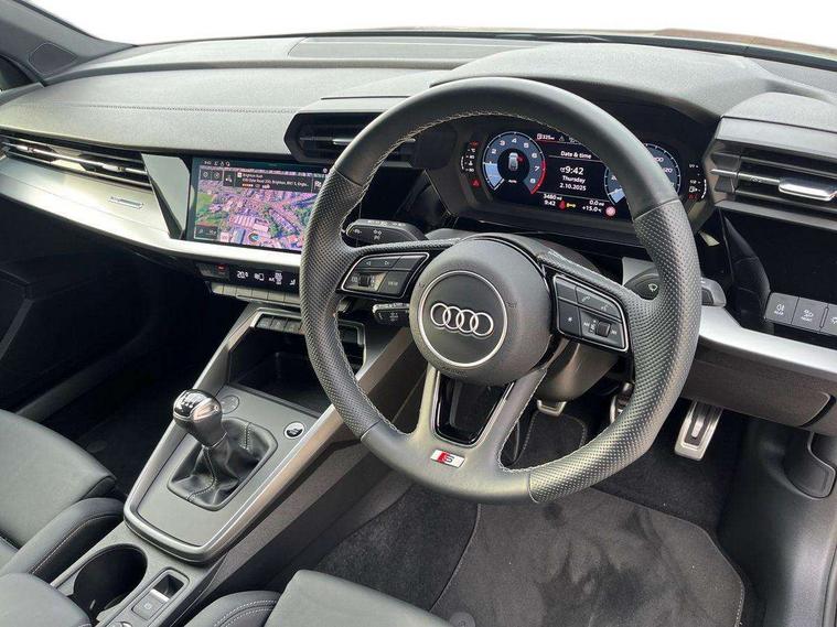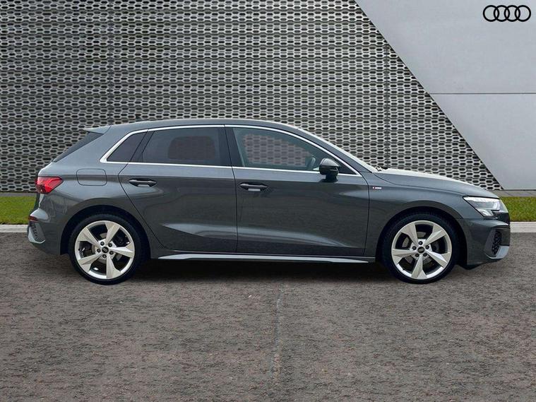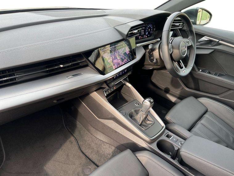 Audi drive select (Auto, Comfort, Dynamic and Individual), Audi smartphone interface, Audi Virtual Cockpit - 10.25" digital and colour instrument cluster, Automatic start/stop system with recuperation, Bluetooth interface, Camera based traffic sign recognition, Collision avoidance assistant, Cruise control, e-Call (emergency call), Electromechanical power speed sensitive steering, Lane departure warning system, MMI Navigation Plus with high resolution 10.1" colour touch screen display, Rear parking sensors, Service indicator, Trip computer, Voice control system with natural language interaction, Sports suspension, 2xUSB-C connection with data and charging functions, 6 passive loudspeakers, DAB Digital radio, 3rd brake light, Acoustic glass windscreen, Aluminium window trim, Auto dimming frameless rear view mirror, Body colour exterior mirrors, Electrically adjustable/heated/folding/auto dimming door mirrors with integrated LED indications + kerb view function for passenger side, Front electric windows, Illuminated door sills with aluminium inserts at the front with S logo, LED daytime running lights, LED headlights with LED rear lights and dynamic rear indicators, Light and rain sensors, Privacy glass - dark tinted rear window, rear door and side windows, Rear electric windows, Rear side air outlets in grained matt black, Rear side wing doors, Rear wiper, S line bumpers, S roof spoiler, 12V socket and storage compartment in front centre console, 3 seat bench in 2nd row, 3 spoke leather multifunction steering wheel, 4 way electrically adjustable lumbar support for driver and front passenger, 60/40 split folding rear seat bench, Black cloth headlining, Dual zone electronic climate control, Front and rear centre armrest in artificial leather, Front and rear headrests, Front/rear floor mats, Height and reach adjustable steering wheel, Interior lighting - glove compartment light and right hand side, Luggage compartment floor covering, Manual boot compartment lid, Manually adjustable front seats, Seat side bolsters, Single front passenger seat, Stainless steel pedals and front footrest in black, Twin leather upholstery with front sports seats S embossed logo, Aluminium interior elements pack - A3 Sportback, LED interior lighting pack - A3 Sportback, S line styling pack - A3 Sportback, 3x3 point rear seat belts, Driver and front passenger airbag with passenger airbag deactivation, Electronic Stabilisation Control (ESC) including ABS, ASR and EDL, First aid kit with warning triangle and 2 safety vests, Front side airbags with head airbags and interaction airbag, Pre-sense front with pedestrian and cyclist detection, Seatbelt monitoring, Tyre pressure loss indicator, Anti theft alarm, Anti-theft wheel bolts, Electronically operated child locks, Immobiliser, Remote control central locking, Dark spectrum aluminium inlays, accent surfaces in the dashboard and centre console in platinum grey silk effect paint finish,