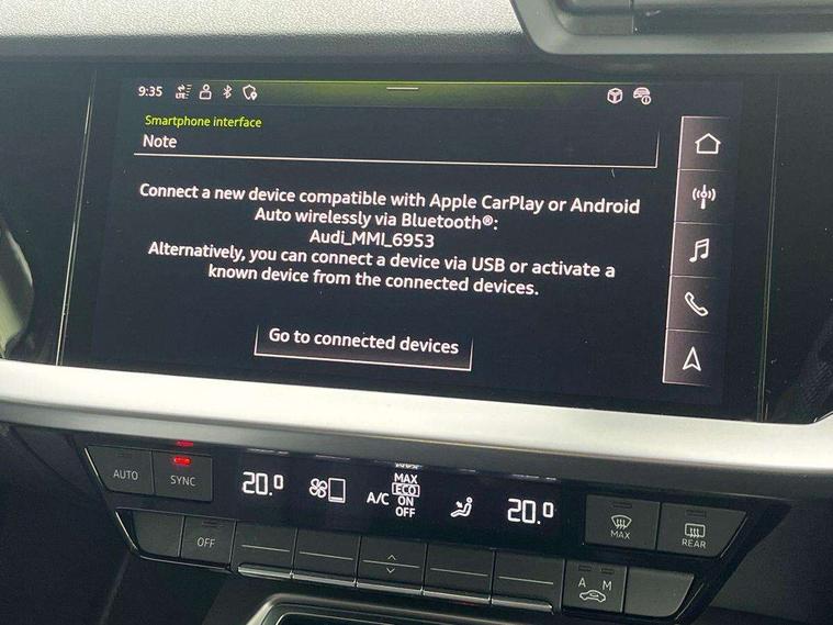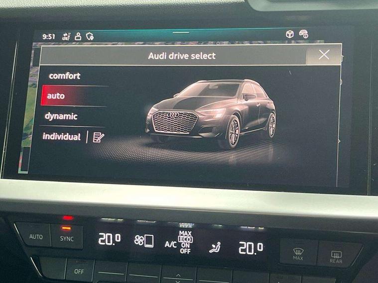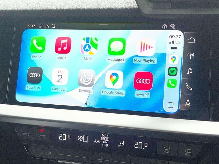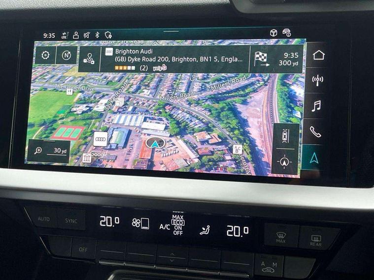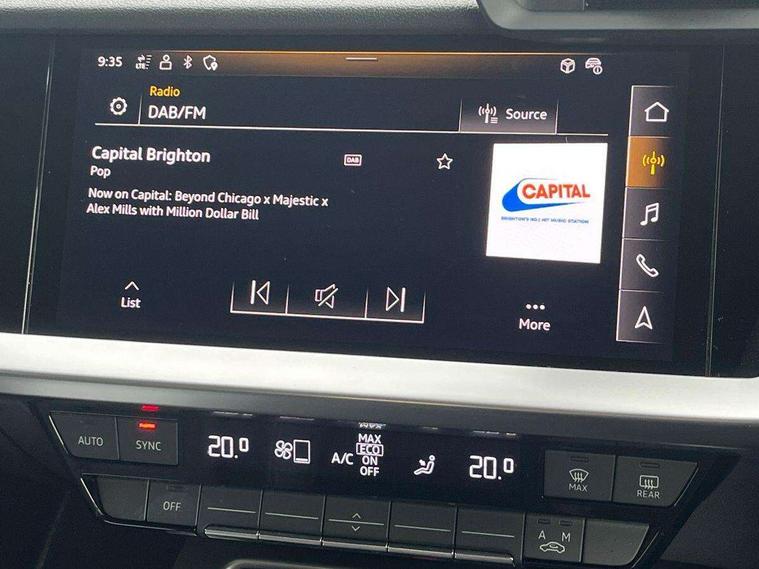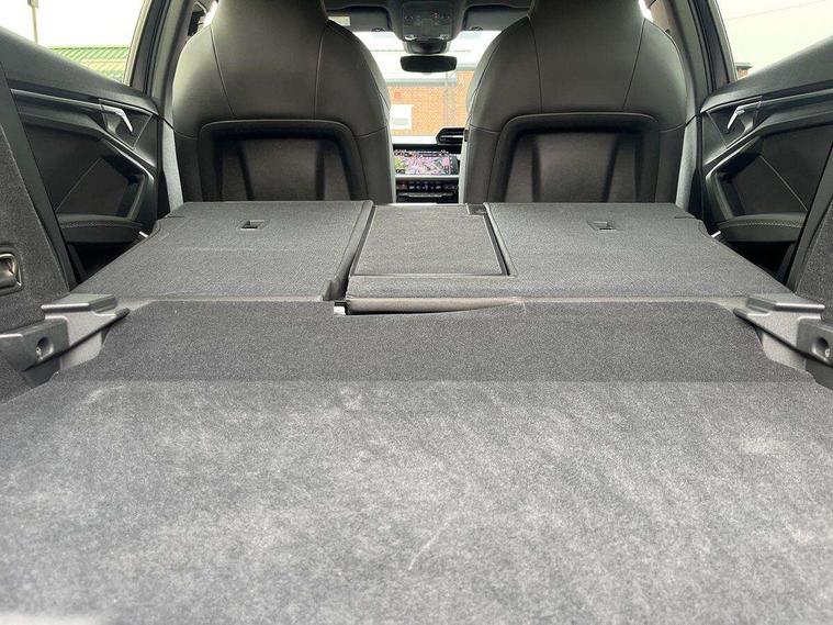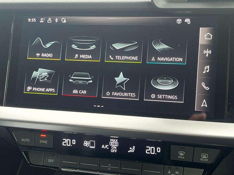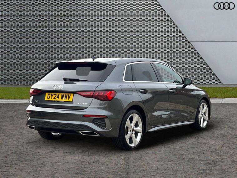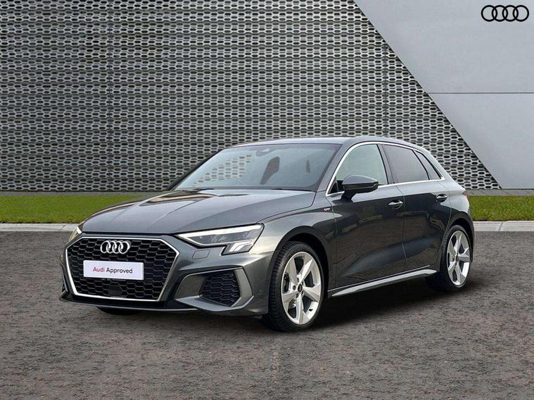 Audi drive select (Auto, Comfort, Dynamic and Individual), Audi smartphone interface, Audi Virtual Cockpit - 10.25" digital and colour instrument cluster, Automatic start/stop system with recuperation, Bluetooth interface, Camera based traffic sign recognition, Collision avoidance assistant, Cruise control, e-Call (emergency call), Electromechanical power speed sensitive steering, Lane departure warning system, MMI Navigation Plus with high resolution 10.1" colour touch screen display, Rear parking sensors, Service indicator, Trip computer, Voice control system with natural language interaction, Sports suspension, 2xUSB-C connection with data and charging functions, 6 passive loudspeakers, DAB Digital radio, 3rd brake light, Acoustic glass windscreen, Aluminium window trim, Auto dimming frameless rear view mirror, Body colour exterior mirrors, Electrically adjustable/heated/folding/auto dimming door mirrors with integrated LED indications + kerb view function for passenger side, Front electric windows, Illuminated door sills with aluminium inserts at the front with S logo, LED daytime running lights, LED headlights with LED rear lights and dynamic rear indicators, Light and rain sensors, Privacy glass - dark tinted rear window, rear door and side windows, Rear electric windows, Rear side air outlets in grained matt black, Rear side wing doors, Rear wiper, S line bumpers, S roof spoiler, 12V socket and storage compartment in front centre console, 3 seat bench in 2nd row, 3 spoke leather multifunction steering wheel, 4 way electrically adjustable lumbar support for driver and front passenger, 60/40 split folding rear seat bench, Black cloth headlining, Dual zone electronic climate control, Front and rear centre armrest in artificial leather, Front and rear headrests, Front/rear floor mats, Height and reach adjustable steering wheel, Interior lighting - glove compartment light and right hand side, Luggage compartment floor covering, Manual boot compartment lid, Manually adjustable front seats, Seat side bolsters, Single front passenger seat, Stainless steel pedals and front footrest in black, Twin leather upholstery with front sports seats S embossed logo, Aluminium interior elements pack - A3 Sportback, LED interior lighting pack - A3 Sportback, S line styling pack - A3 Sportback, 3x3 point rear seat belts, Driver and front passenger airbag with passenger airbag deactivation, Electronic Stabilisation Control (ESC) including ABS, ASR and EDL, First aid kit with warning triangle and 2 safety vests, Front side airbags with head airbags and interaction airbag, Pre-sense front with pedestrian and cyclist detection, Seatbelt monitoring, Tyre pressure loss indicator, Anti theft alarm, Anti-theft wheel bolts, Electronically operated child locks, Immobiliser, Remote control central locking, Dark spectrum aluminium inlays, accent surfaces in the dashboard and centre console in platinum grey silk effect paint finish,