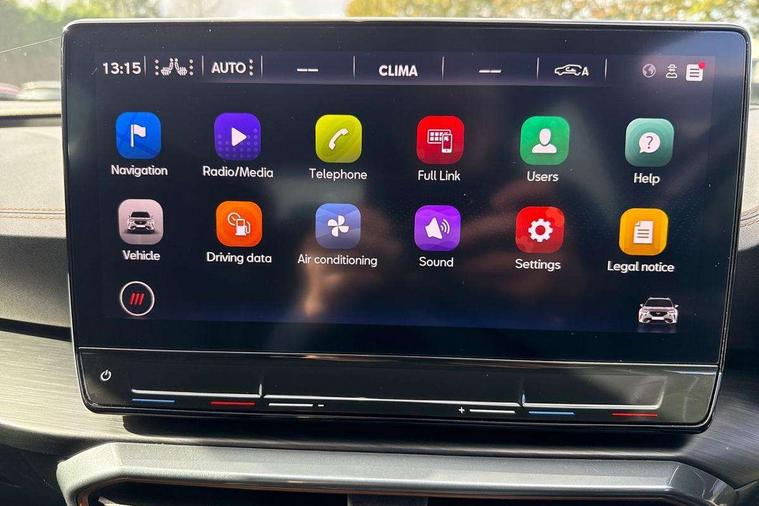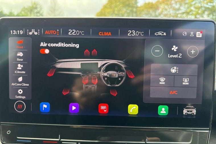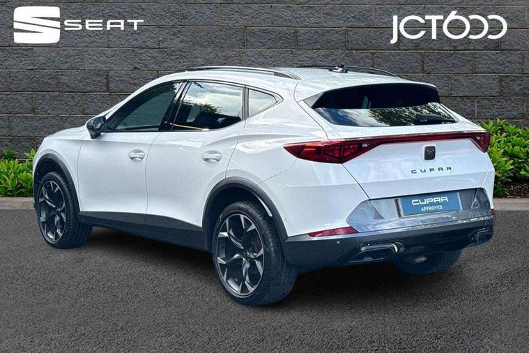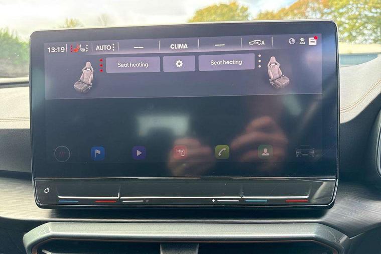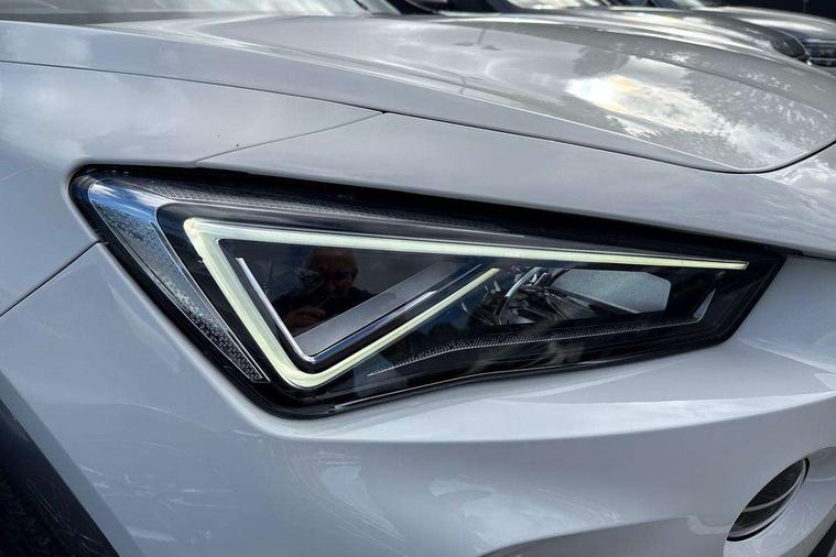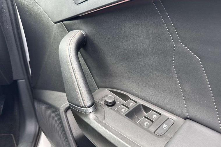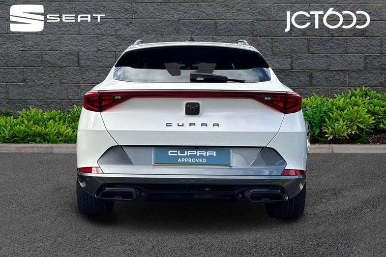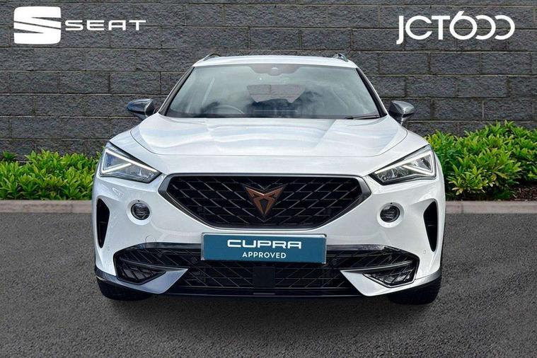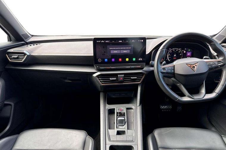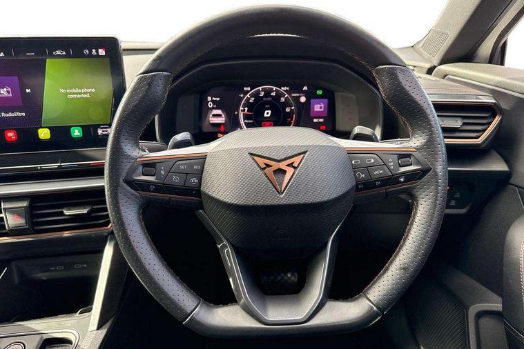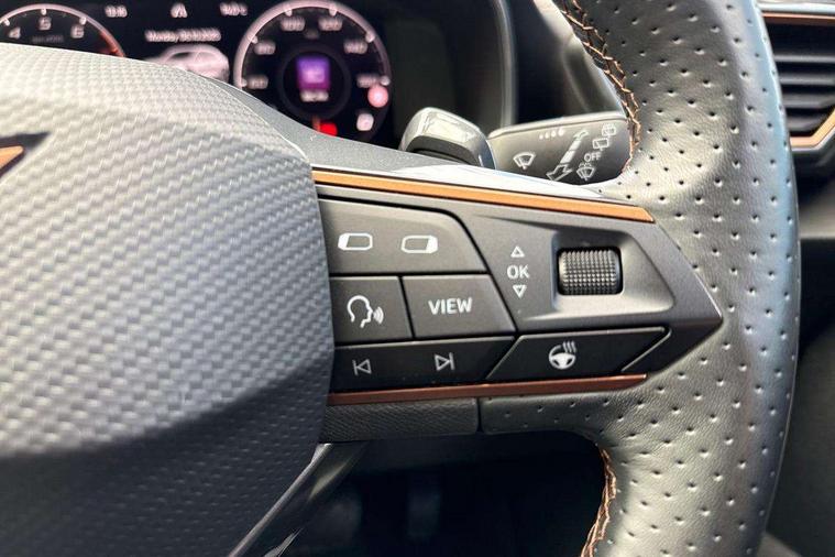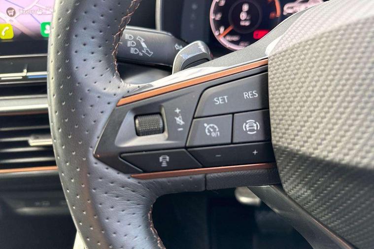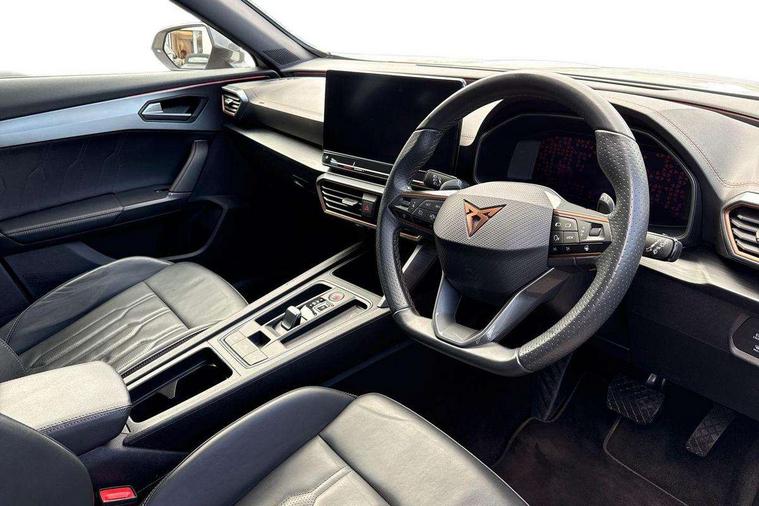 Digital cockpit and configurable dashboard, Driver alert system, Driving profile selection, E-call, Forward collision warning with automatic braking, Lane assist, Navigation system with 12'' Touchscreen Display, Park assist (inc front/rear parking sensors), PAS, Predictive adaptive cruise control with speed limiter, Rear view camera, RPM, trip computer, outside temp gauge, instrument light brightness, low fuel warning light, lights on reminder, gearshift indicator, Service interval indicator, Start/stop system with regenerative braking, Voice control system, Wireless apple carplay, Wireless phone charger, Electronic locking differential and dynamic traction support, Standard suspension, 2 front and 2 rear USB type C sockets, Auxiliary input socket, DAB radio, Auto dimming rear view mirror, Body colour door handles, Body coloured bumpers, Dark grey wing mirror, Daytime running light with automatic headlight control and coming home feature, Dynamic headlight range control, Electric front/rear windows, Electrically adjustable heated and folding door mirrors with memory function, Front fog lamps with cornering function, Gloss black roof rails and window surrounds, LED Headlights, LED Taillights with dynamic indicator, Rain sensing wipers, Rear diffuser with black simulated exhaust pipes, Rear side wing doors, Rear wash/wipe, Third brake light, Tinted rear windows, Welcome lights, 12v power supply in centre console, 12V socket, 12v socket in loadspace, 2 front and 2 rear reading lights, 230V socket, 3 seat bench in 2nd row, 60/40 split rear bench seat with armrest and mechanical seat release, Dust/pollen filter, Front and rear head restraints, Front centre armrest, Height/reach adjust steering wheel, Illuminated interior front door sills, Illuminated sunvisor with mirror, Isofix, Leather multi function heated steering wheel with gear shift paddles, Luggage tie-down hooks, Single front passenger seat, Three zone climate control with control panel in rear, Variable luggage/load compartment floor, Wraparound lighting, Genuine Nappa leather Pack - Cupra, 3 point seatbelts on all rear seats, ABS, Brake control system - ESC and brake booster, Child proof door locks, Driver and front passenger airbags with front passenger airbag de-activation, Electronic parking brake, Front and rear disc brakes, Front side curtain airbags, Hill hold control, Seat belt reminder for front and rear seats, Tyre pressure monitoring system, Anti theft alarm system, Keyless entry and start system (KESSY), Locking wheel bolts, Copper and aluminium interior detailing, 19" 'Exclusive' machined sport matte black and silver alloy wheels,