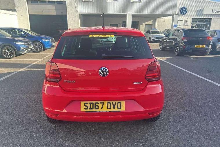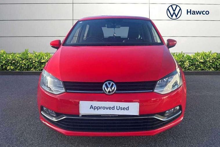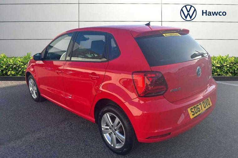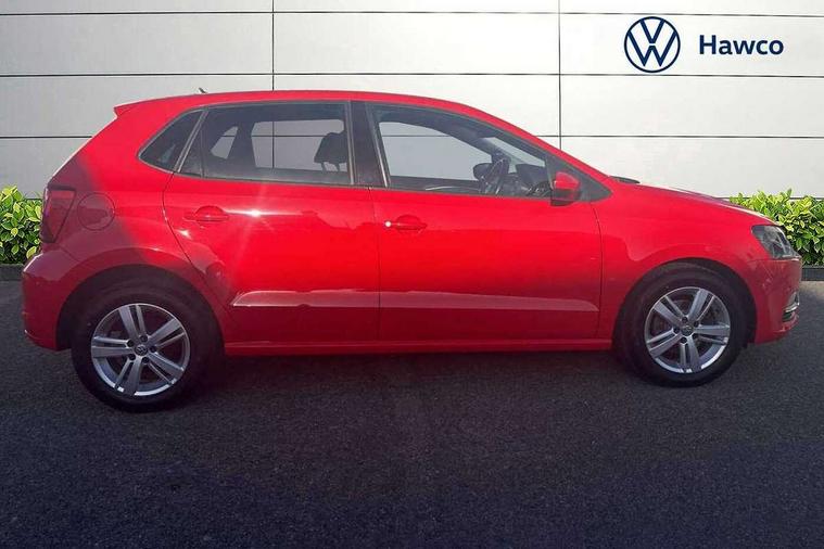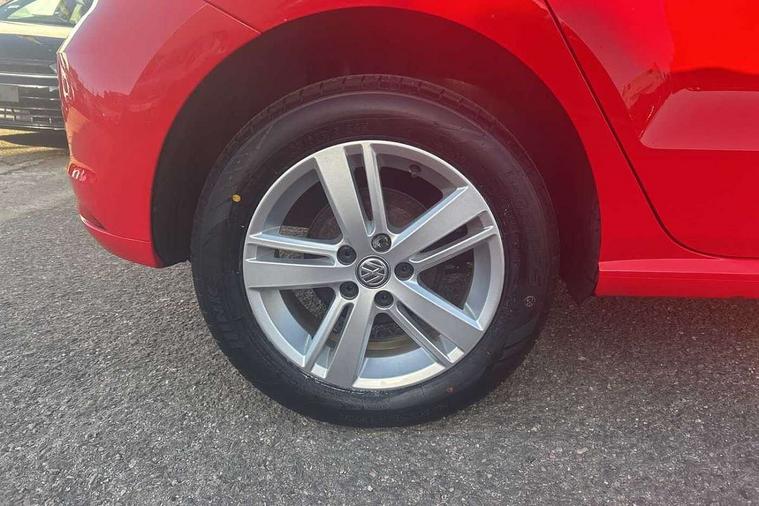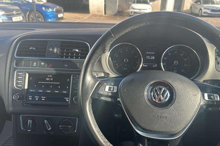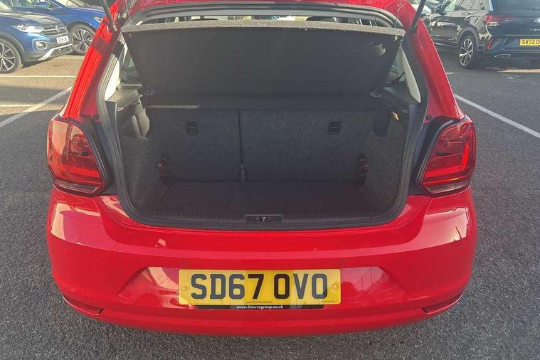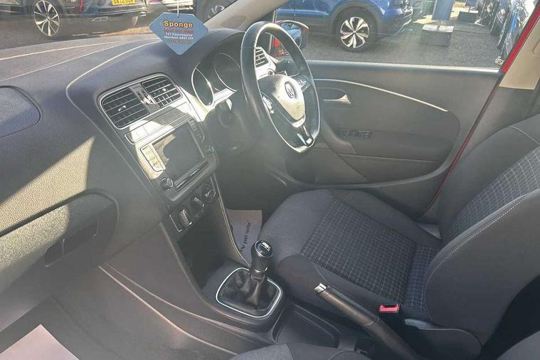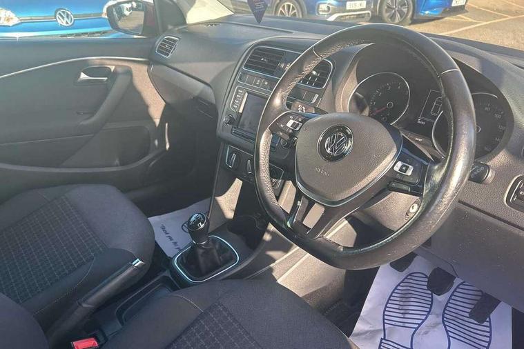 App-Connect, Bluetooth Telephone preparation, Cruise control + speed limiter, Driver alert system, Multi function display, Multifunction computer, PAS - speed related, Service interval indicator, Ultrasonic front and rear optical and audible parking sensors, Warning buzzer and light for front seatbelts unfastened, 6 speakers, Composition media system with radio, glovebox mounted CD, colour touch screen, SD card, aux-in, USB, multimedia interface, DAB Digital radio, Black grille with chrome surround, Body colour bumpers, Body colour door handles, Body colour door mirrors, Body coloured side sills, Chrome trimmed front air intake surrounds, Electric folding door mirrors, Electric front windows, Electric operated/heated door mirrors, Front fog lights with static cornering function, Front wash/wipe with interval delay, Heat insulated tinted glass 65% light absorbing from B pillar back, Heated rear window with auto timer, Rear electric windows, Rear windscreen washer and wiper with interval delay, 12V power socket in centre console, 2 bag hooks in luggage compartment, 2 cupholders, 3 rear head restraints, 3 spoke steering wheel, 4 grab handles, 60/40 split folding rear seat, Centre console storage, Chrome interior door handles, Driver and passenger sunvisors, Driver seat height adjust, Dust/pollen filter, Front door pockets, Front passenger seat height adjust, Front seat backrest storage nets, Front/rear reading lights, Glovebox, Height/reach adjustable steering column, Illuminated vanity mirror, Interior light with delay, Isofix Preparation 2 Rear child seats, Luggage compartment cover, removable, Luggage compartment lighting, Matt chrome gear lever gaiter surround, Multifunction leather steering wheel with leather gear knob/handbrake grip, Storage compartment in front doors, Storage compartment in rear doors, Sunglasses holder, Variable boot floor, Light and sight pack - Polo, 3 point height adj front seatbelts + pretensioners, 3x3 point rear seatbelts, ABS, Automatic post collision braking, Driver/front passenger airbag, Driver/Passenger whiplash optimised head restraints, ESC - Electronic Stability Control + traction control, ESP with EDL + ASR, Hill hold control, Hydraulic Brake Assist (HBA), Tyre pressure monitoring system, Alarm with remote central locking and interior protection, Electronic engine immobiliser, Air vents in Matt chrome, Matt chrome interior trim, 15" steel spare wheel,