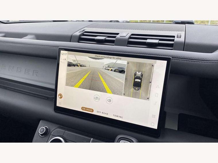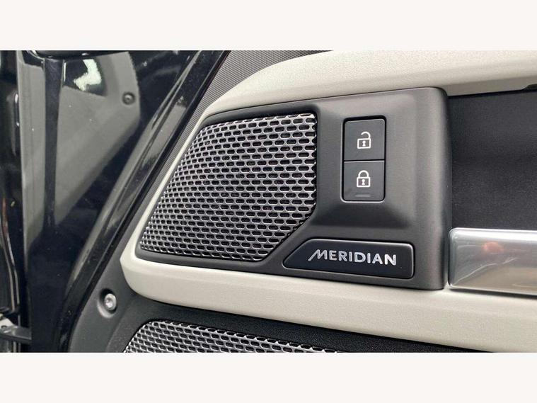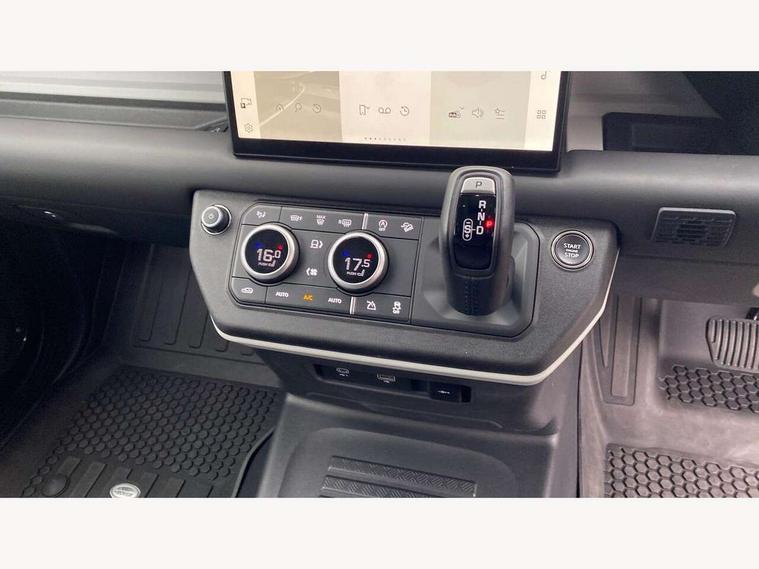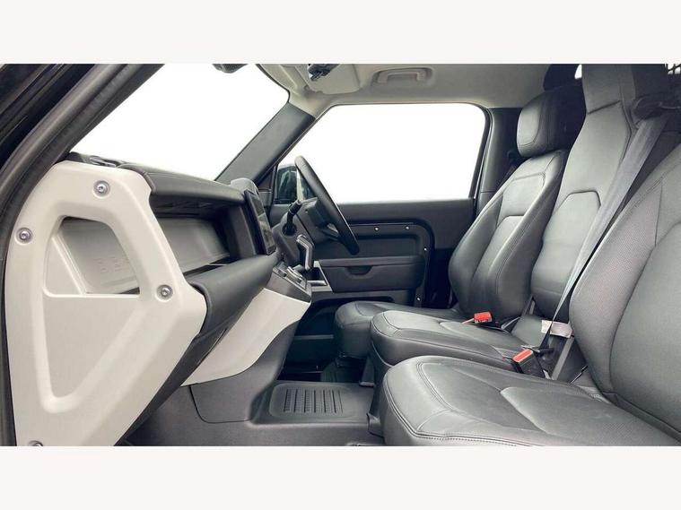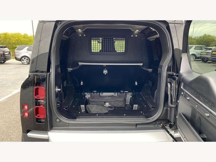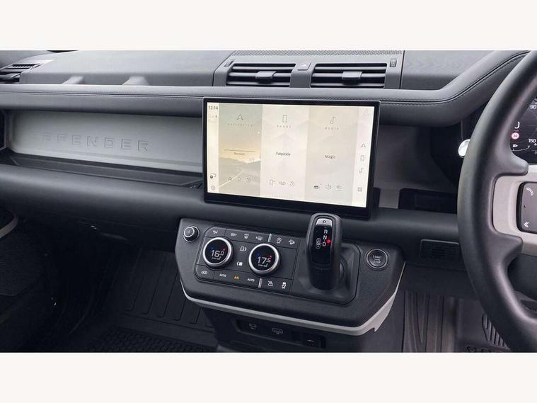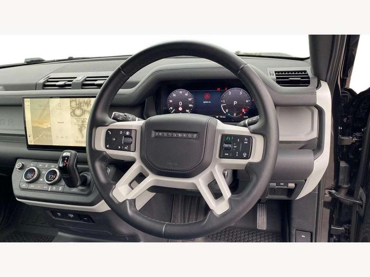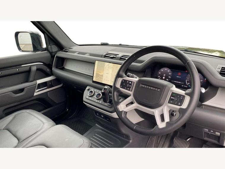Customer Configurable Autolock, 11.4" touchscreen, 360 parking aid, 3D Surround Camera with 360 View, 180 Rear View, Front Traffic Detection, Forward Vehicle Guidance, Tow Hitch Assist and clear sight Ground View, Adaptive cruise control, Blind spot assist, Brake Hold, Driver condition monitor, Electric power assisted steering (EPAS), Lane keep assist, Low traction launch, Pivi pro connected, Rear collision monitor, Rear traffic monitor, Traffic sign recognition adaptive speed limiter, Trip computer, Tyre pressure monitor, Wade Sensing, Android Auto, Apple CarPlay, DAB Radio (Digital Audio Broadcasting), Meridian 280W sound audio system with 7 speakers with subwoofer, Alpine lights, Assisted tailgate, Auto High Beam Assist, Automatic headlight levelling, Automatic headlights and rain sensitive front wipers, Centre high mounted stop light, ClearSight interior rear view mirror, Electric heated/power fold door mirrors with approach lights and auto dimming driver side, Electric windows with one touch open/close and anti-trap, Exterior signage panel, Follow me home lighting, Front fog lights, Heated rear window with timer, Heated windscreen, LED tail light, Privacy glass, Puddle lights, Rear fog lights, Rear wash wiper, Side-hinged tailgate, Standard roof, Standard tread plates, 14 way heated and cooled electric adjustable memory front seats with 4 way manual headrests, Additional lashing points, Dual zone climate control, Durable rubber cabin flooring, Electric adjustable steering column, Footwell lights, Front jump seat and folding front centre armrest, Full height bulkhead behind row 1 seats, Glovebox storage, High sided rubber mats, Loadspace cover, Loadspace hooks, Loadspace rubber mat, Overhead stowage for sunglasses, Rear centre headrest, Rear reading light, Standard seating configuration, Sunvisors with illuminated vanity mirrors, Twin front cupholders with cover, Upgraded loadspace LED lighting, Online pack - Defender with data plan, Brake pad wear indicator, Electronic traction control, Emergency braking, Front airbags, with passenger seat occupant detector, Power operated child locks, Remote for (e-Call, Optimised assistance call, InControl app, Climate, beep and flash and door), Seat belt reminder, Intrusion sensor, Keyless entry system, Locking wheel nuts, 8 speed automatic transmission, ABS and EBA, All wheel drive, CBC - (Cornering brake control), Dynamic stability control, Electronic brake force distribution, Electronic park brake, Gradient acceleration control, Hill Descent Control, Hill start assist, Particulate filter (DPF), Push button start, Roll stability control, Trailer stability assist, Twin speed transfer box (high/low range), Extended leather upgrade,