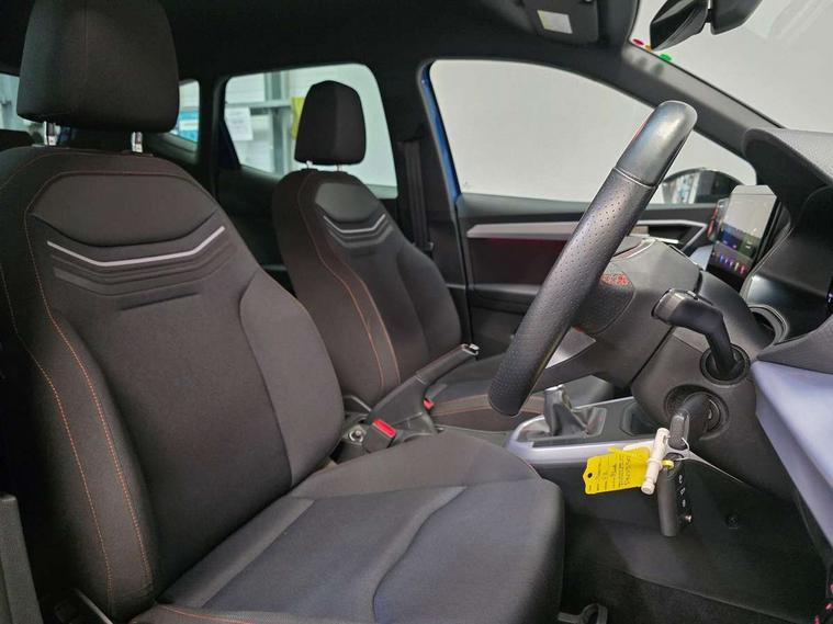 'Lights On' Reminder warning buzzer, 8" Digital cockpit, Digital clock, E-call, Electric speed sensitive power steering, Full Link Smartphone Integration with Mirror Link, Apple Car Play, Google Android Auto with USB Type C cable for Apple and Android compatibility, Lane keeping system, Low fuel warning light, Outside temperature display, Rear parking sensor, RPM counter, Seat connect with safety, service, remote and online, SEAT Drive profile - Four different models normal-sport-eco-individual, steering response, throttle response, Trip computer, Wireless phone charger, 9.2" colour touchscreen with navigation system, voice control and USB port (type c), Bluetooth interface for hands free and audio streaming, DAB digital radio and AM/FM radio, Steering wheel mounted audio controls, Anti theft roof antenna, Auto dimming interior rear view mirror, Automatic activation of hazard warning lights, Body coloured bumpers, Body coloured door handle inserts, Chrome roof rails and window surrounds, Dark tinted rear windows, Electric front/rear windows, Electrically adjustable, heated and folding door mirrors, Front fog lights with cornering function and rear fog light, FULL LED automatic headlights with dynamic headlight range control, coming and leaving home, LED daytime running lights, LED rear tail lights and licence plate lights, Protective side mouldings, Rain sensing wipers, Rear side wing doors, Rear spoiler, Rear window wash/wipe, Roof colour door mirrors, Third brake light, Twin exhaust pipe styling hidden exhaust pipe, Visible VIN plate, Windshield wiper with intermittent control and potentiometer, 2 cupholders, 3 seat bench in 2nd row, 60/40 split folding rear seat, Aircare filter, Black interior roof, Cloth upholstery, Double boot floor, Driver sunvisor with covered mirror + card holder, Dual zone climate control, Front courtesy light with front reading lights, Front sport seats, Gear shift indicator, Height adjustable front seats, Height/reach adjustable steering column, Illuminated boot, Instrument lighting with brightness control, Interior ambient lighting, Interior light in footwell, central console and door panel, ISOFIX points in outer rear seats with top tether anchorage points, Passenger sunvisor with vanity mirror, Perforated flat bottomed leather steering wheel/gear knob/handbrake with red stitching and FR logo, Single front passenger seat, Two front and three rear height adjustable headrests, Interior chrome pack - Arona, 3 point seatbelts on all rear seats, ABS, Active front headrests, Child locks on rear doors, Driver and front passenger airbags with front passenger airbag de activation, front side and curtain airbags, Electronic stability control, Emergency Brake Assist (EBA) and front assist, Front and rear seatbelt reminder, Hill hold control, Multi-Collision braking, Tiredness recognition system, Traction control, Tyre pressure monitoring system, Alarm with back-up horn, Electronic engine immobiliser, Locking wheel bolts, Remote central locking + deadlocks, Tow away protection, Titan black dashboard, 17" Dynamic alloy wheels,